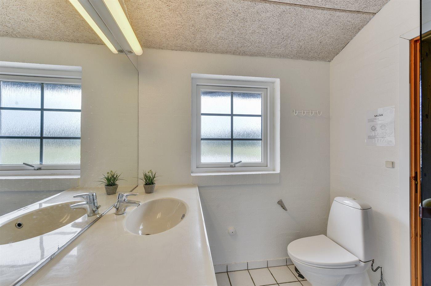Der er 2 badeværelser med bruseniche og 2 toiletter. Der er gulvvarme på 2 badeværelser. I saunaen er der mulighed for afslapning.