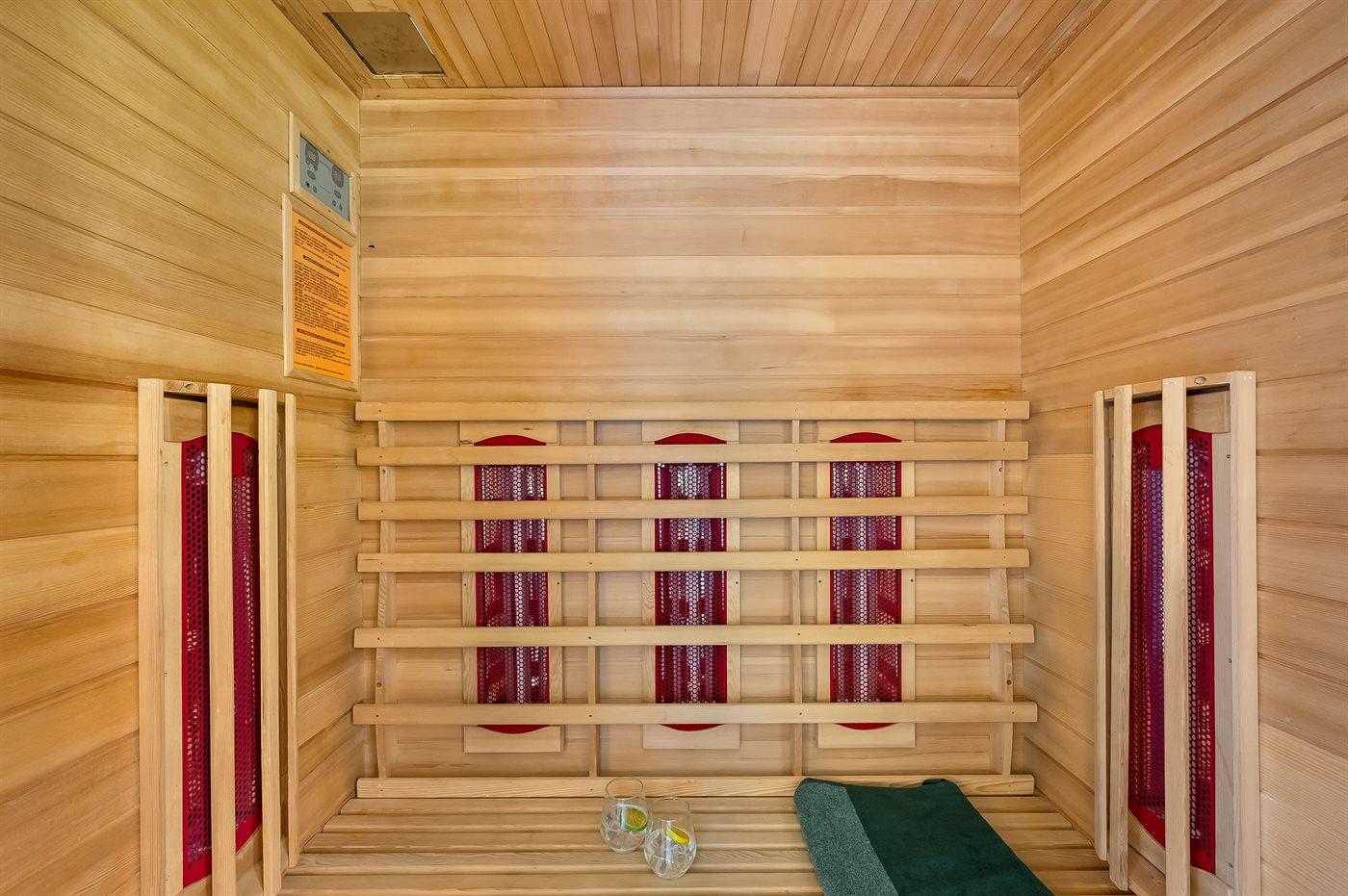 Der er 2 badeværelser med bruseniche og 2 toiletter. Der er gulvvarme på 2 badeværelser. I saunaen er der mulighed for afslapning.
