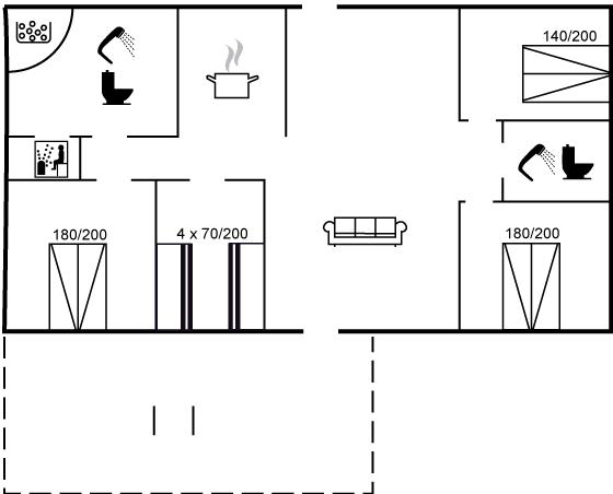 Der er i alt 4 soveværelser. Sovepladserne fordeler sig på: 6 sovepladser i dobbeltsenge. 4 sovepladser i køjesenge. Derudover er der 1 stk. barneseng.
