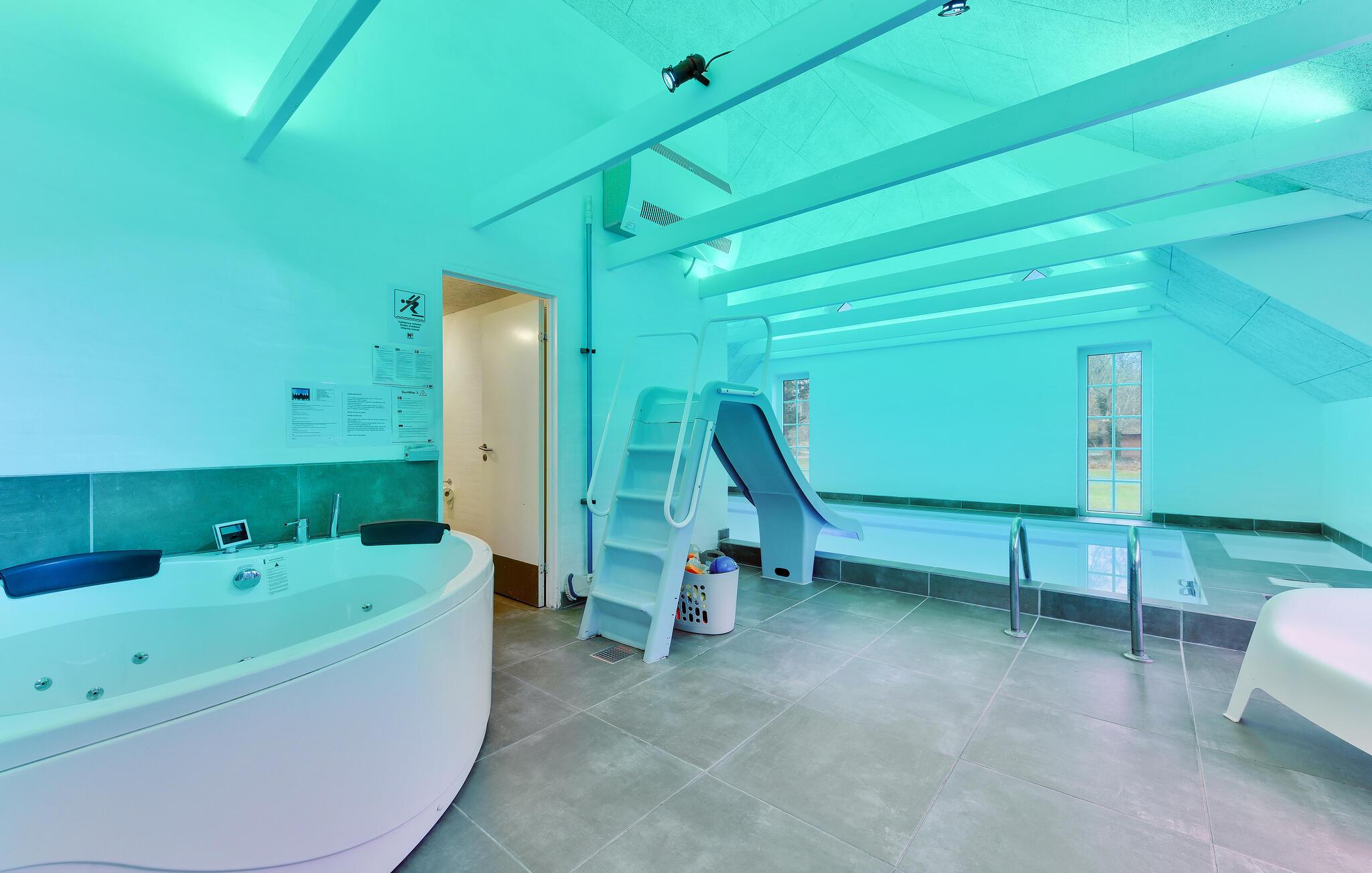 Her får I nemlig, foruden de mange kvadratmeter, alskens muligheder for aktiviteter, så ingen kommer til at kede sig. Huset er flot indrettet med store fællesrum og et moderne og veludstyret køkken, så familiens kokke kan tilberede den store middag til hele flokken. Husets perle er dog den store pool-afdeling, hvor I kan sætte jeres yndlingsmusik på anlægget og tilpasse lyset i forskellige farver og nuancer til den stemning, I ønsker. Lad børnene plaske rundt i den lave ende af poolen, mens de voksne kan tage den lidt mere med ro i spabadet eller i saunaen, måske endda med en god drink. Senere kan I runde aftenen af i stuen med brætspil ved den knitrende brændeovn, udfordre hinanden til et slag pool, se en god film... Det er helt op til jer.