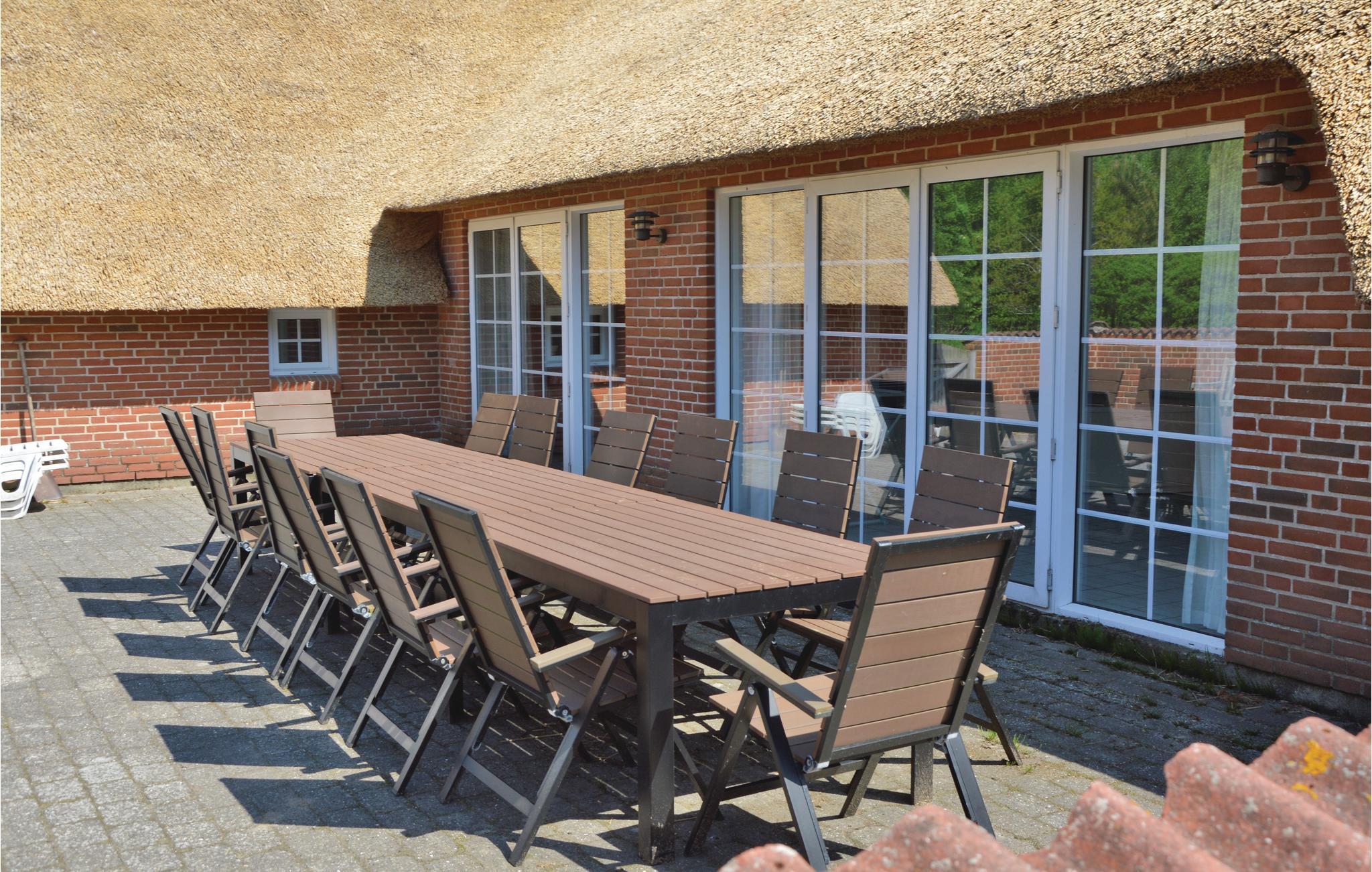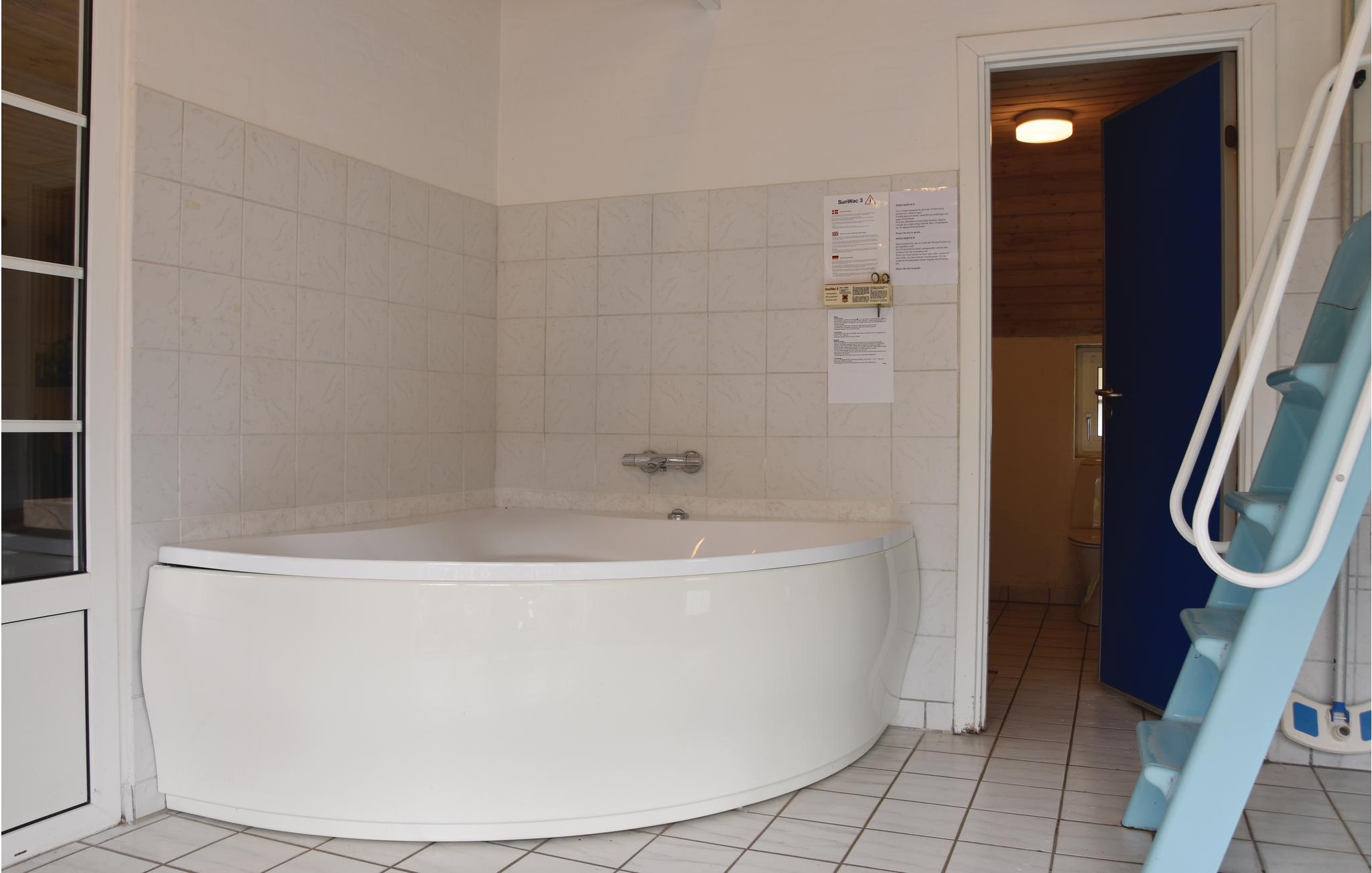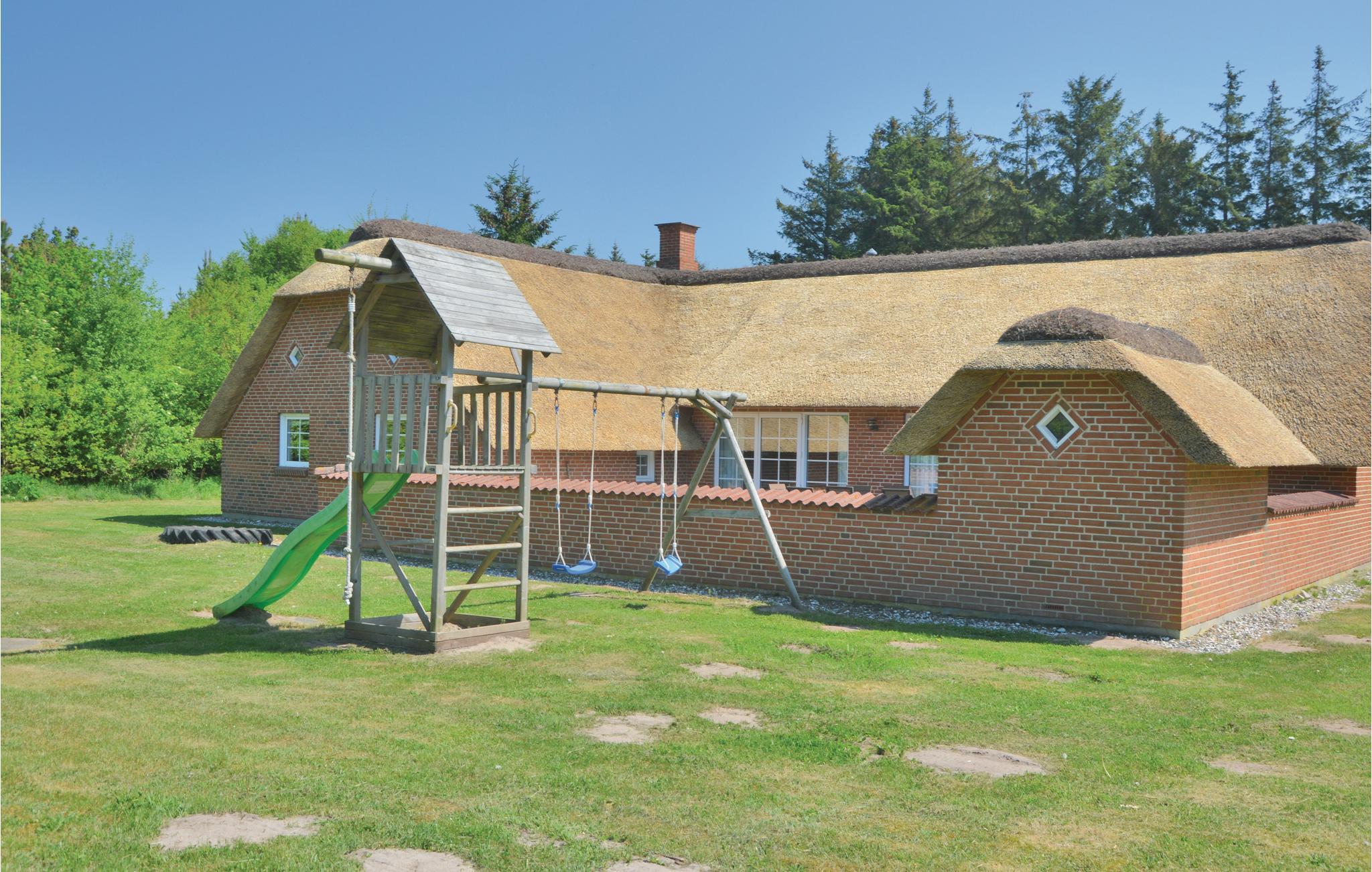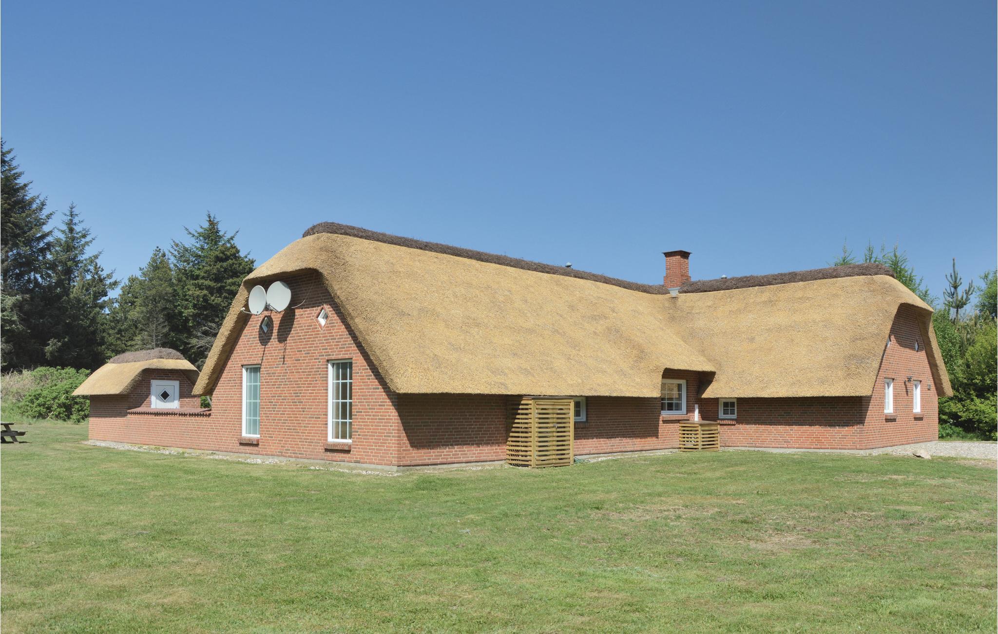 Dette skønne sommerhus ligger på en plantagegrund med gode muligheder for at finde læ. Hvis vejret tillader det, kan I nyde udendørslivet i den lukkede, vestvendte gård. Ellers er der rige muligheder for aktiviteter indendørs, hvor der bl.a. er en vådafdeling med en 18 m2 stor swimmingpool med vandrutsjebane og en lille børnepool. Efter svømmeturen kan I slappe af i spabadet eller saunaen. Efter opholdet i vådafdelingen kan I hygge jer i opholdsstuen med en god film. Huset er velegnet til flere familier, da der er seks soverum og tre badeværelser. Den funktionelt indrettede køkkenafdeling indeholder alle former for tekniske hjælpemidler.