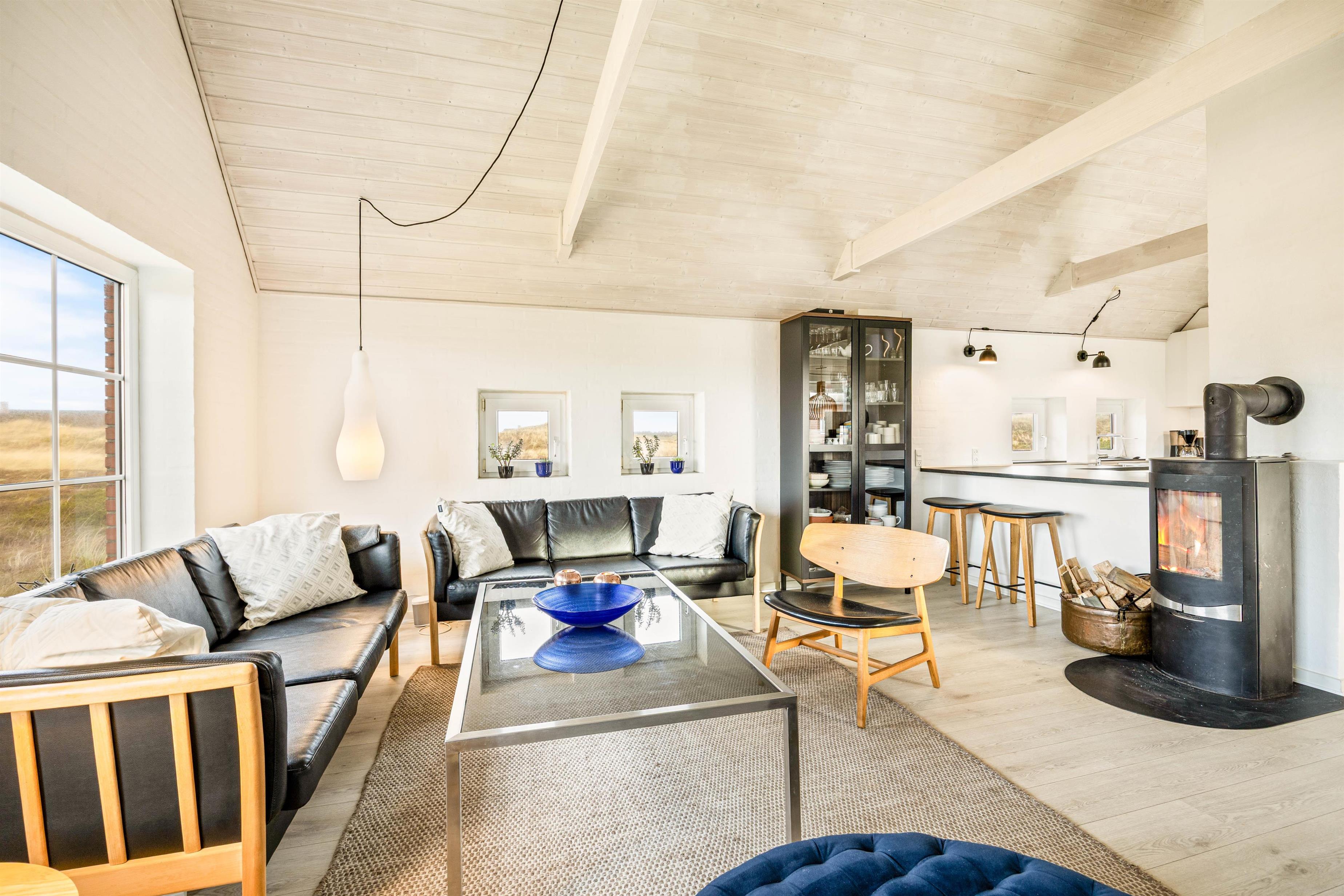 Opholdsrummet er det perfekte sted at samles til hyggelige feriestunder med madlavning, spil og film – alt sammen med panoramaudsigt over landskabet. Her kan I også tænde op i brændeovnen, der fuldender den gode feriestemning. Fra opholdsrummet kan I desuden kravle op på en hems, der uden tvivl vil være et hit hos børnene