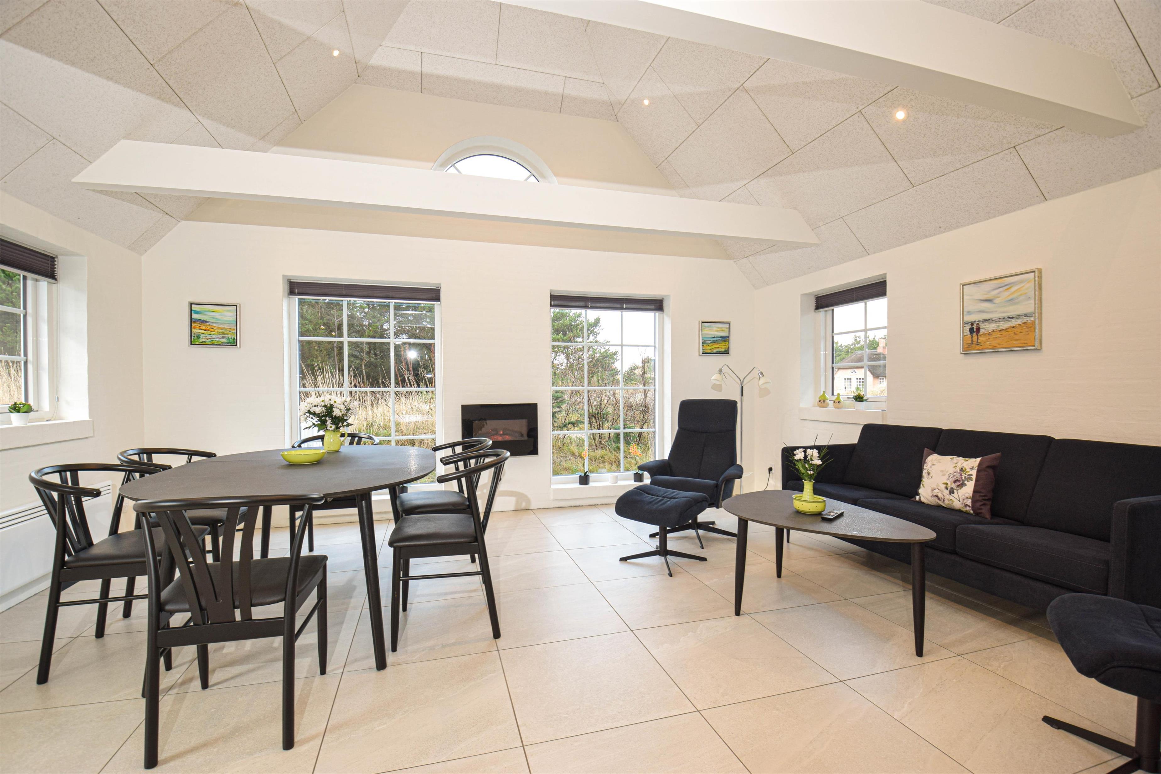 Stue med spiseplads, sofagruppe, elpejs og store vinduer mod vest