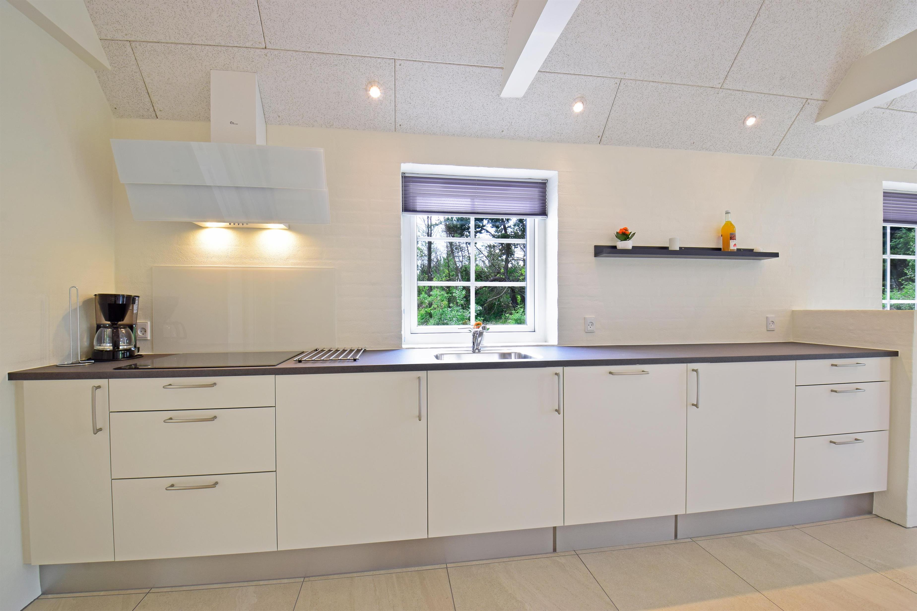 De store vinduespartier mod vest sikrer et skønt lysindfald og en flot udsigt over naturen, mens lofterne til kip giver rummelighed og luft i stue og køkken.