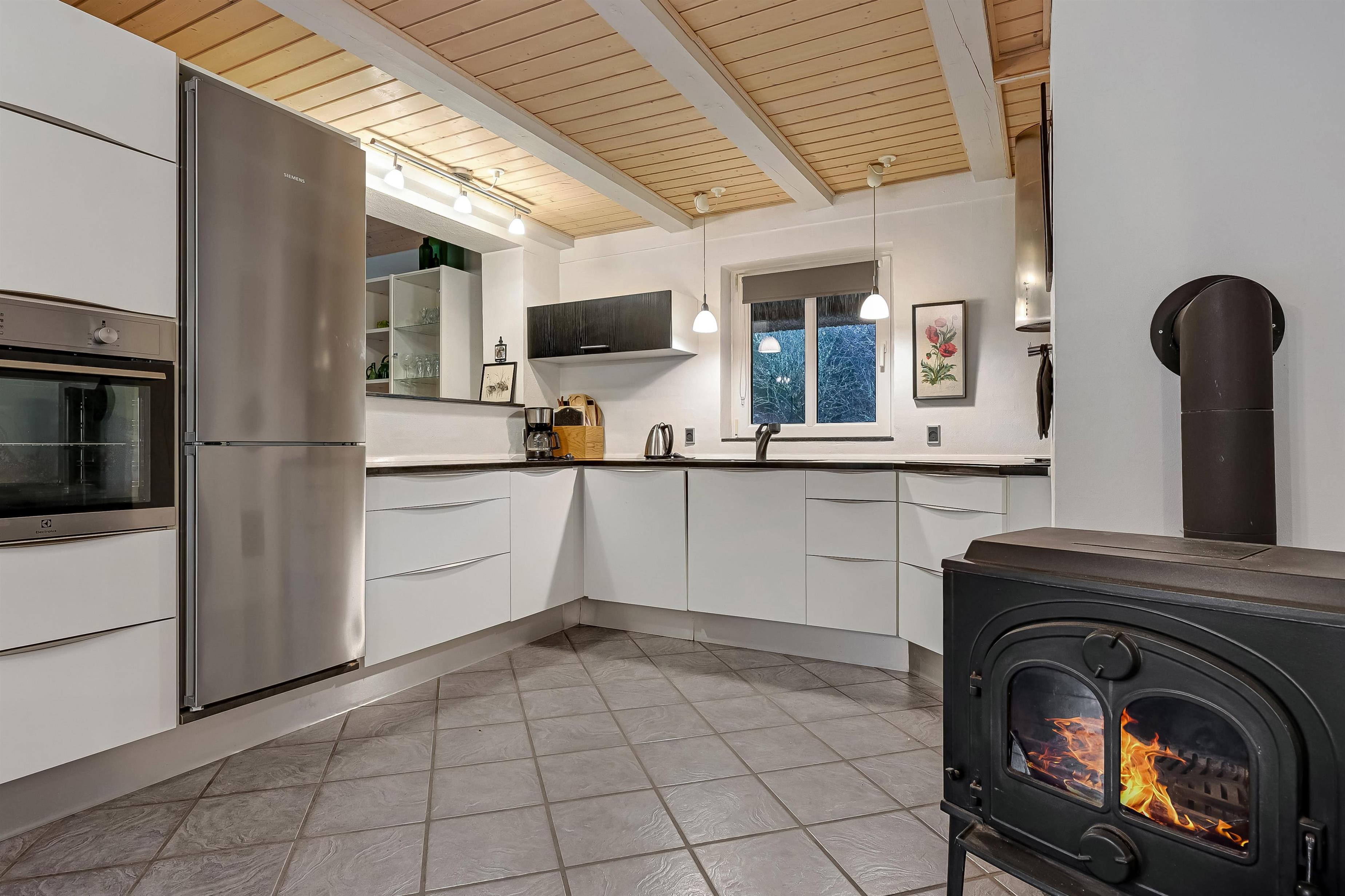 I den store køkken-/stueafdeling er der brændeovn, klinkegulve med gulvvarme og god plads til samvær.