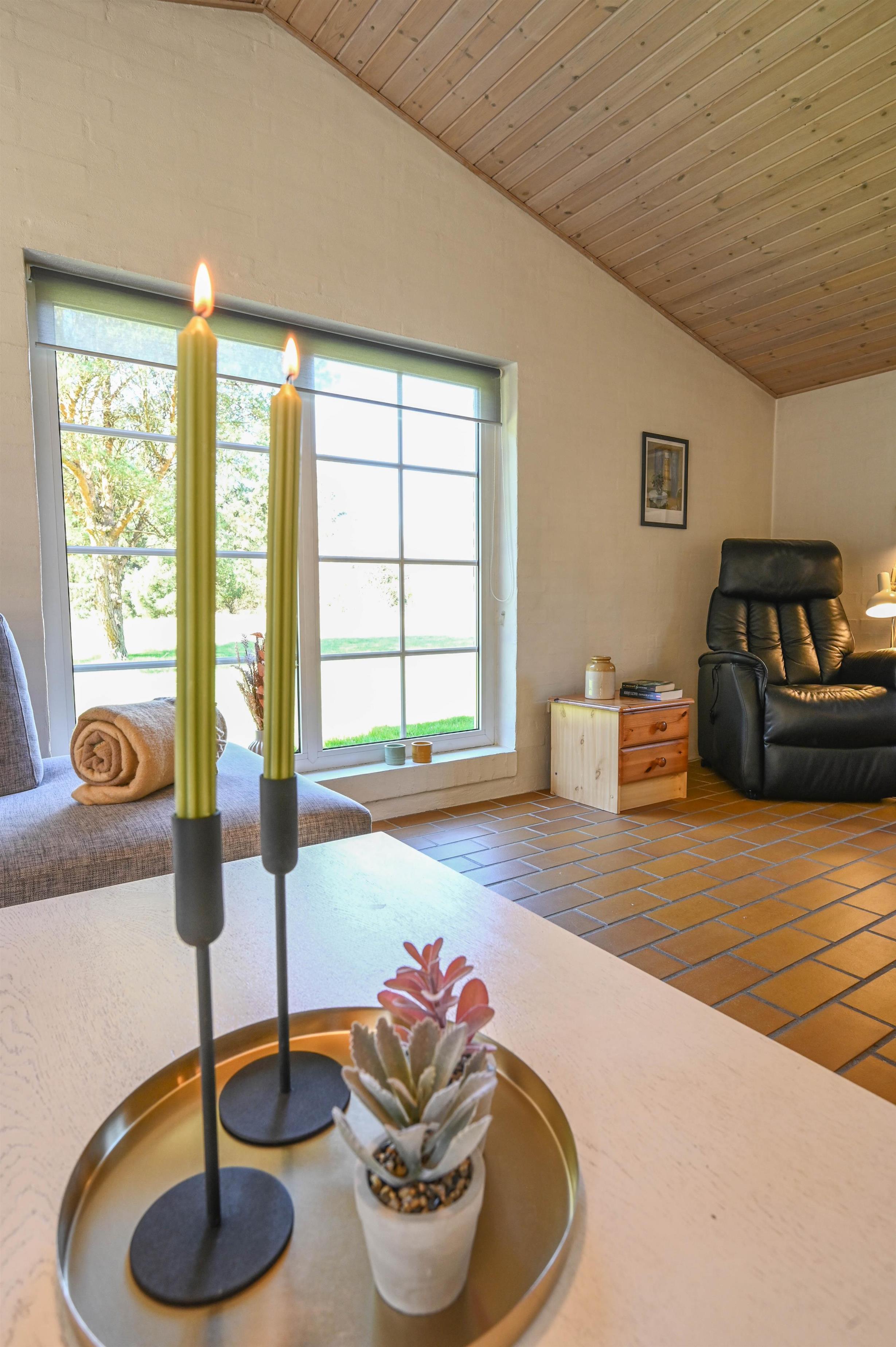 I stuen sørger brændeovnen for varme og hygge på de kølige dage – et oplagt sted at samles efter en lang dag i naturen.