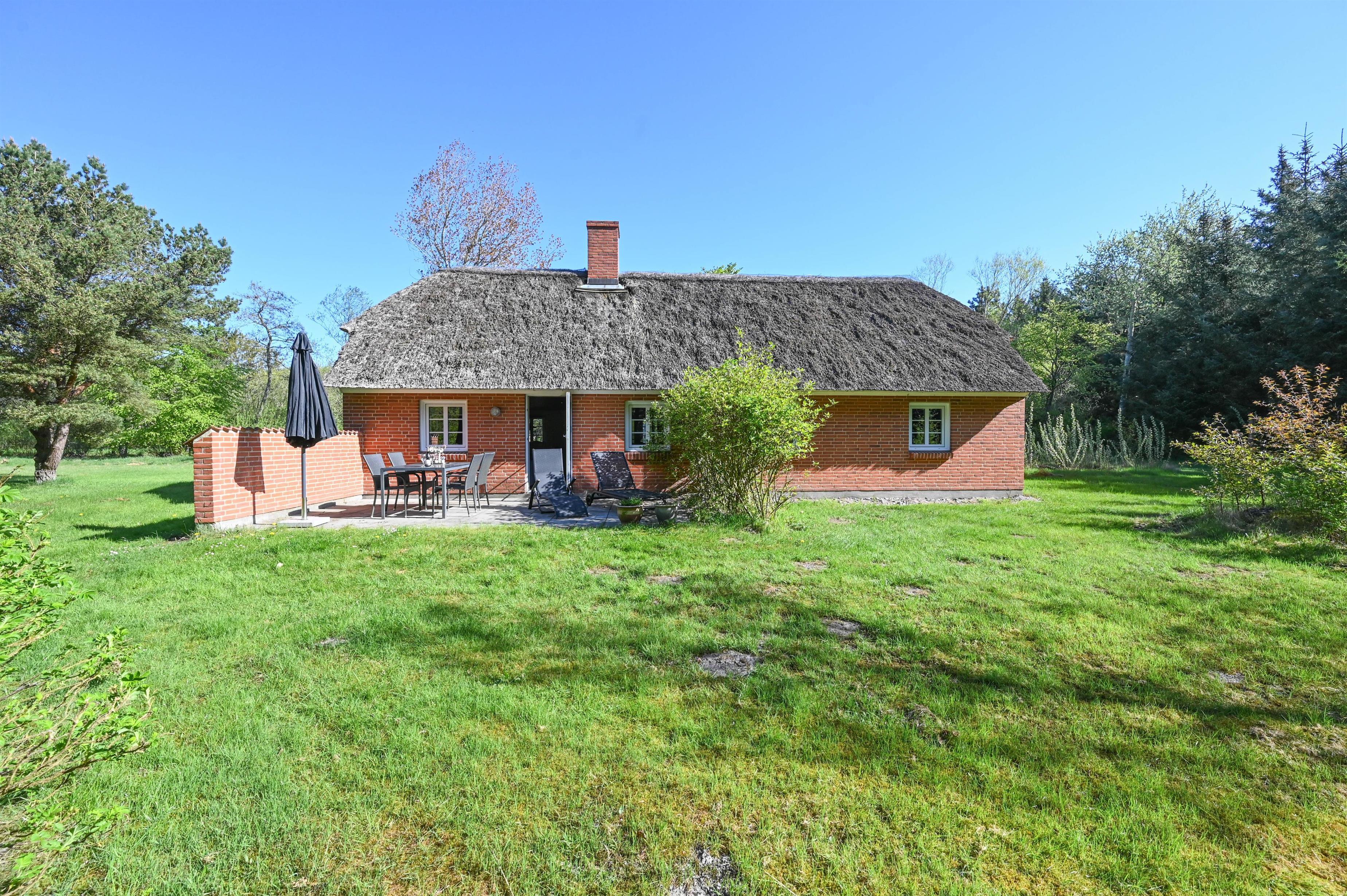 Et charmerende og velholdt feriehus med klassisk stråtag og en skøn beliggenhed tæt på både skov og hav.
