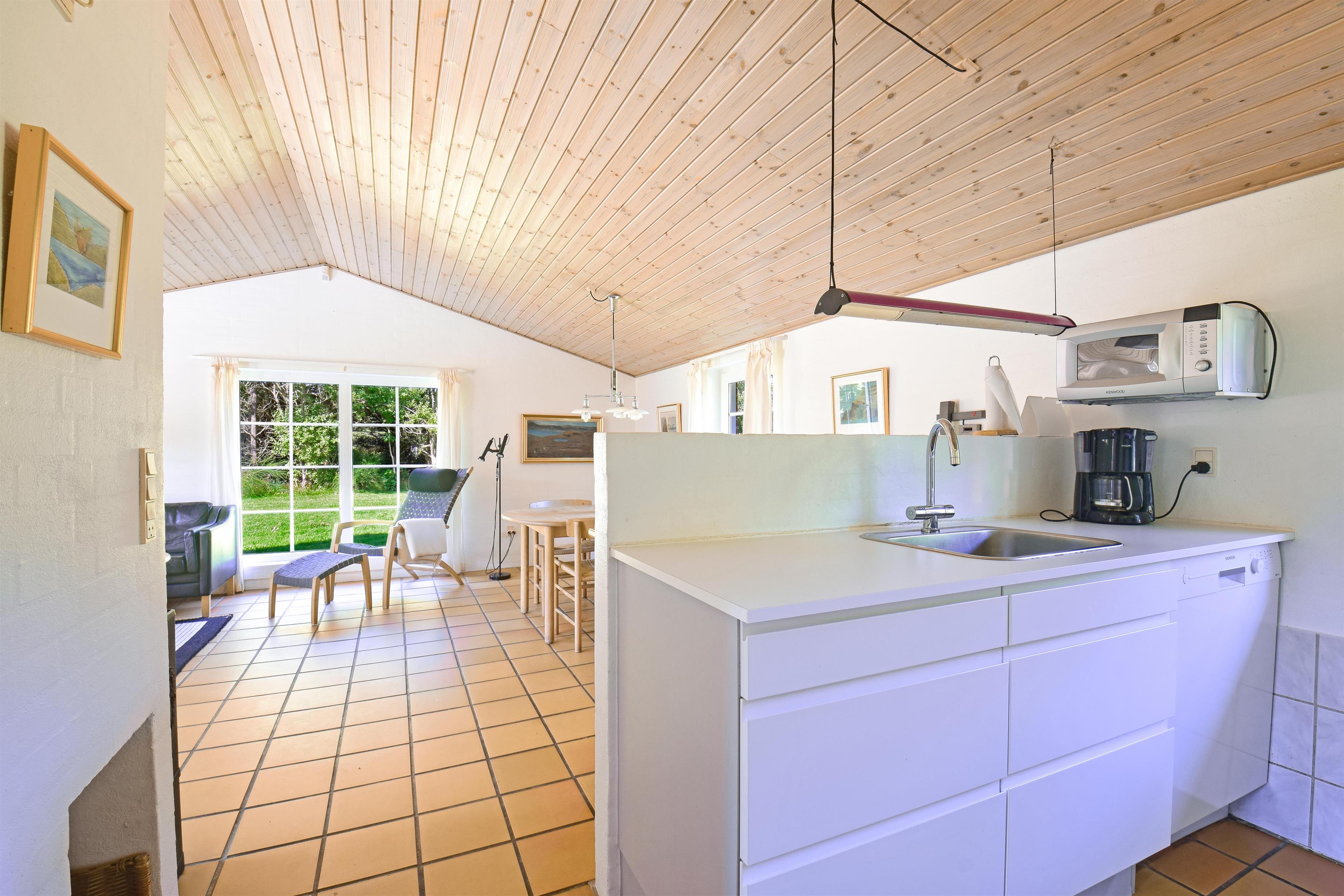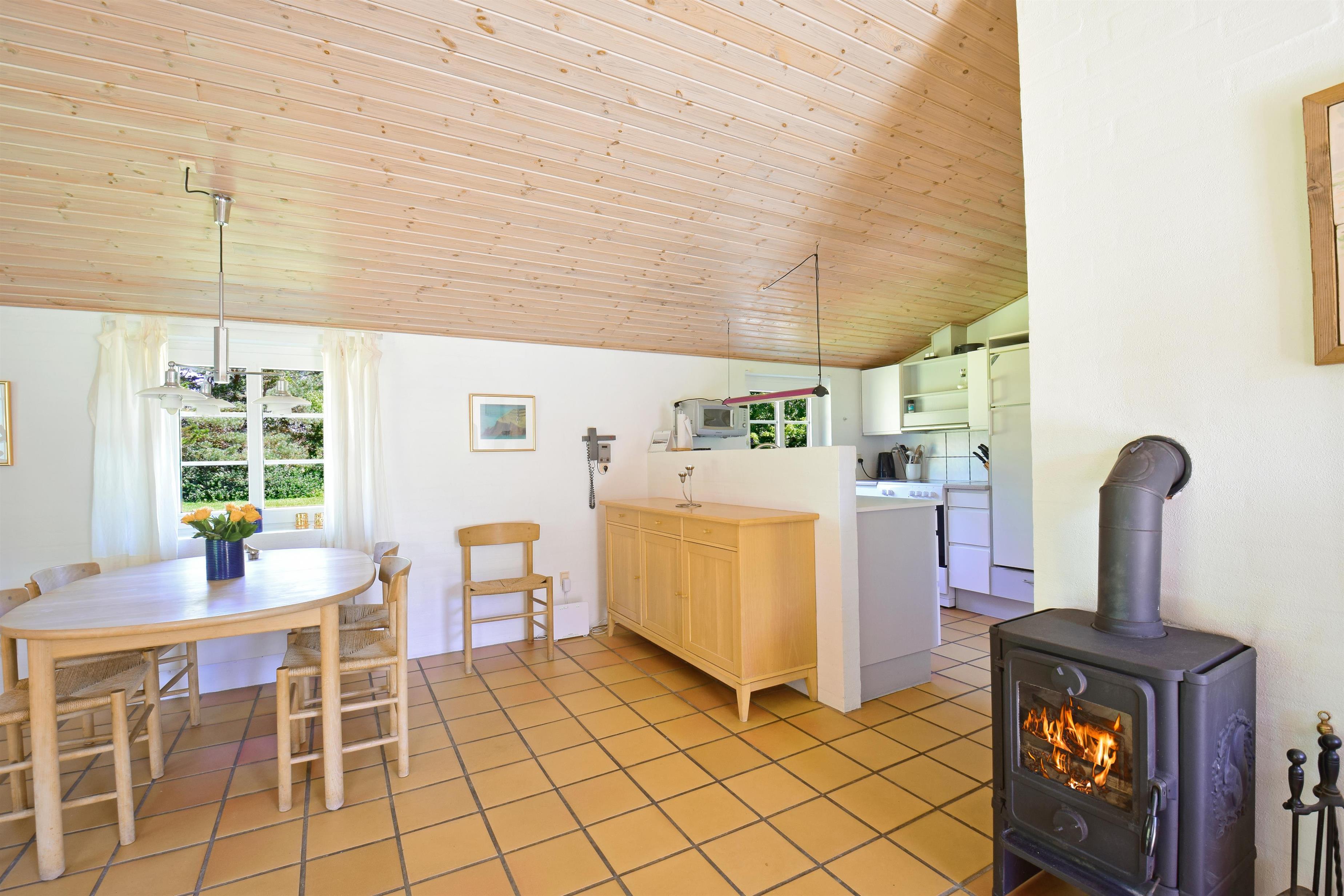Det veludstyrede køkken ligger i åben forbindelse med stuen, hvor der er spiseplads, komfortable møbler, TV og brændeovn – det perfekte samlingspunkt for hyggelige aftener efter en dag ved havet.