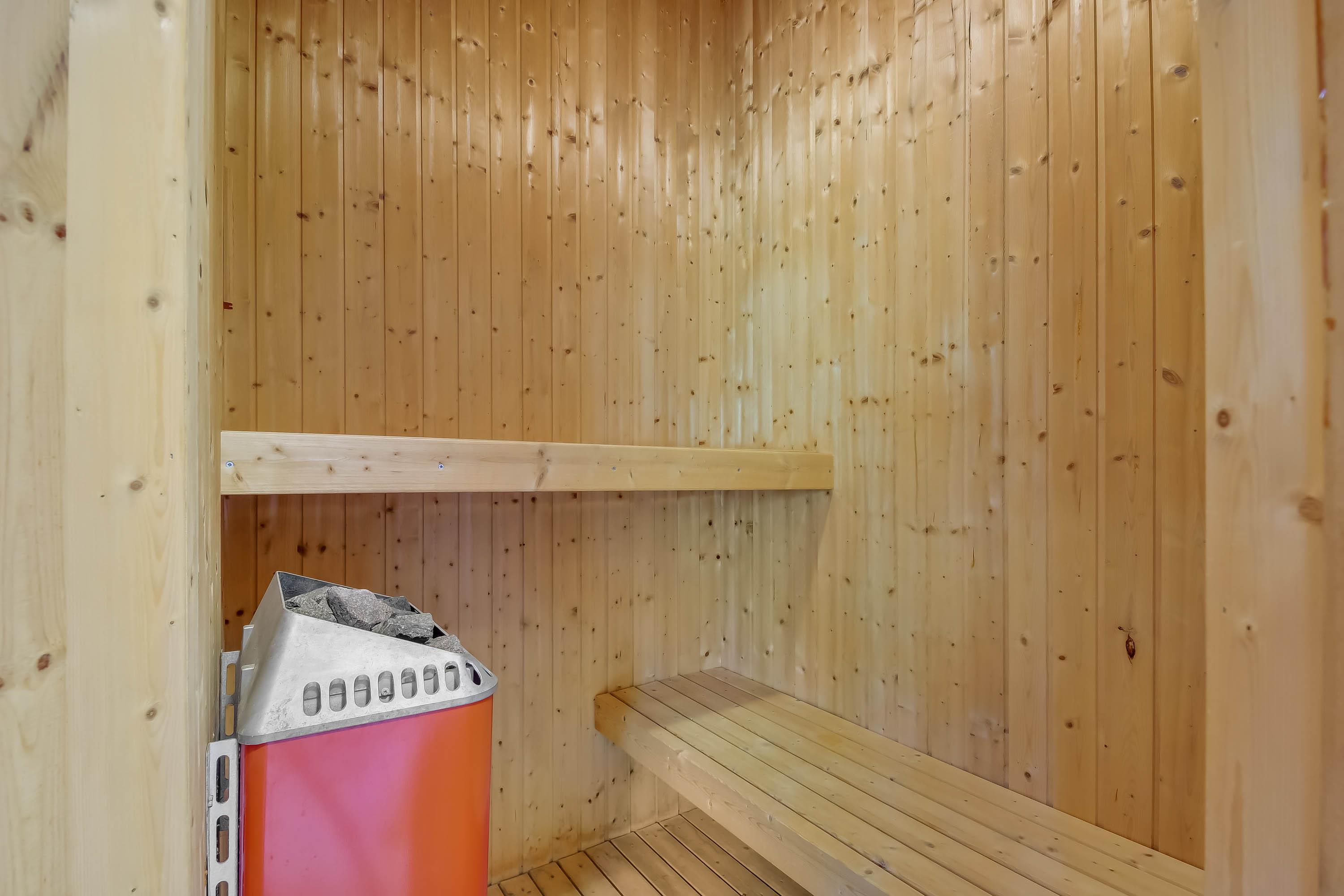 Stort badeværelse med bruseniche, vaskemaskine, tørretumbler og sauna