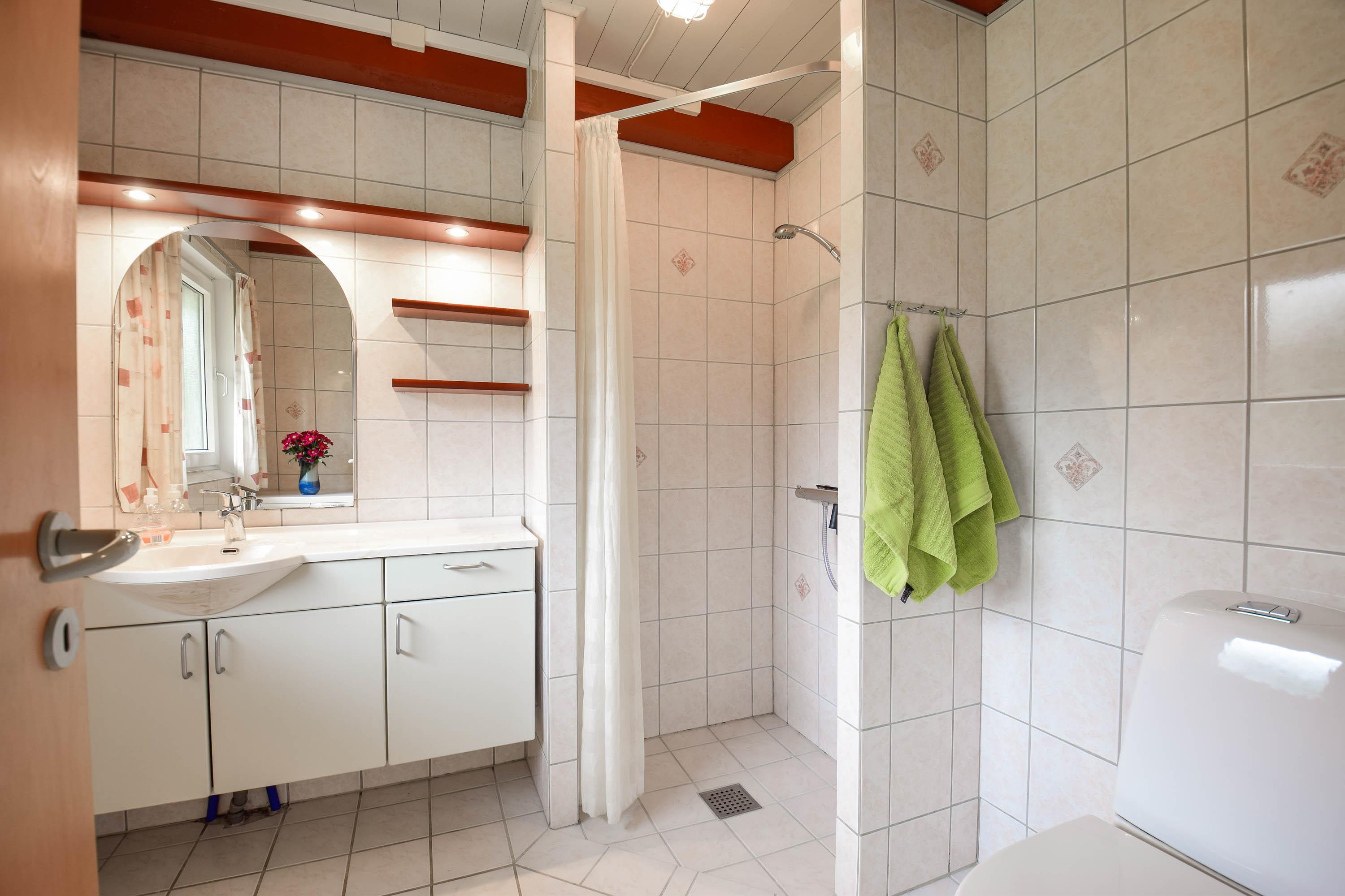 Badeværelse med gulvvarme, vaskemaskine og bruser