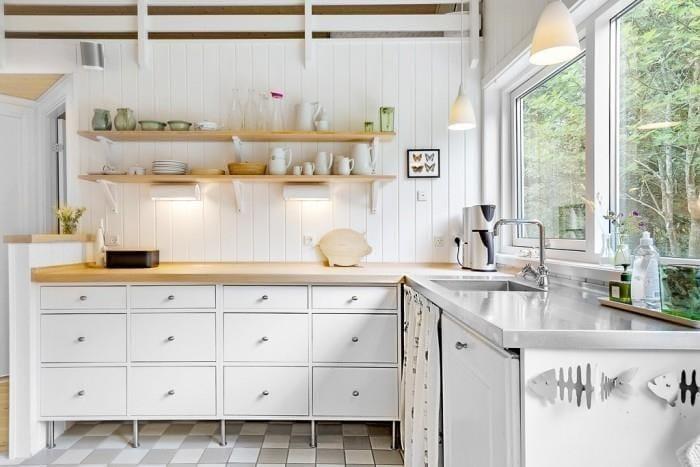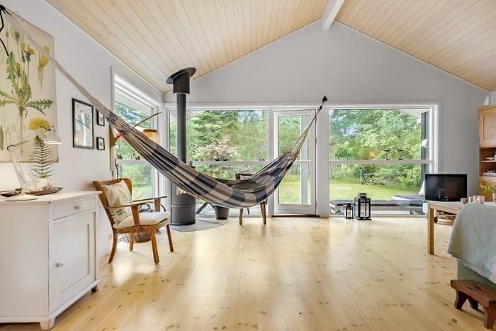 I dette velindrettede sommerhus med højt til loftet og hems som ekstra legeareal til børnene får du masser af plads. Hvis du er morgenmenneske, kan du snige dig ud på terrassen og nyde dagens første kop kaffe, inden resten af familien vågner. I stuen er der store panoramavinduer mod terrassen og haven, og der er masser af plads til alle. Fra køkkenet, kommer du nemt ud på terrassen, hvor du kan servere aftensmaden eller en kølig drink før aftensmaden.