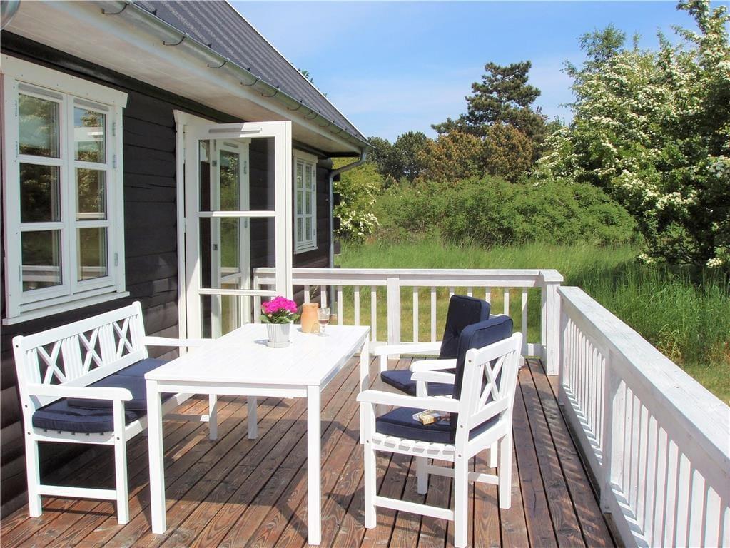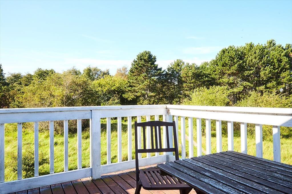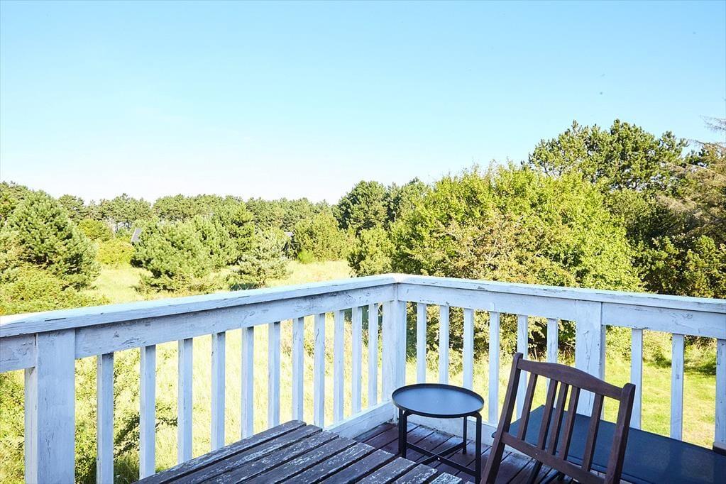 På terrassen ud for stuen kan du nyde solen hele dagen og følge med i det udendørs liv på den store naturgrund – måske kommer et rådyr forbi, hvis du sidder helt stille? Du kan næsten lugte saltet fra havet i den friske havluft, og fra balkonen på førstesalen kan du sidde og nyde udsynet over naturen og kikket til stranden, der kun ligger få hundrede meter væk og indbyder til timevis af aktiviteter på stranden og på havet.