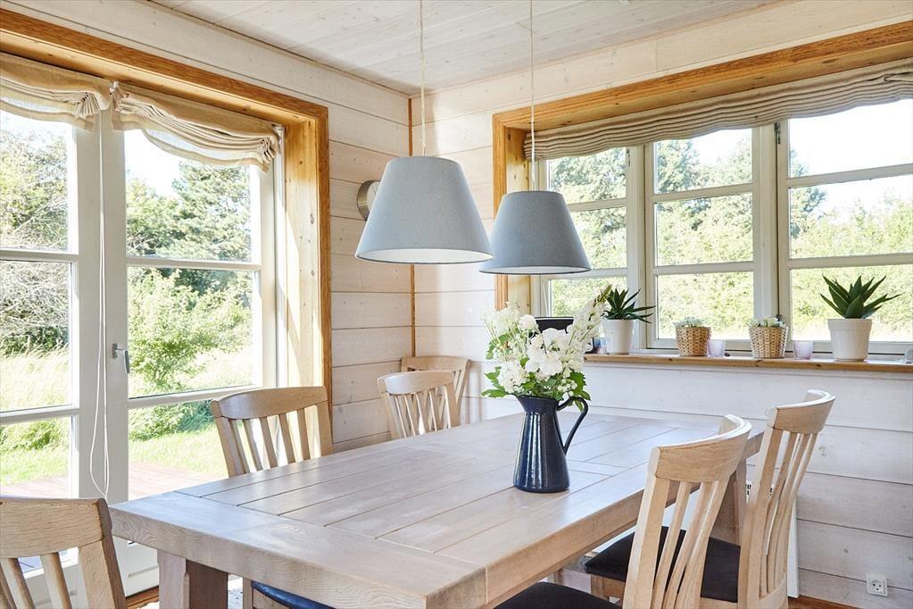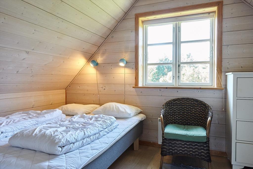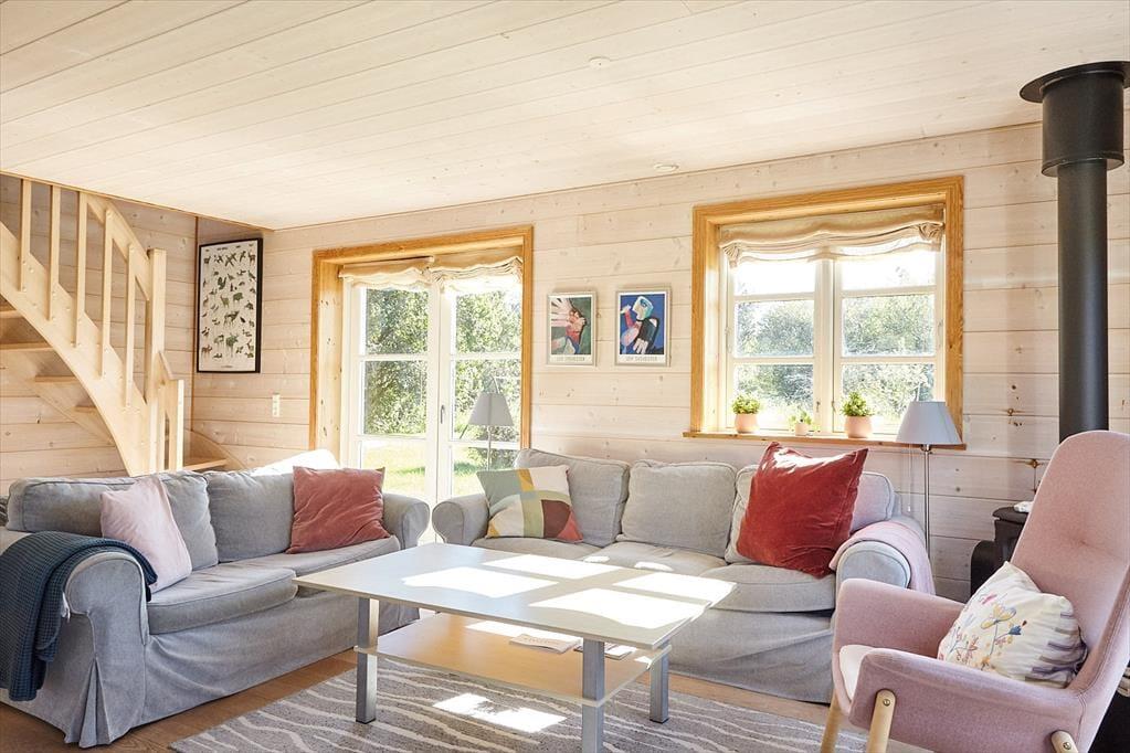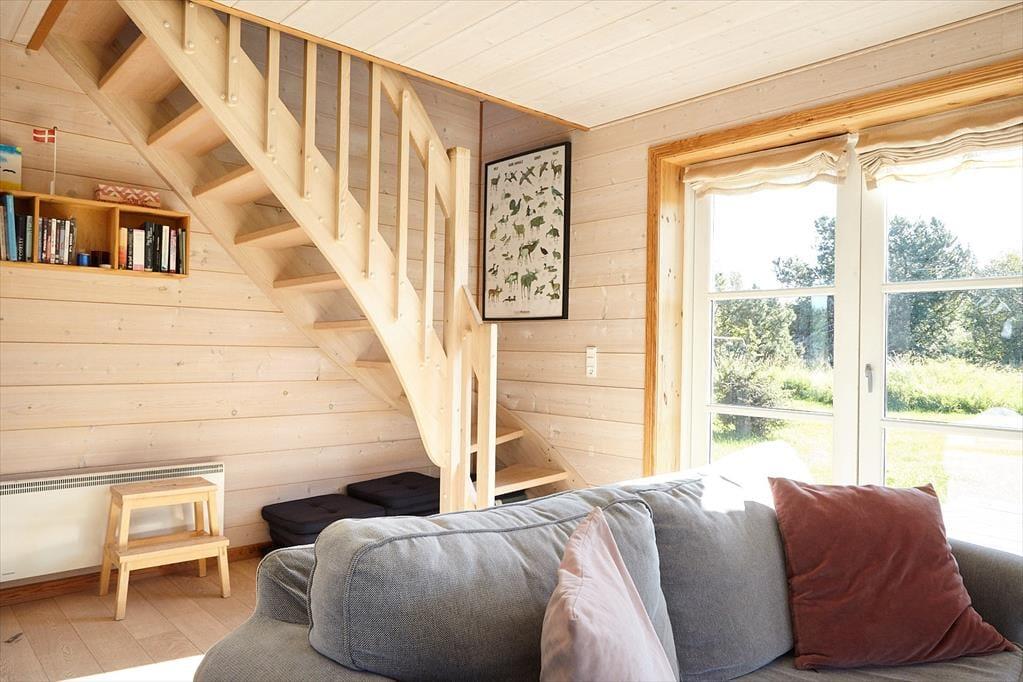 Det velindrettede og rummelige familie- og børnevenlige bjælkehus i to plan har plads til den store familie eller endog to familier. I kan endda fordele jer på stueplan og 1. salen, hvorfra I også kan se til havet fra balkonen. Det ene soveværelse ligger i stueplan, så hvis du har svært ved at gå på trapper, er det muligt at sove der. Fra den lyse stue kan du fra de store franske terrassedøre og de store vinduer følge med i det udendørs liv dagen igennem. Fra det åbne køkken kan du følge med i samtalen i stuen, mens du har stegen i ovnen eller bager pandekager til eftermiddagskaffen. På førstesalen med de to soveværelser er der også plads til, at børnene kan lege.