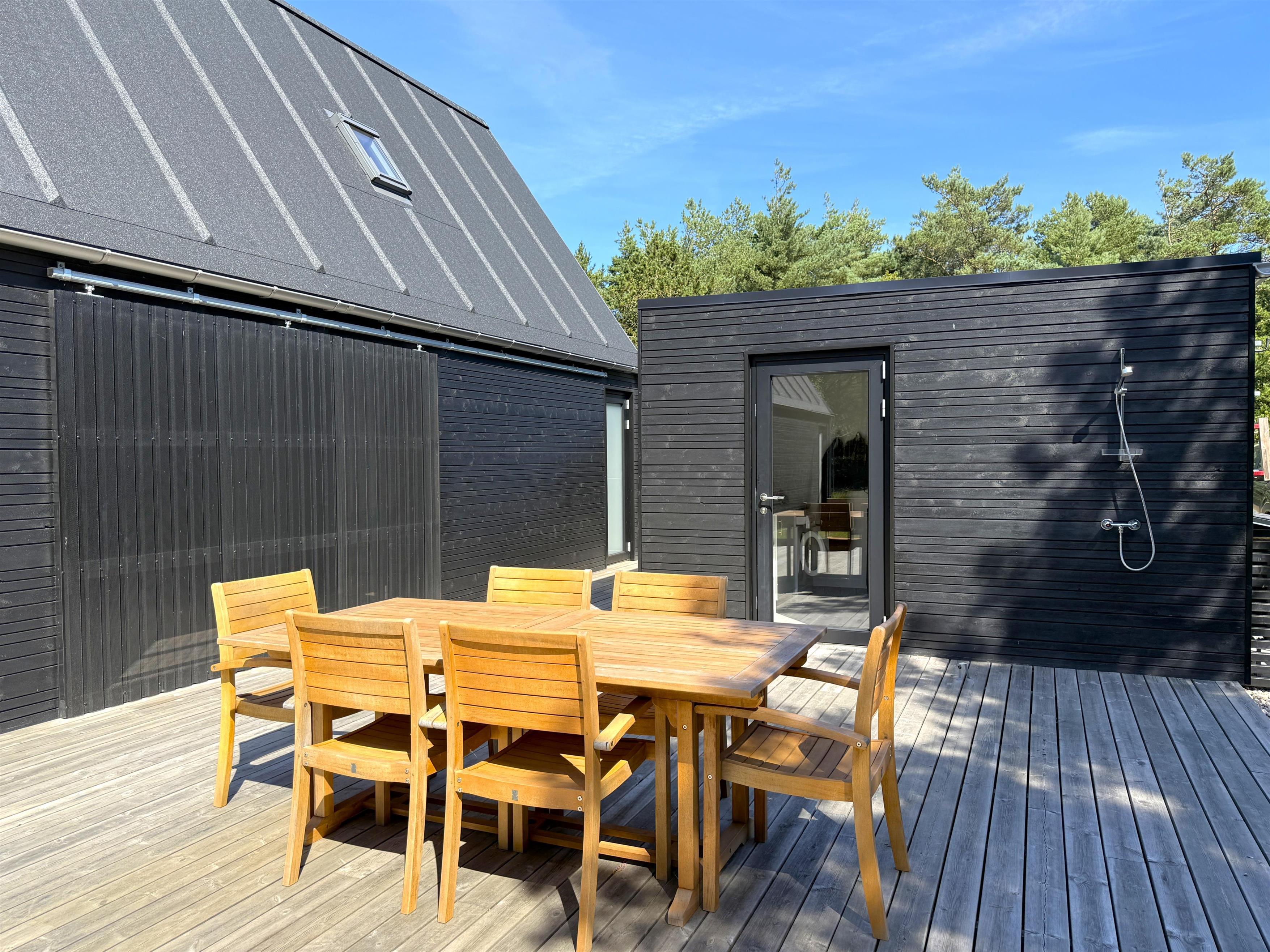 Hovedhuset har et stort, flot køkkenalrum med god spiseplads og sofaafdeling. Derudover soveværelse med dobbeltseng og badeværelse med brus samt trappeopgang til endnu et soveværelse med dobbeltseng. En tilsvarende placering af soveværelser og badeværelse findes i husets modsatte længe, som er adskilt fra hovedhuset via den overdækkede terrasse. Der er en smuk havudsigt fra soveværelserne på 1.salen, og der er havedøre fra både badeværelser og soveværelser i stueplan. Husets indretning gør det særdeles velegnet til flere familier. Fra hovedhuset er der udgang til træterrasser, som er henholdsvis vest og østvendte, og der er udebruser, som kan benyttes efter strandturen. Der er rigtig gode muligheder for at benytte husets grill, mens solnedgangen nydes over havet.