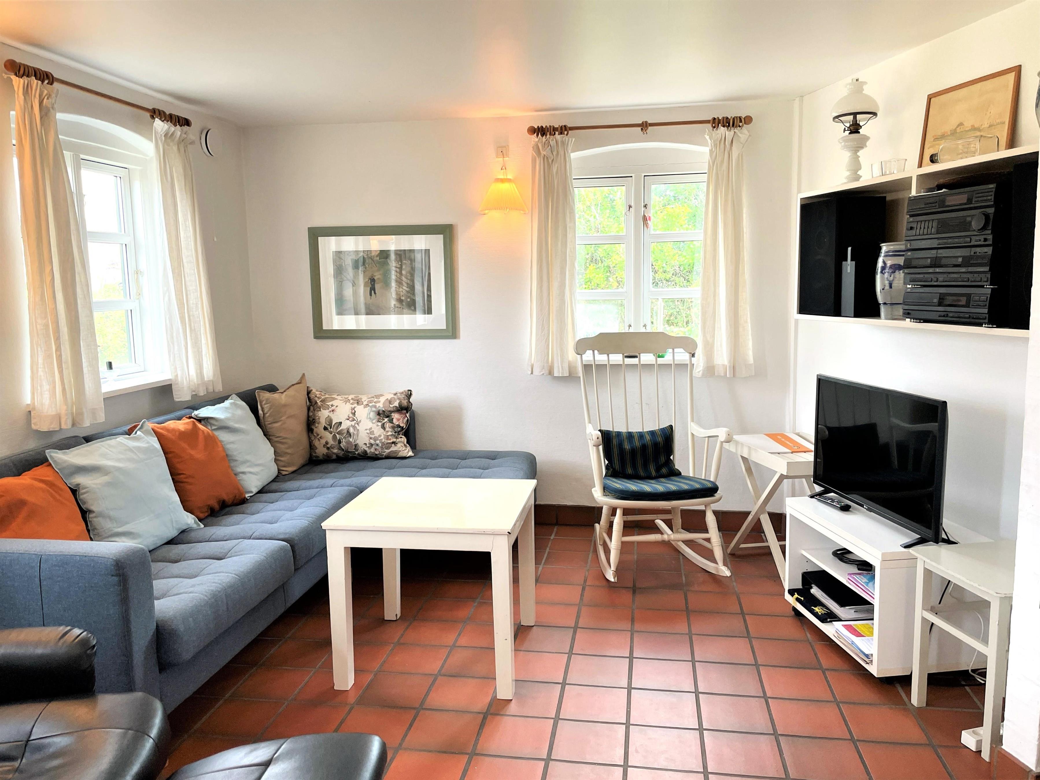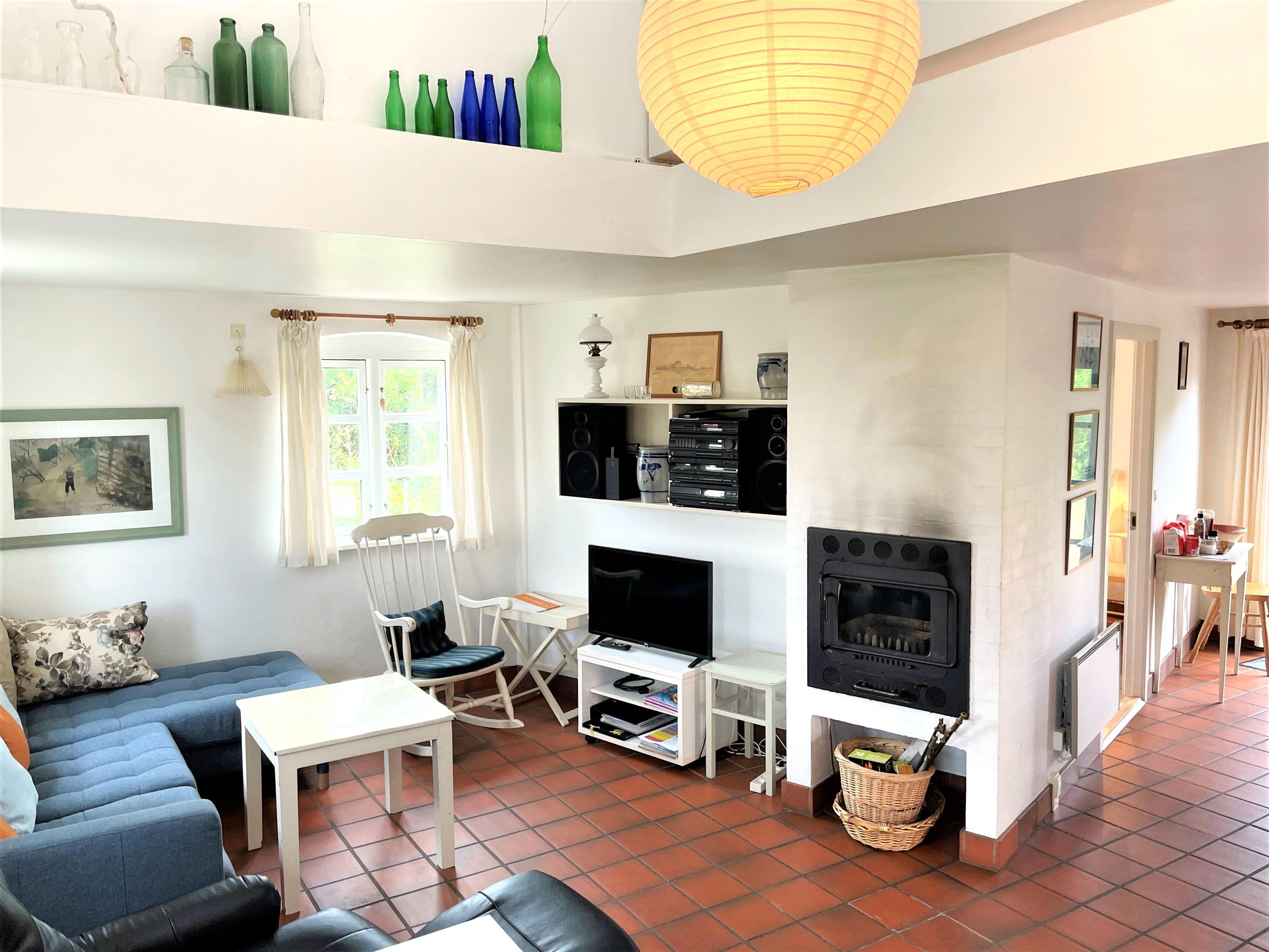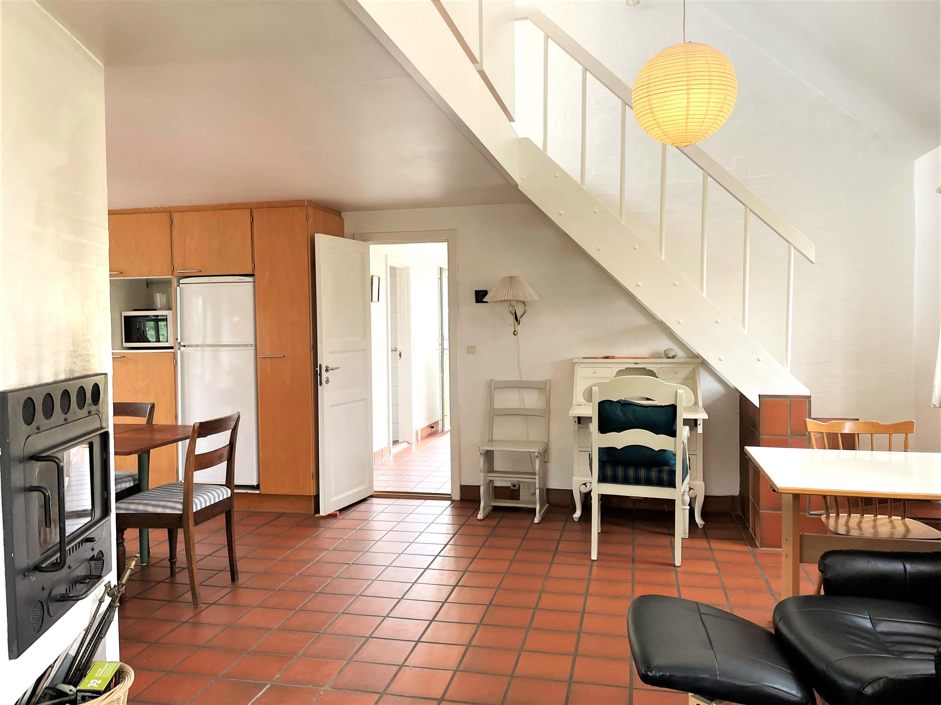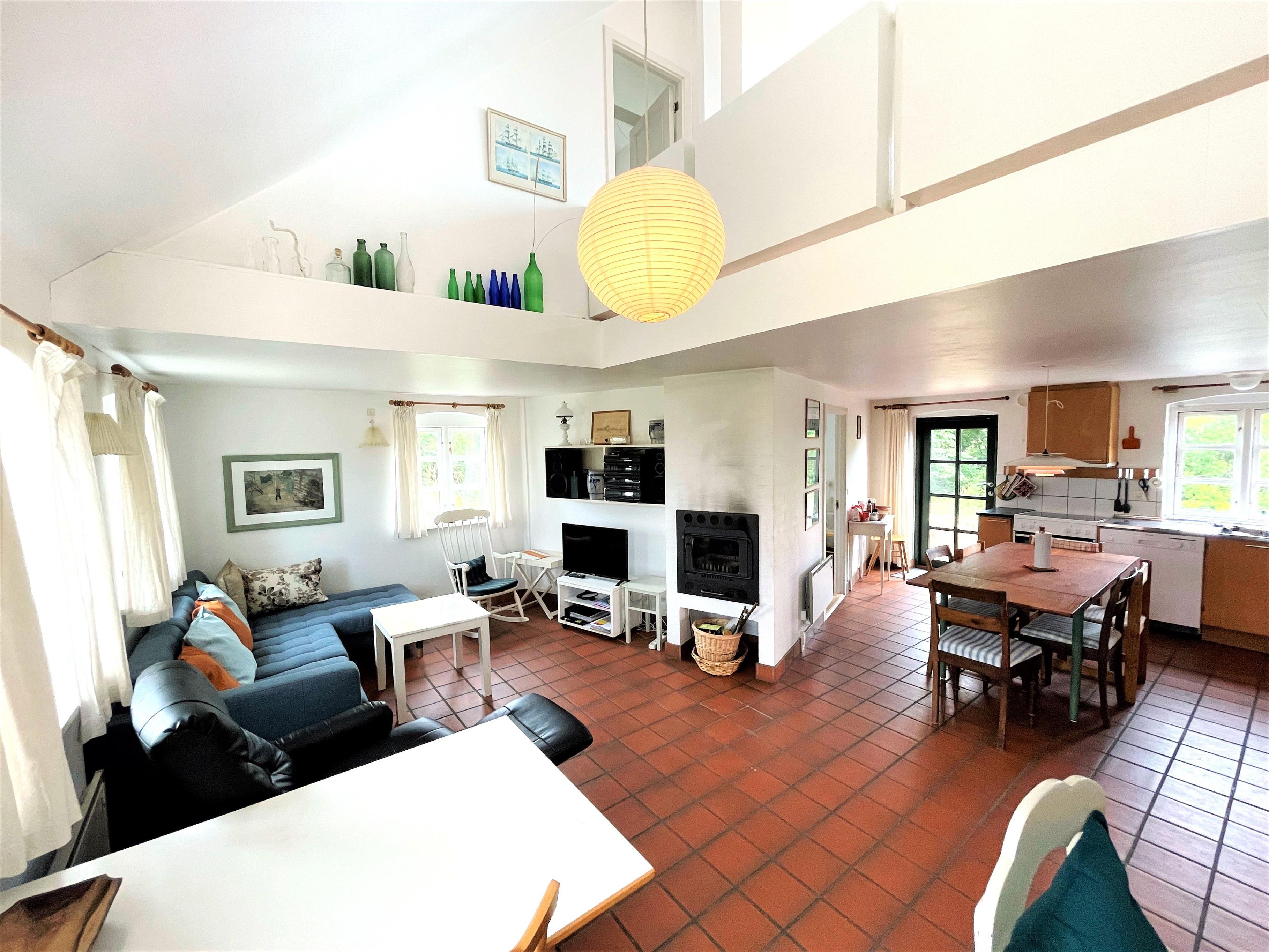 Stueplan indeholder fint stort køkken med spiseplads og dejlig stor stue med brændeovn. To soverum, et med dobbeltseng og et med to enkeltsenge (70x190). Derudover entre og stort badeværelse med brus, toilet og vaskemaskine/tørretumbler.