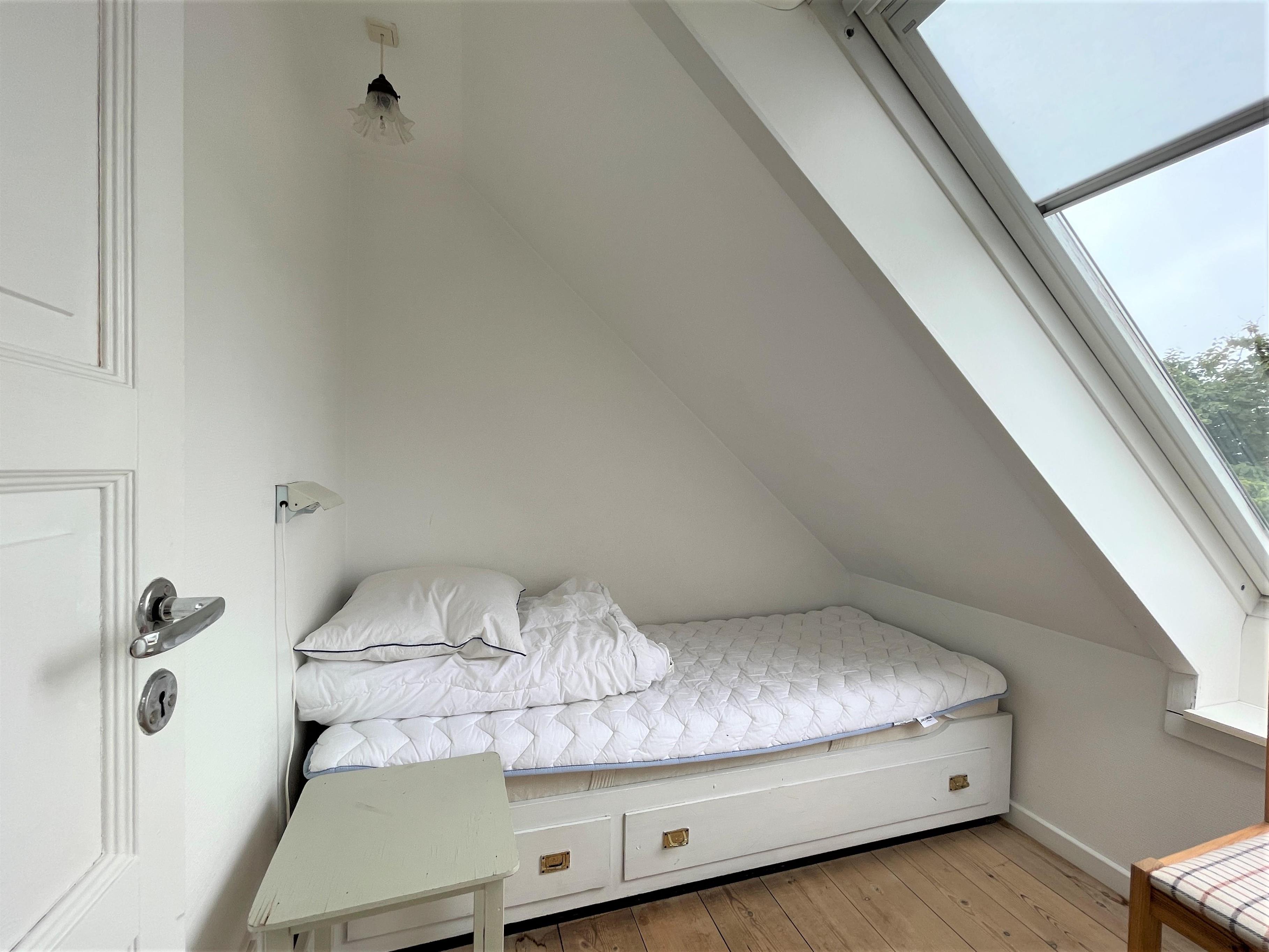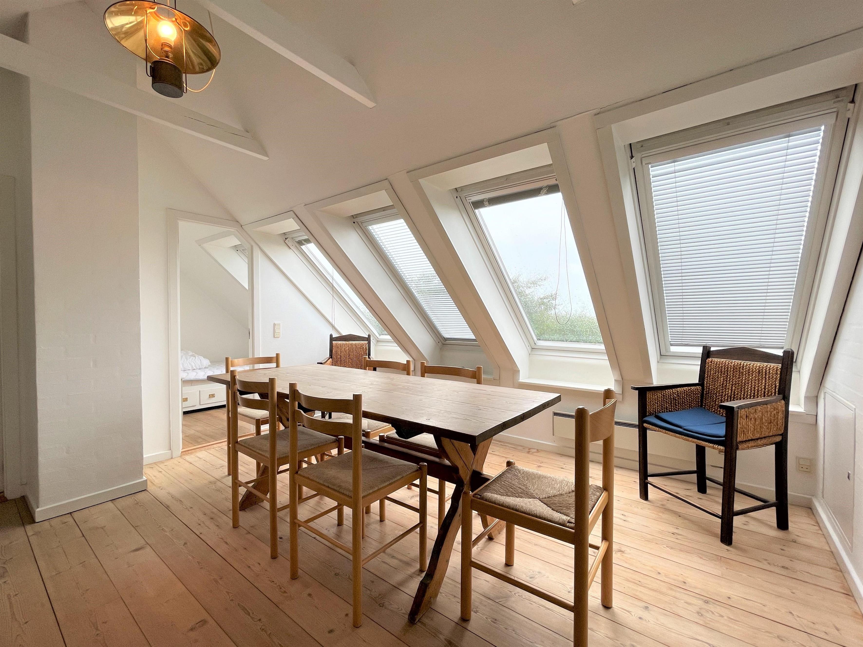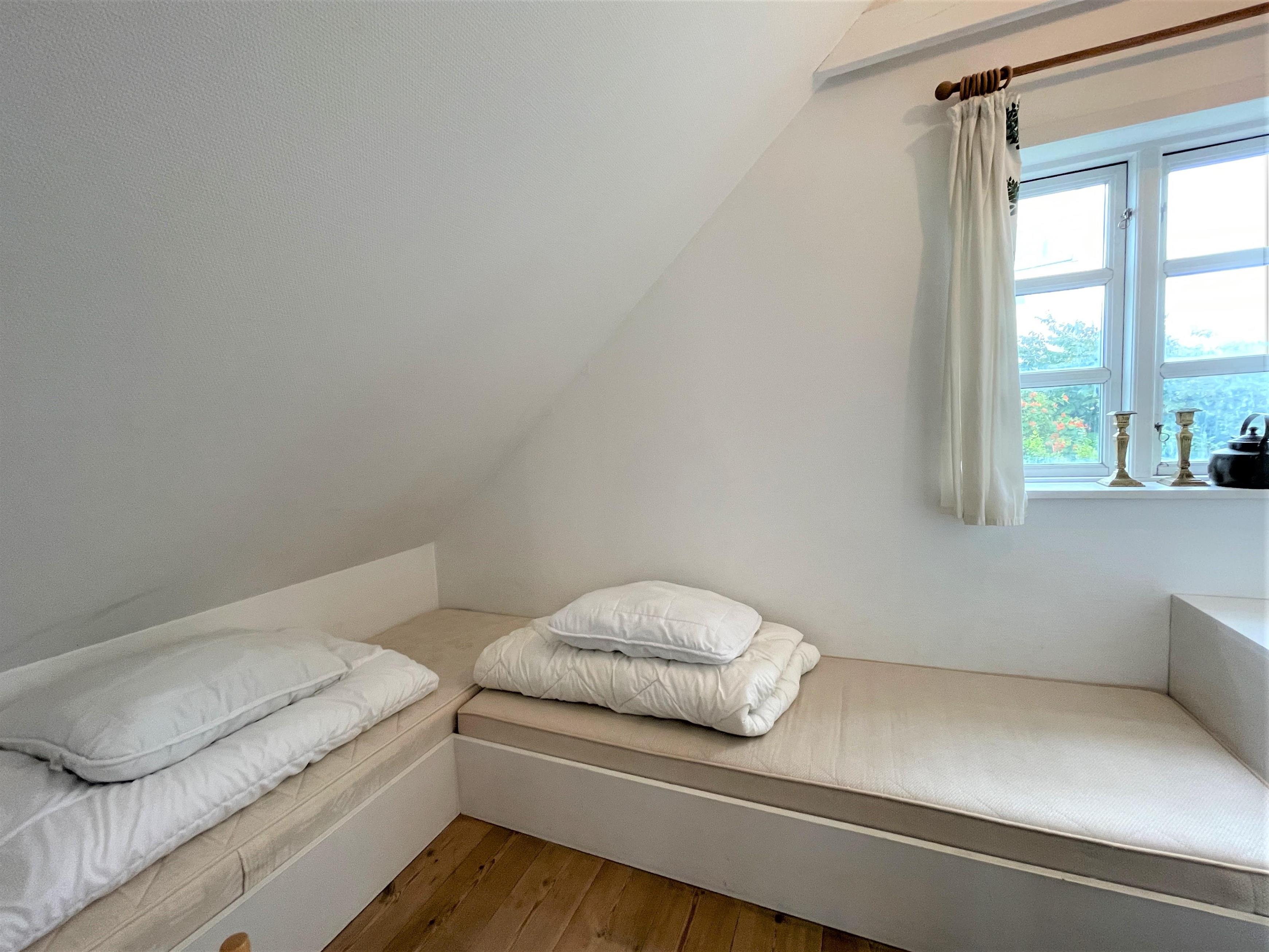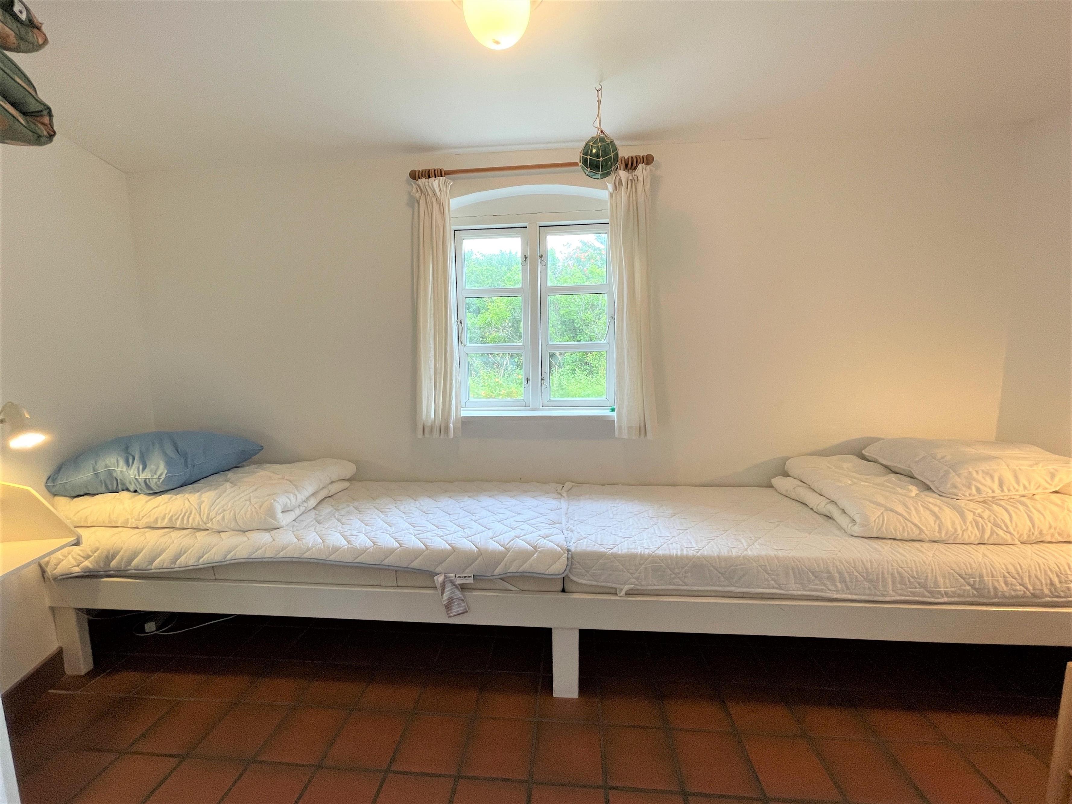 1. sal med hyggeligt lyst repos, indrettet med stort bord, hvor der er plads til hyggelige aktiviteter, læsning, spil og selskabelige stunder. Herudover er der tre soverum, et med dobbeltseng, et med to enkeltsenge (70x190) og et med en enkeltseng (70x190). Toilet og brus. Flot havudsigt fra 1.salen.