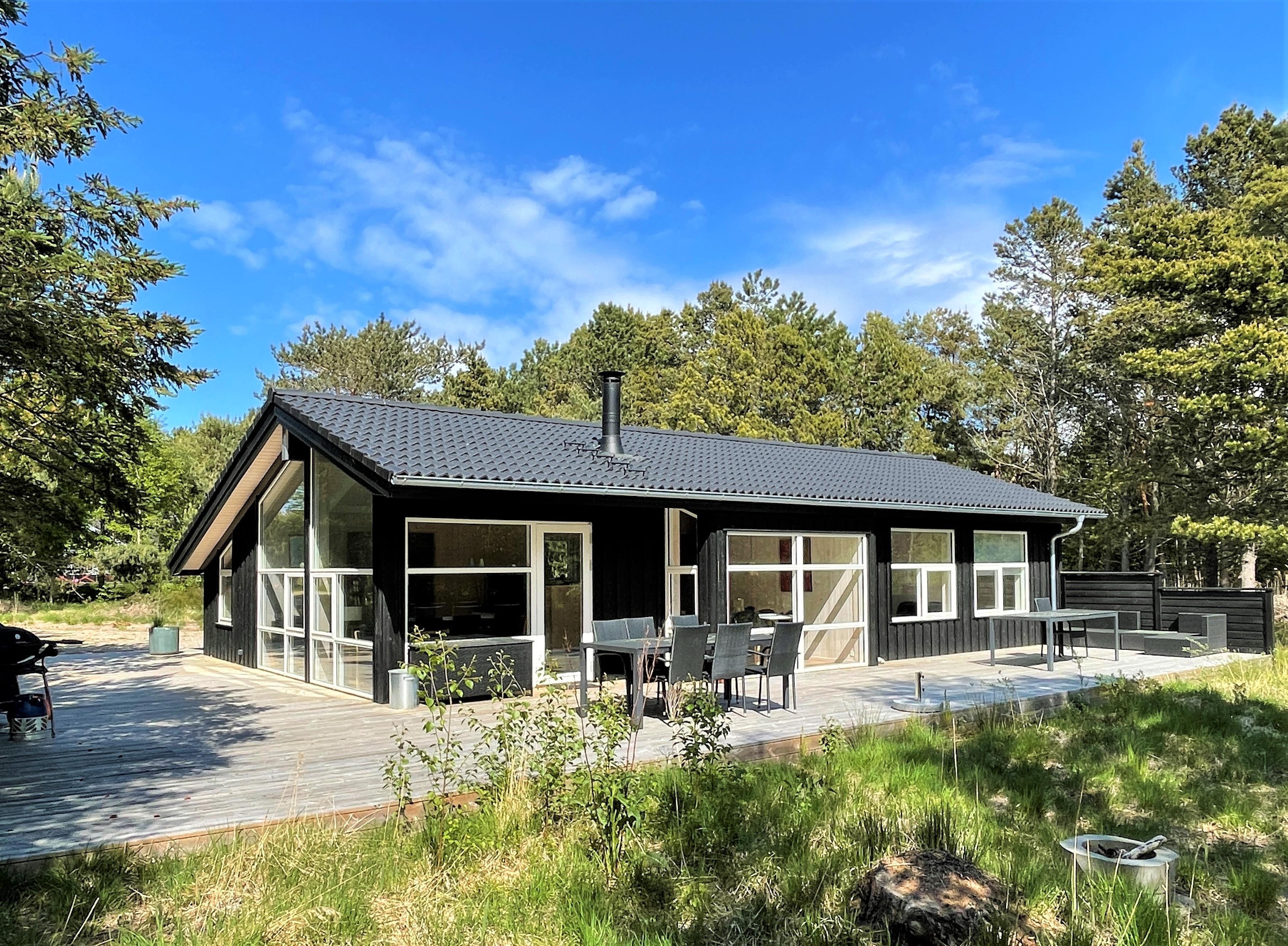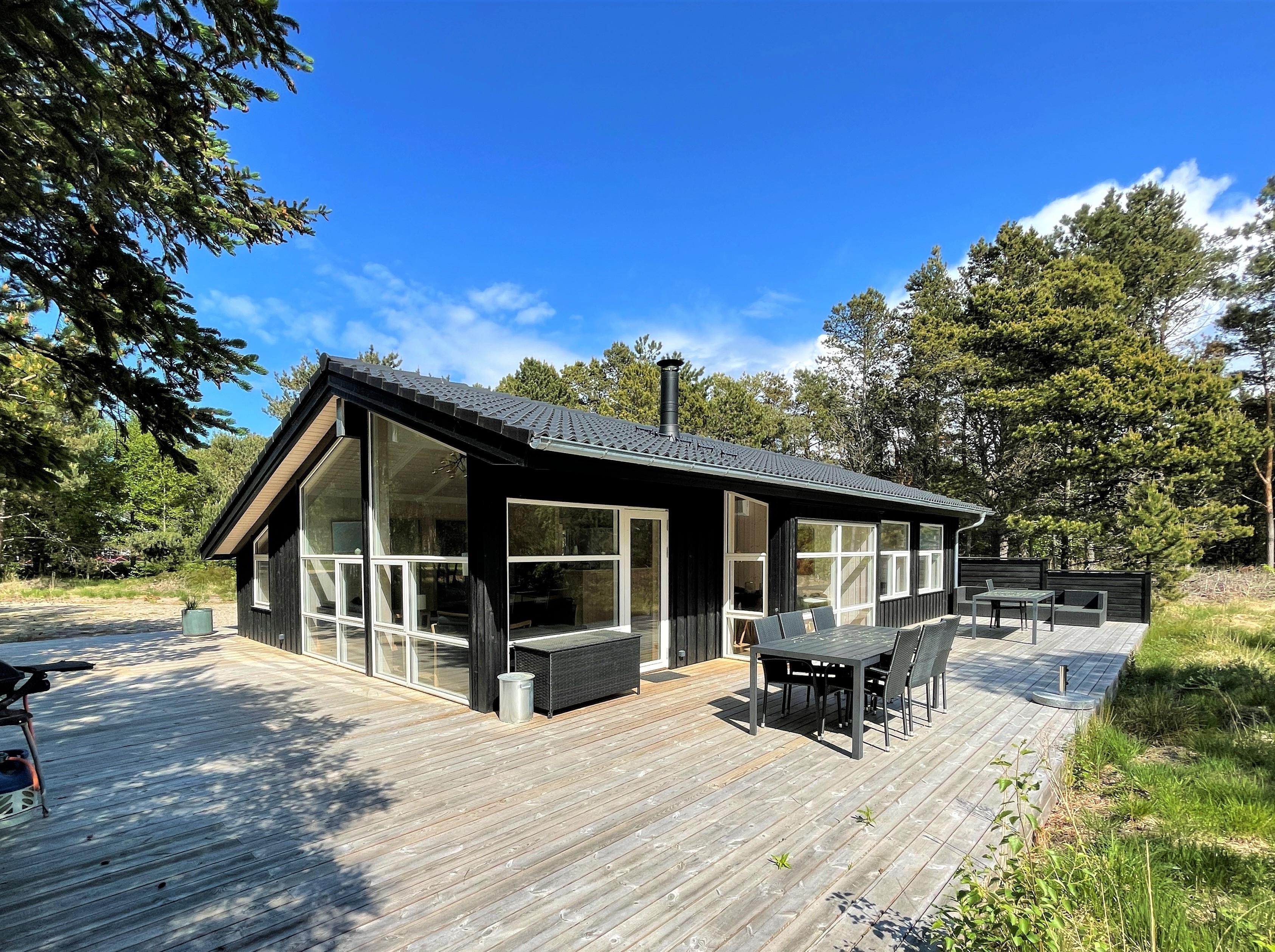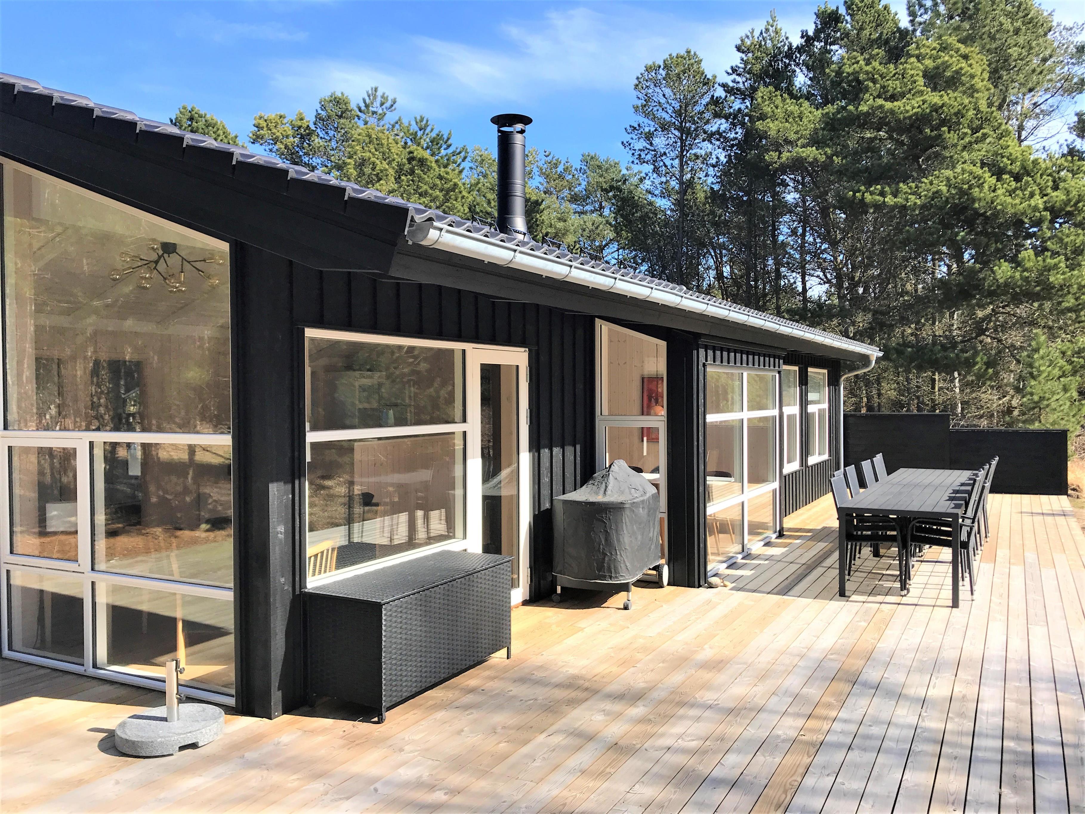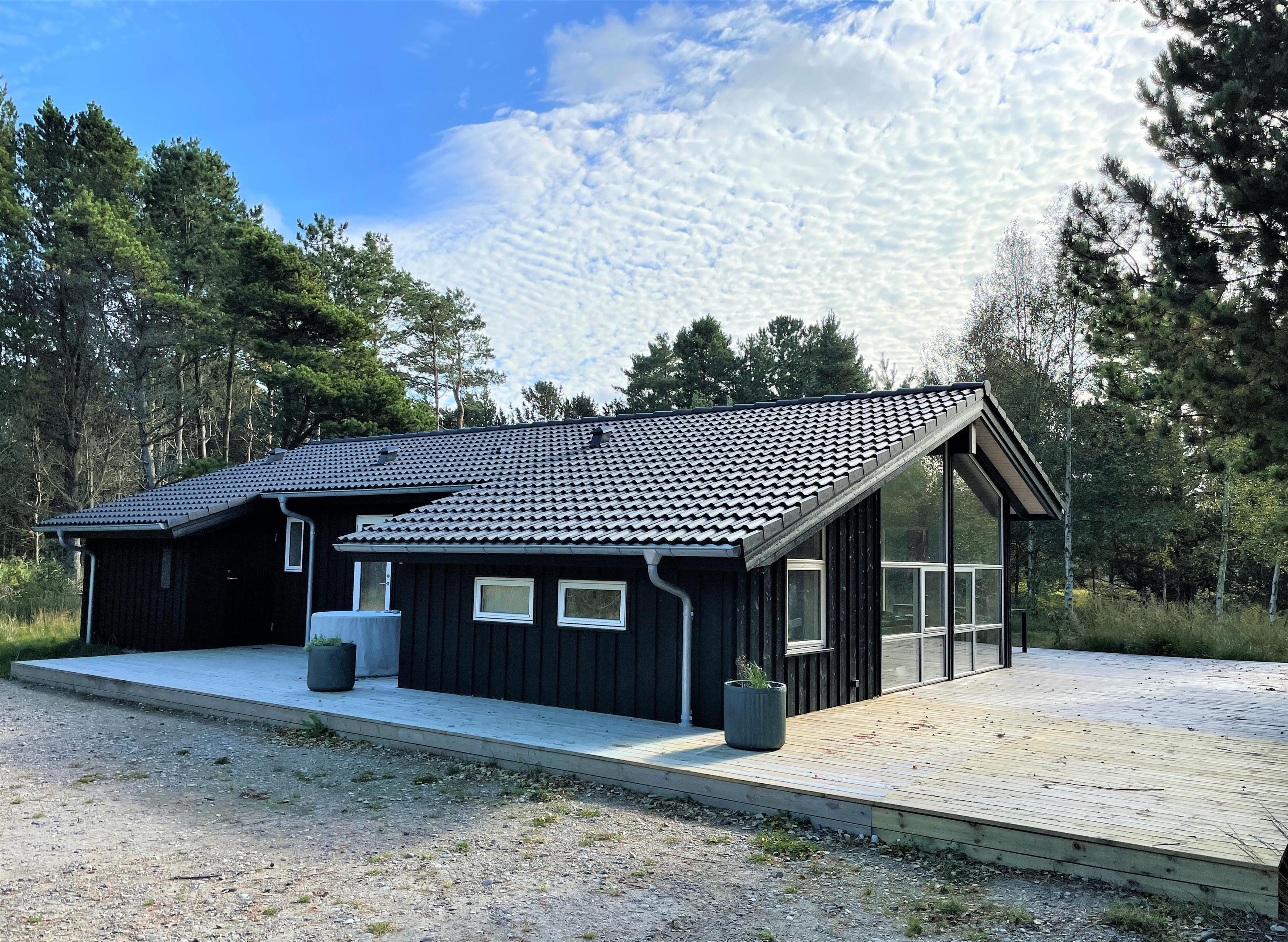 Dette pragtfulde nybyggede feriehus, som er i rigtig høj kvalitet både ude og inde, er huset, som indbyder til ferie og hygge i den rette atmosfære. Huset er praktisk indrettet for både voksne og børn. Veludstyret, moderne køkken i åben forbindelse med lys, komfortabel stue. Der er fire værelser med dobbeltseng (to af dem med 3/4 mål). To fine badeværelser med brus. Der er desuden træterrasse delvis rundt huset, hvor man altid kan finde en solkrog. Terrassen indeholder flere sæt havemøbler og grill, og den er omkranset af lyng/skovområde.