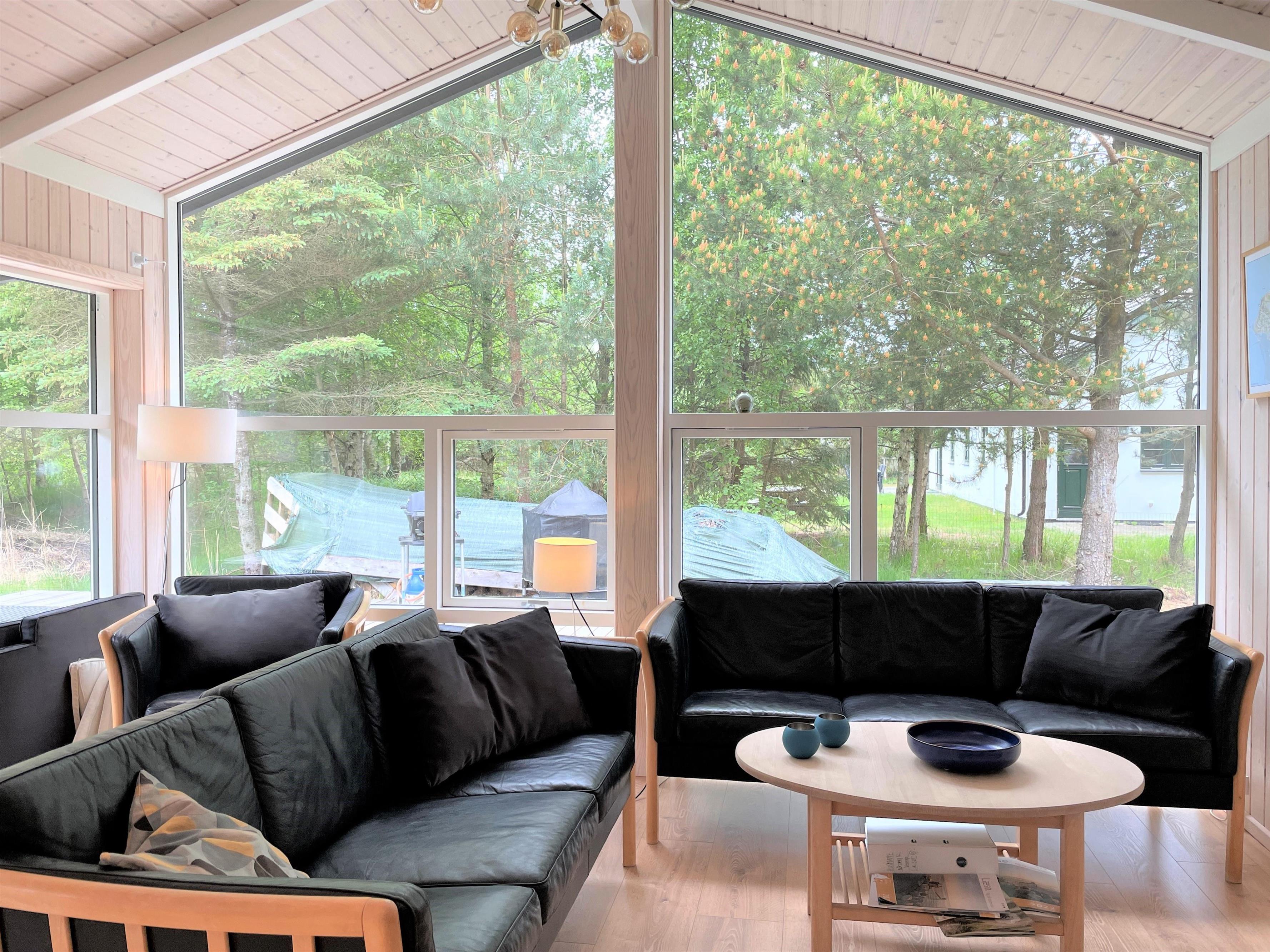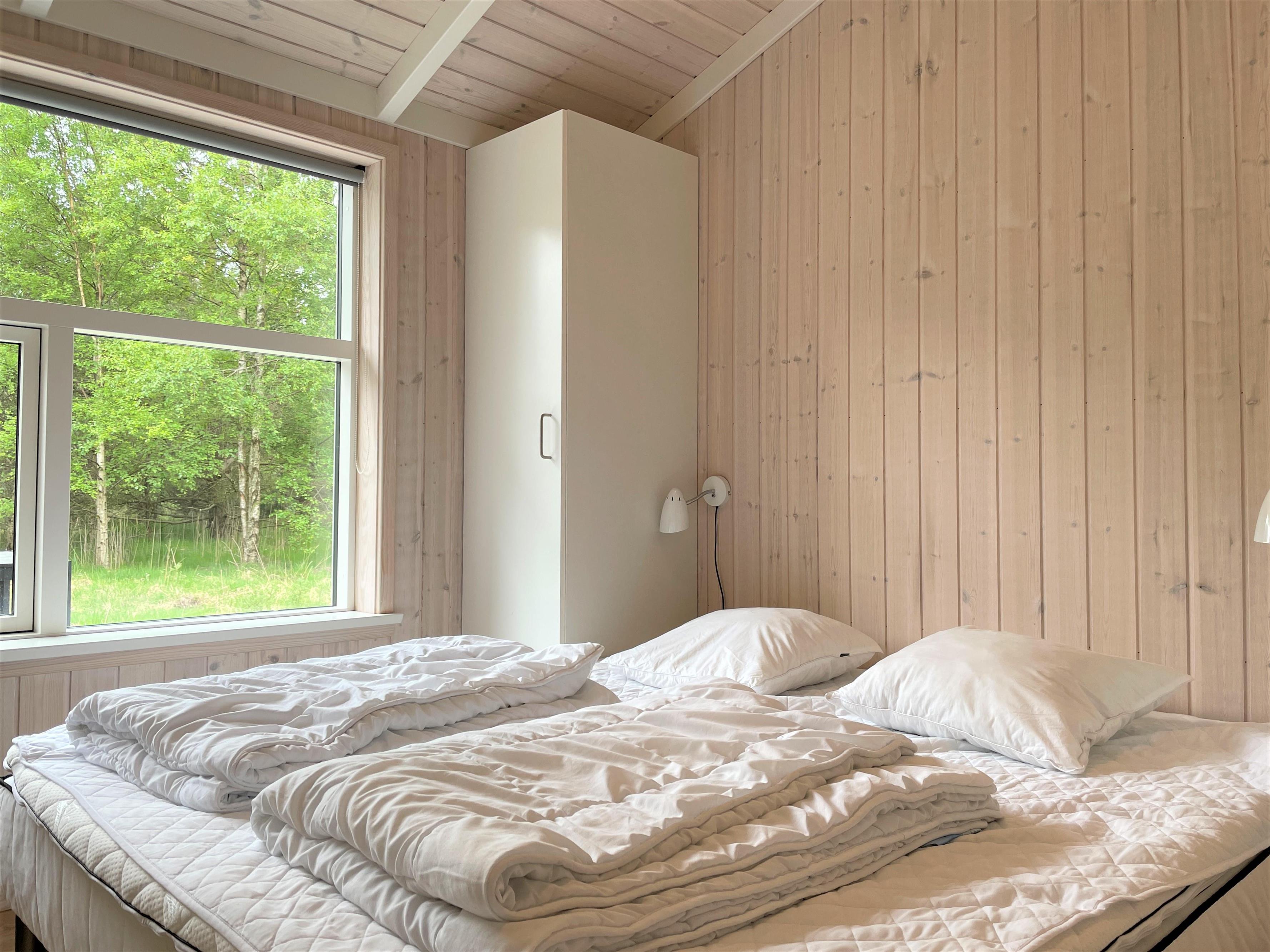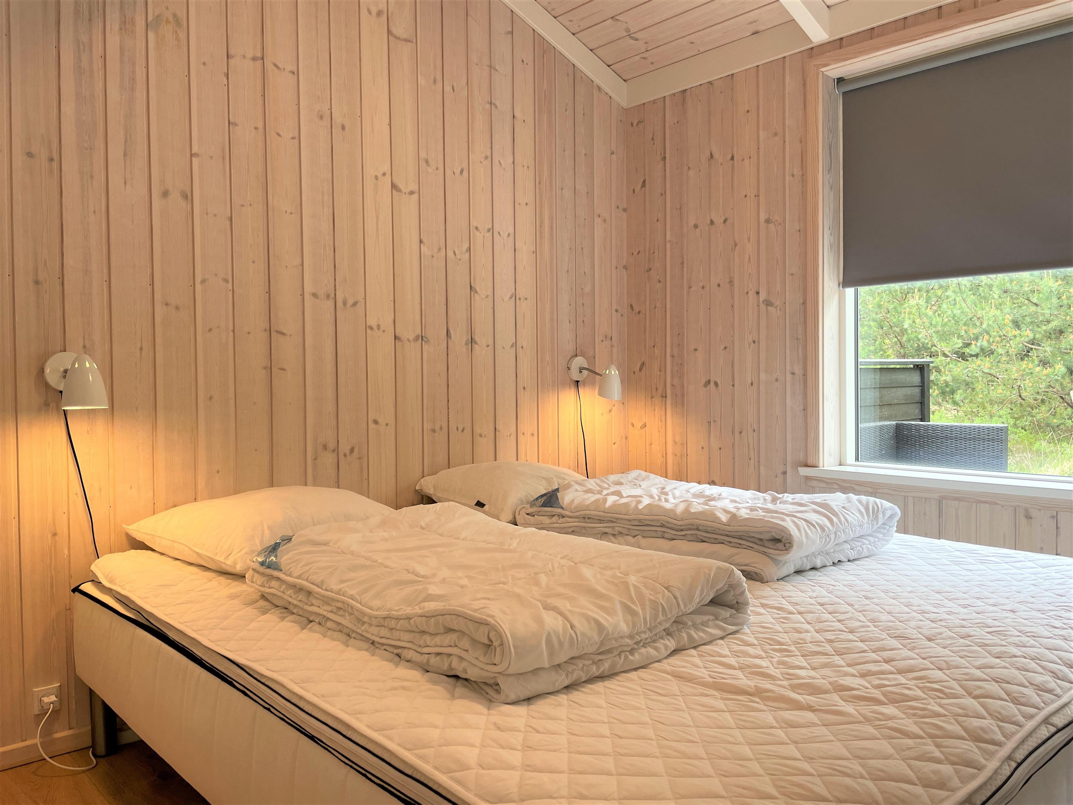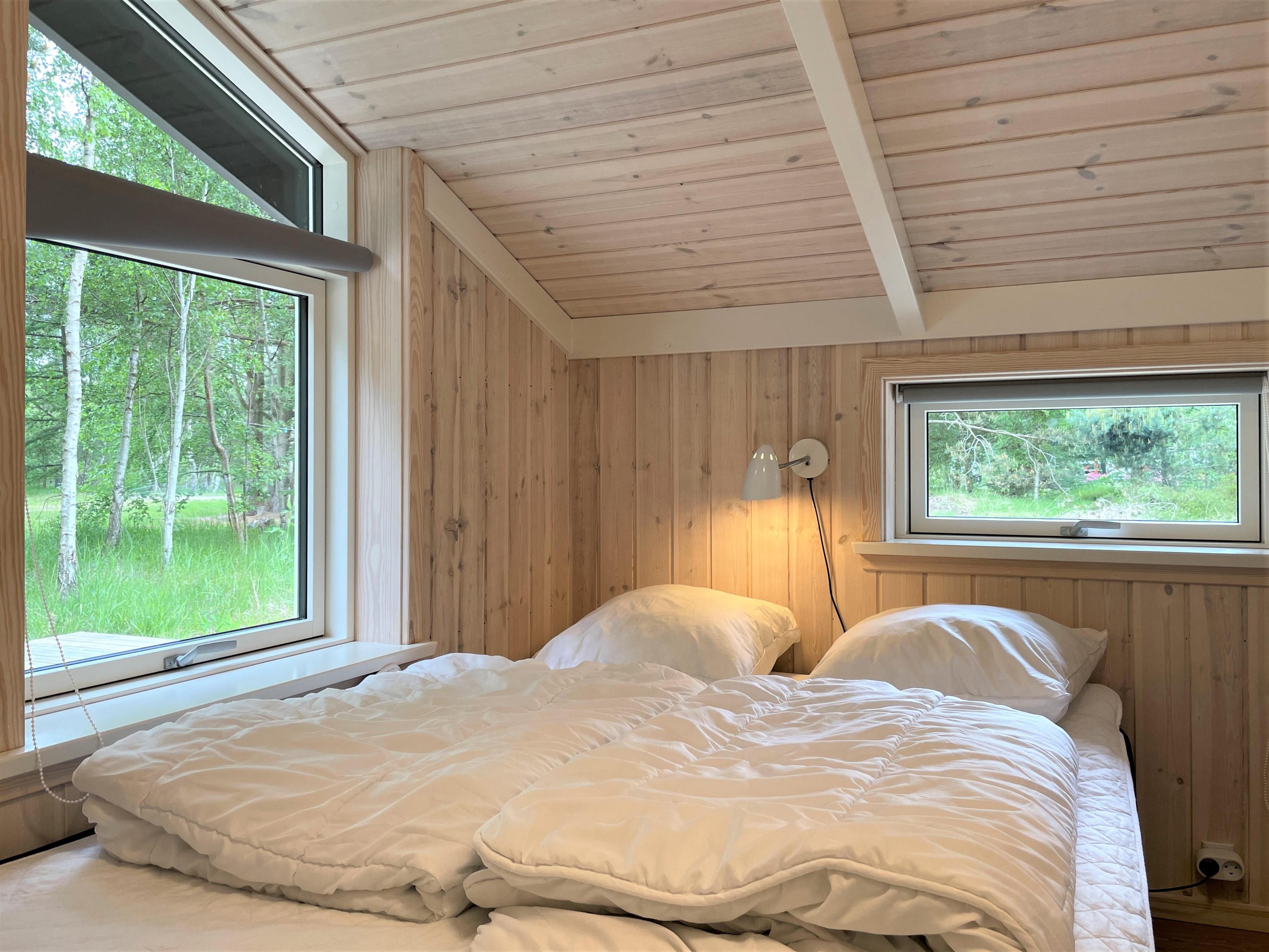 Dette pragtfulde nybyggede feriehus, som er i rigtig høj kvalitet både ude og inde, er huset, som indbyder til ferie og hygge i den rette atmosfære. Huset er praktisk indrettet for både voksne og børn. Veludstyret, moderne køkken i åben forbindelse med lys, komfortabel stue. Der er fire værelser med dobbeltseng (to af dem med 3/4 mål). To fine badeværelser med brus. Der er desuden træterrasse delvis rundt huset, hvor man altid kan finde en solkrog. Terrassen indeholder flere sæt havemøbler og grill, og den er omkranset af lyng/skovområde.