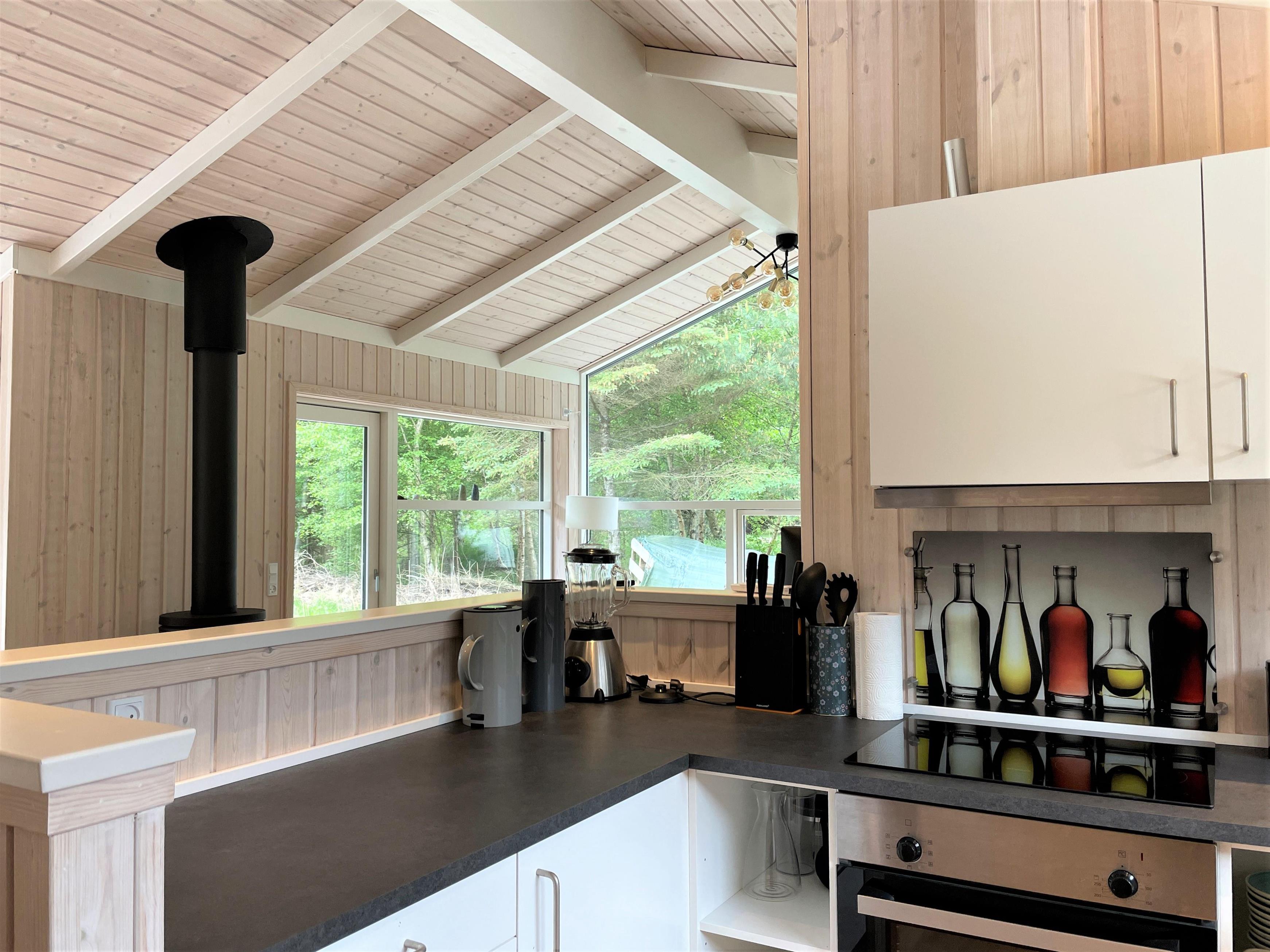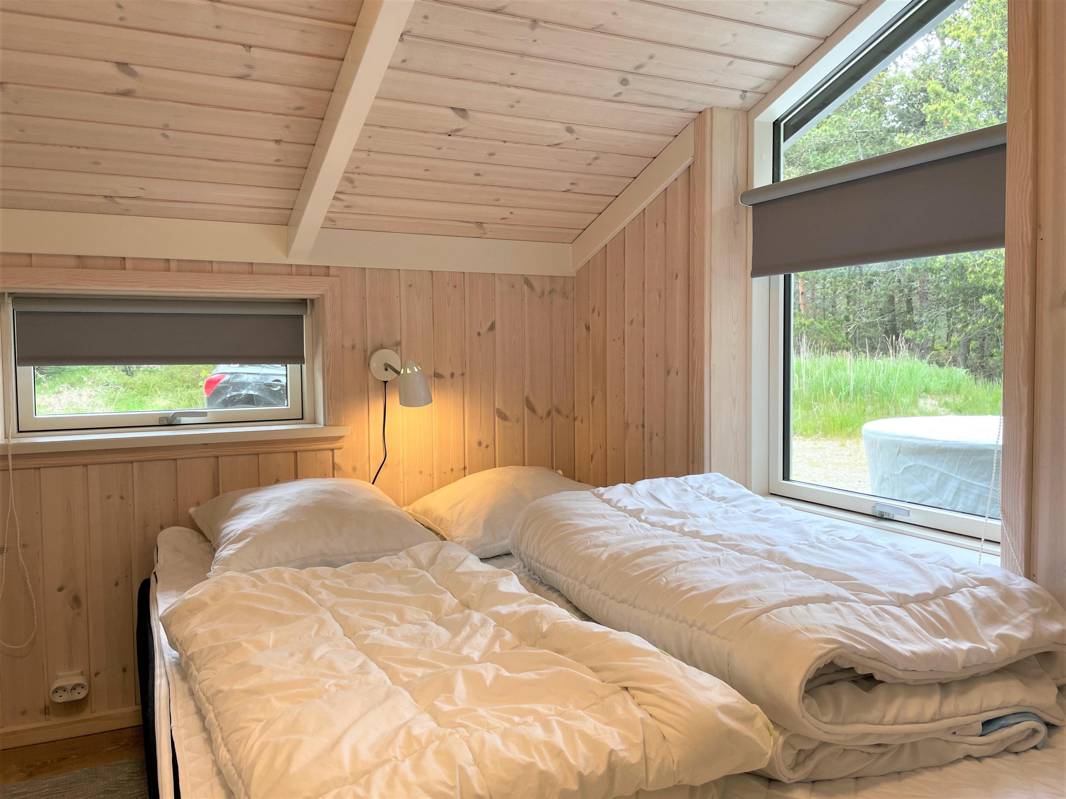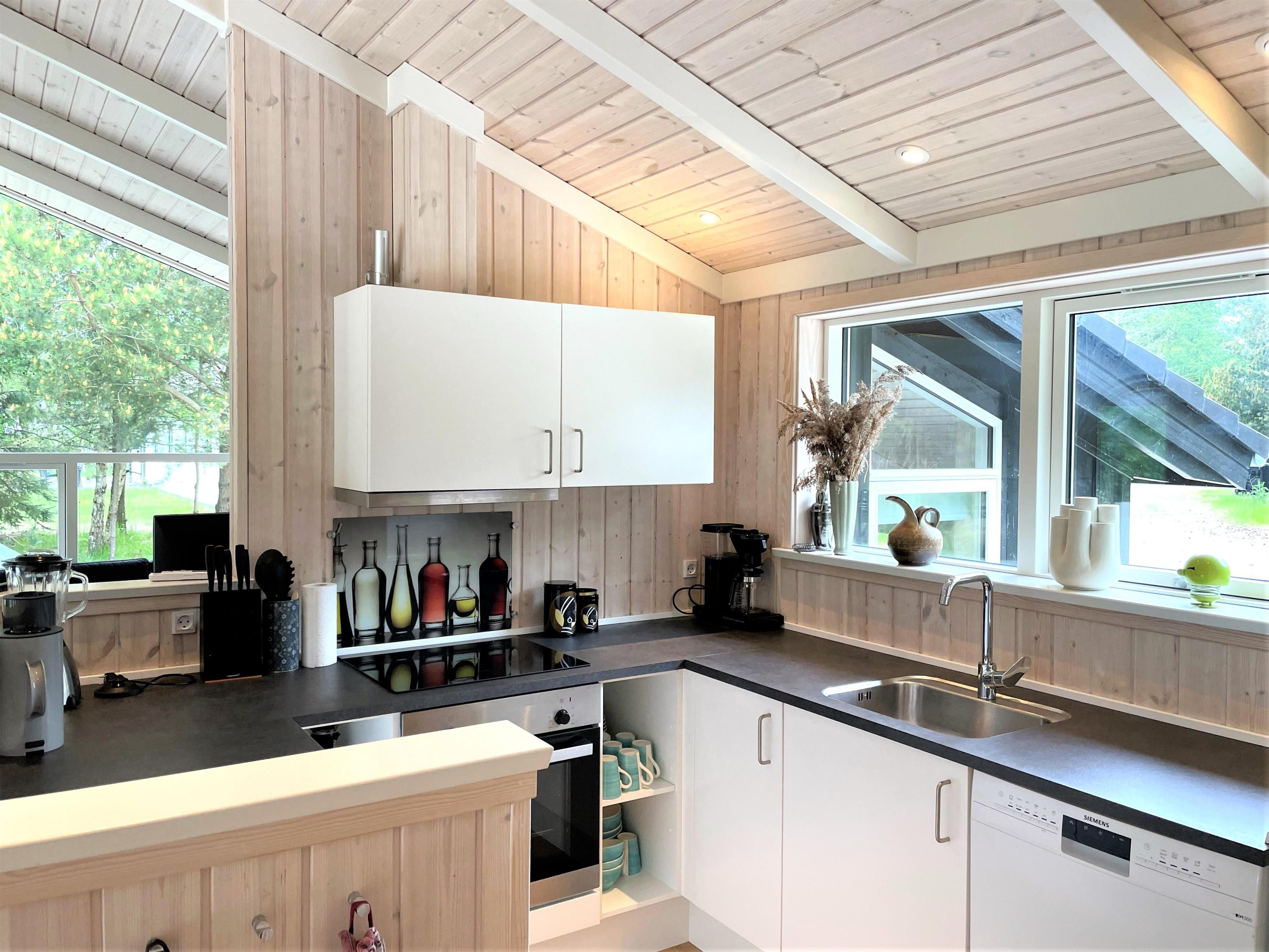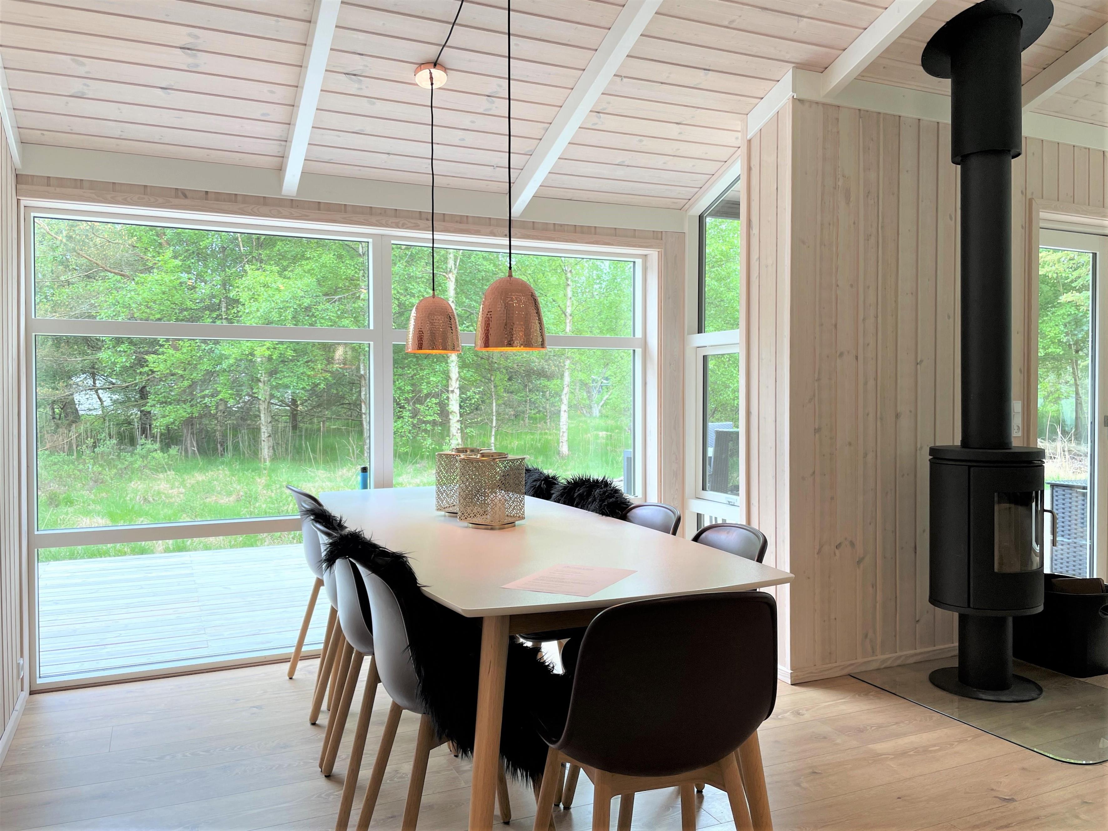 Dette pragtfulde nybyggede feriehus, som er i rigtig høj kvalitet både ude og inde, er huset, som indbyder til ferie og hygge i den rette atmosfære. Huset er praktisk indrettet for både voksne og børn. Veludstyret, moderne køkken i åben forbindelse med lys, komfortabel stue. Der er fire værelser med dobbeltseng (to af dem med 3/4 mål). To fine badeværelser med brus. Der er desuden træterrasse delvis rundt huset, hvor man altid kan finde en solkrog. Terrassen indeholder flere sæt havemøbler og grill, og den er omkranset af lyng/skovområde.