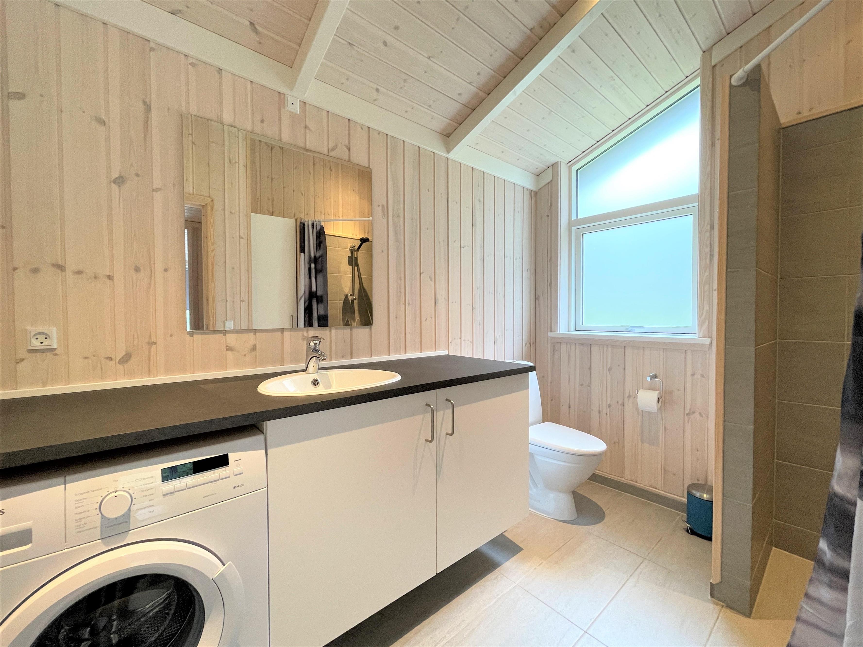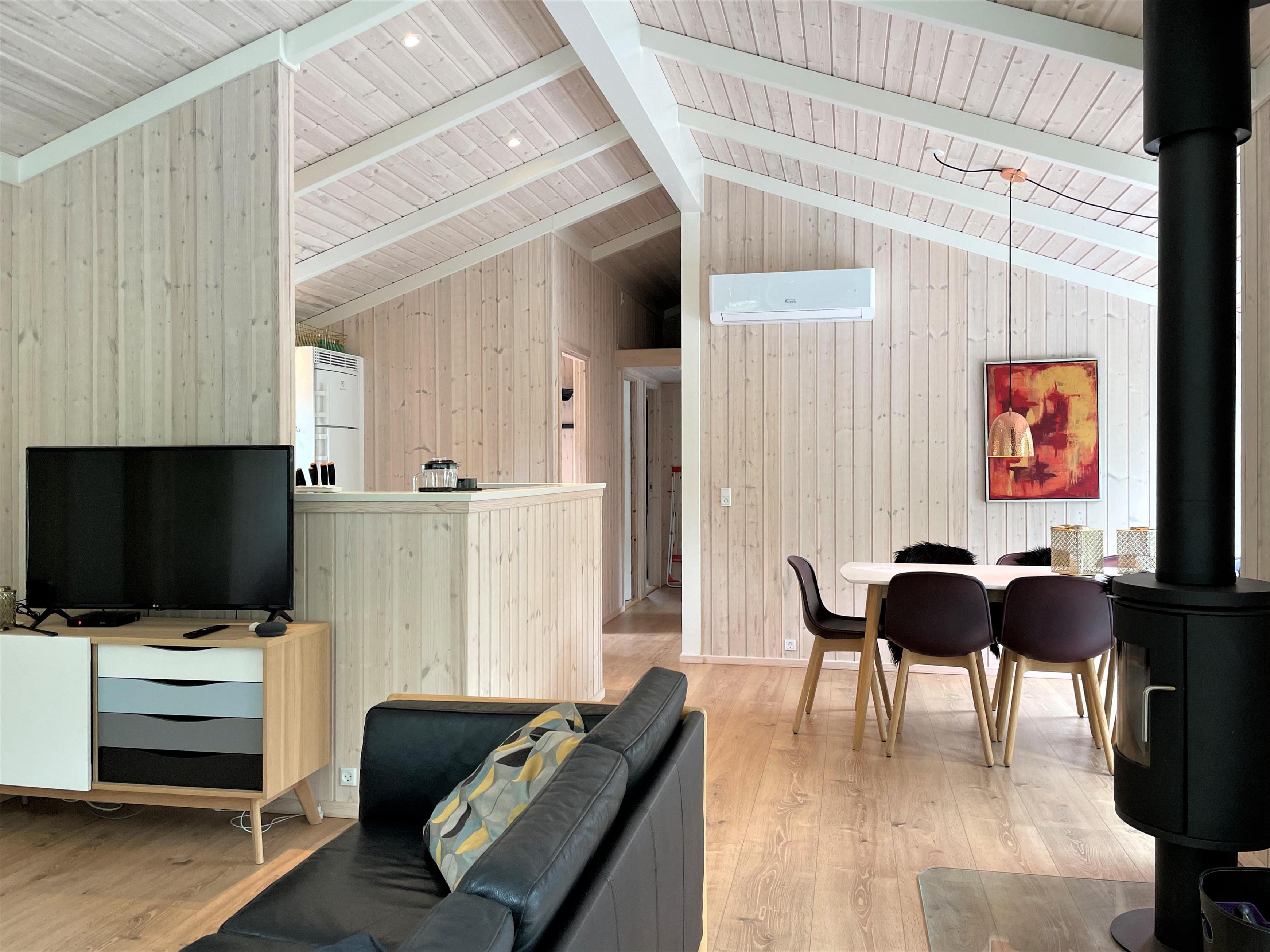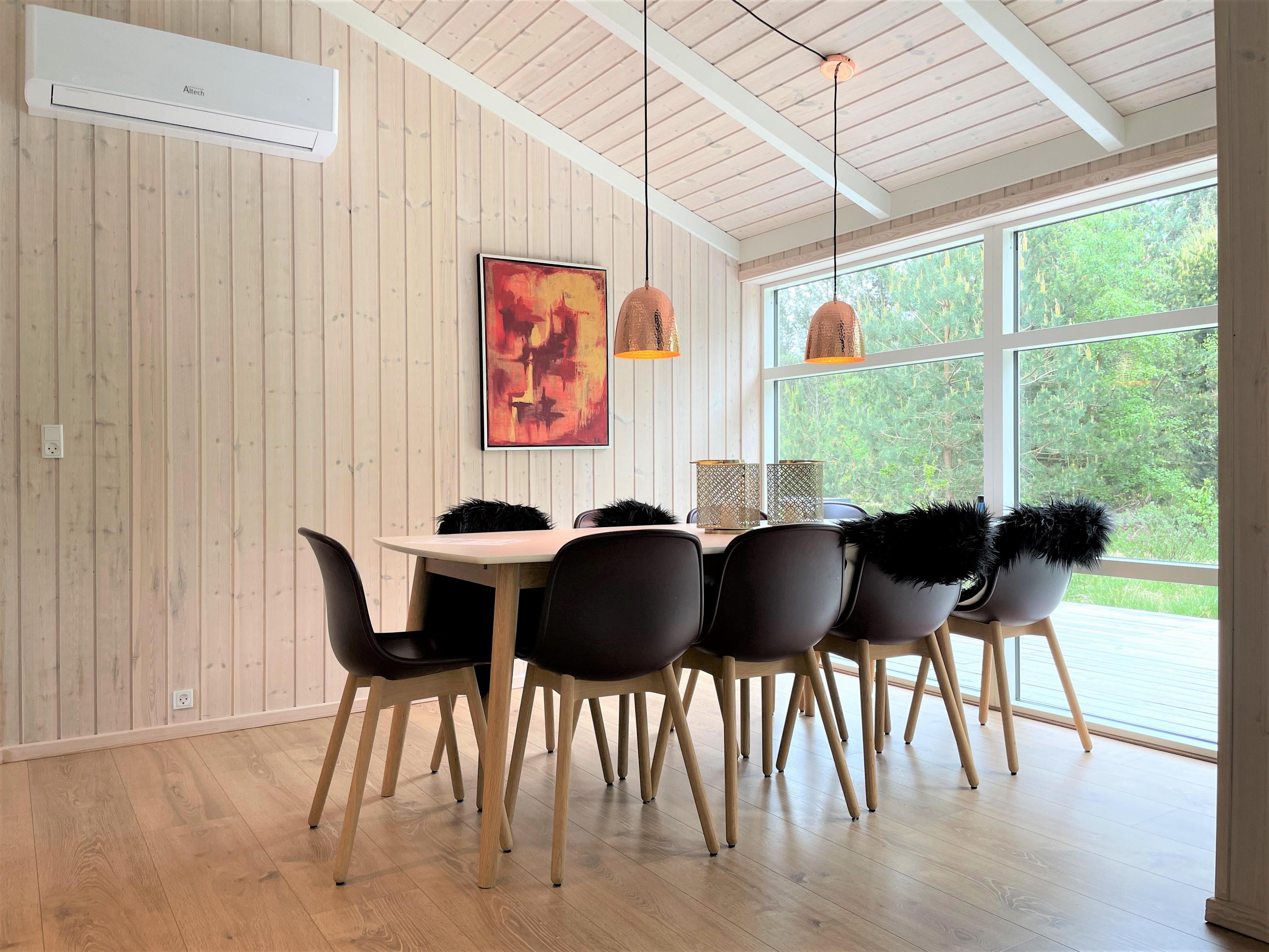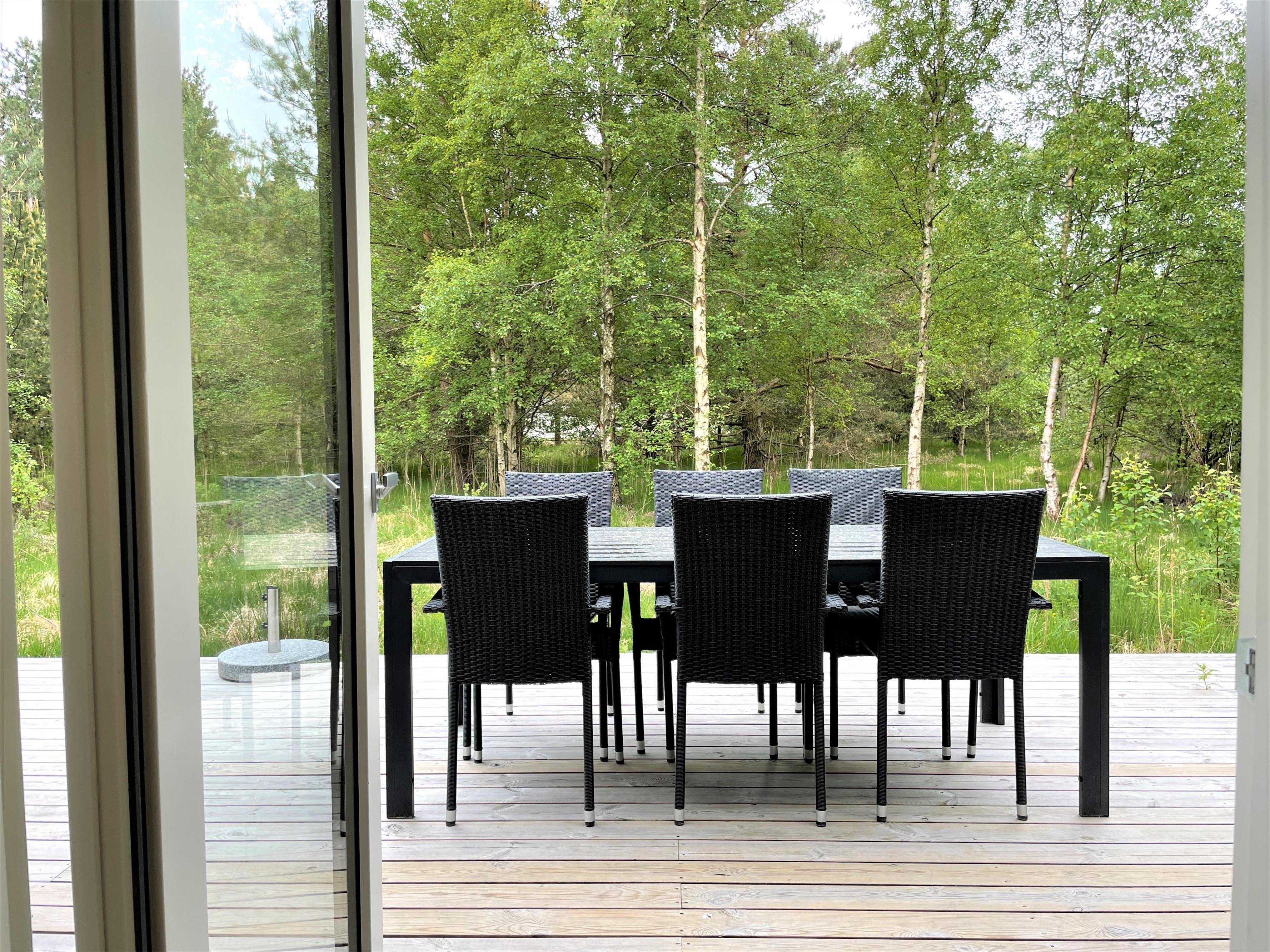 Dette pragtfulde nybyggede feriehus, som er i rigtig høj kvalitet både ude og inde, er huset, som indbyder til ferie og hygge i den rette atmosfære. Huset er praktisk indrettet for både voksne og børn. Veludstyret, moderne køkken i åben forbindelse med lys, komfortabel stue. Der er fire værelser med dobbeltseng (to af dem med 3/4 mål). To fine badeværelser med brus. Der er desuden træterrasse delvis rundt huset, hvor man altid kan finde en solkrog. Terrassen indeholder flere sæt havemøbler og grill, og den er omkranset af lyng/skovområde.