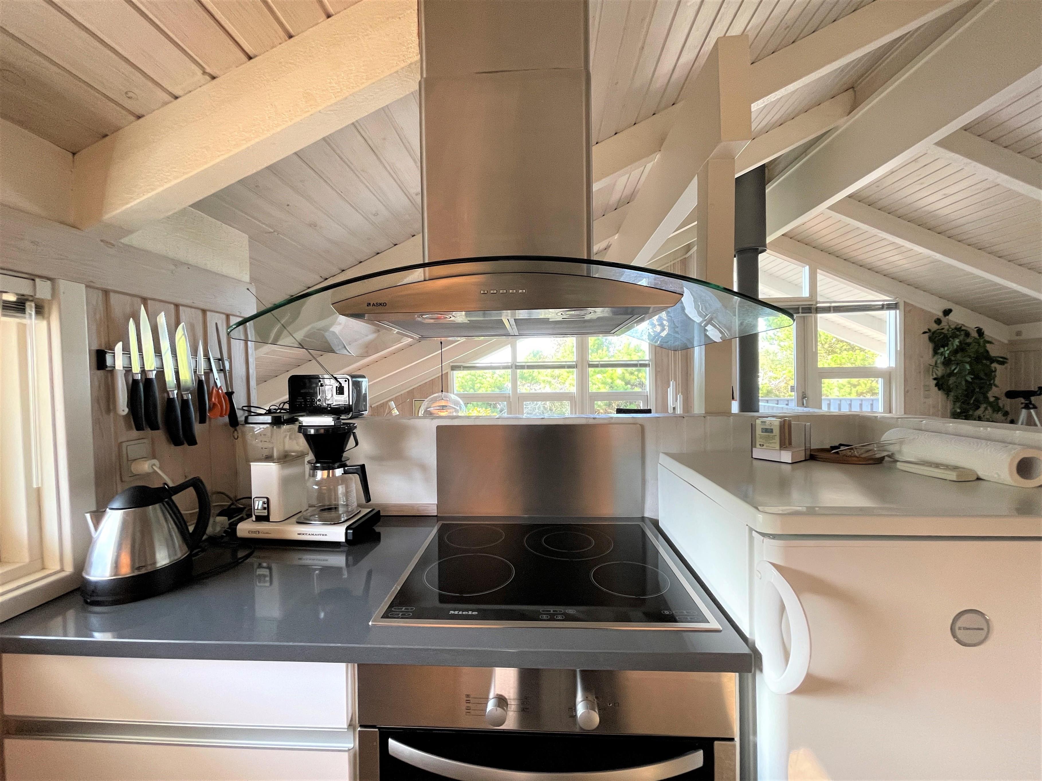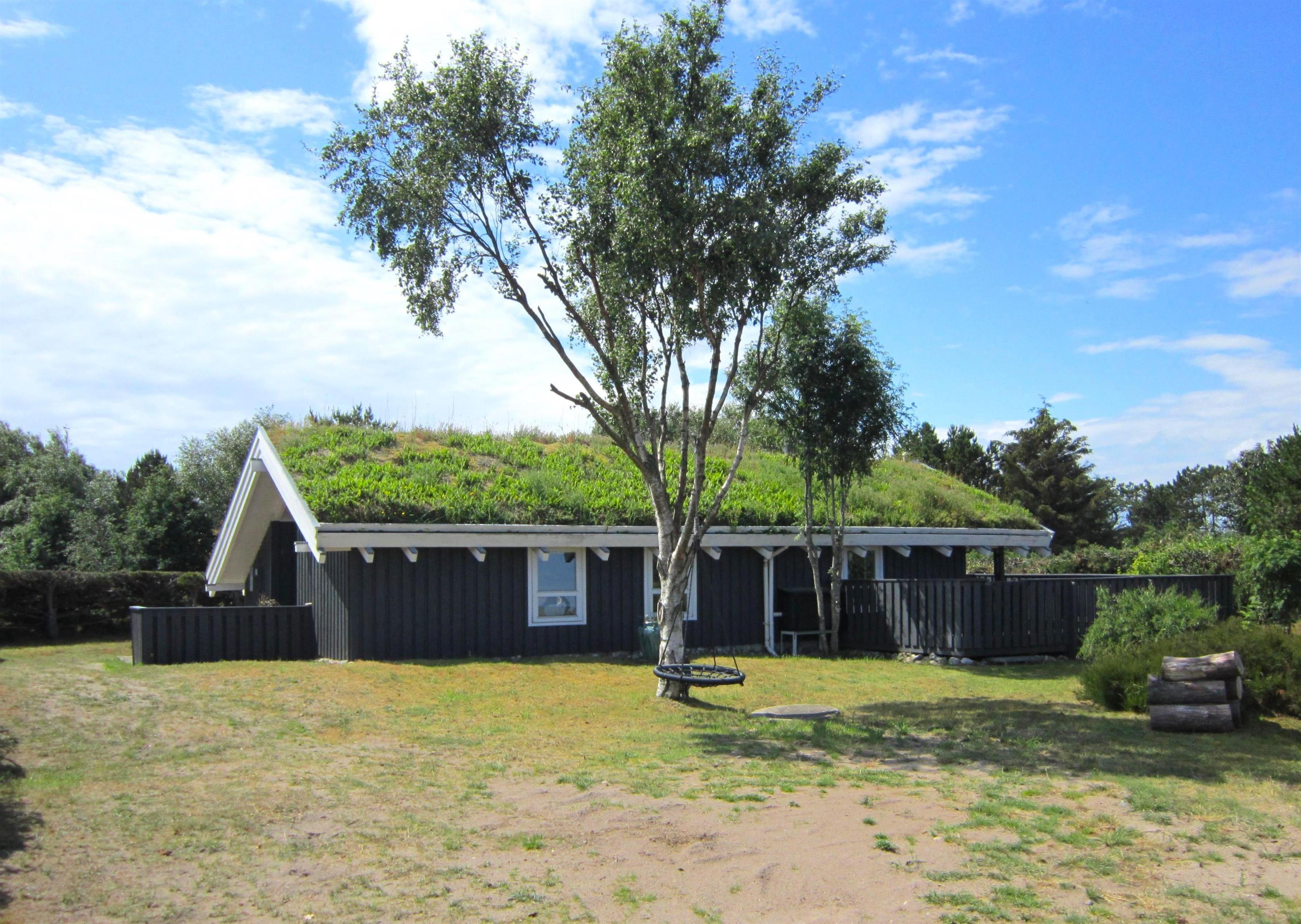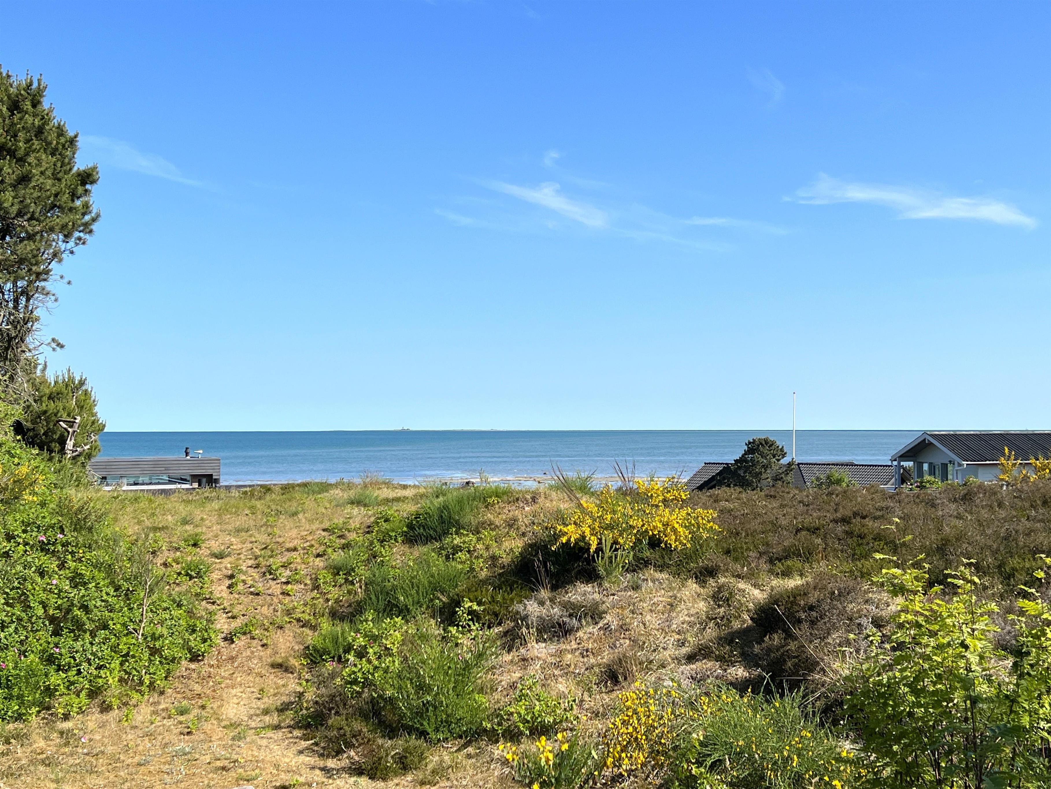 HAVUDSIGT. Et rigtig lækkert feriehus beliggende højt og på dejlig naturgrund med fantastisk havudsigt, lyngbevoksning og hyggelig bålplads, hvor hele familien kan samles. Huset er smagfuldt indrettet med et fint moderne køkken, - åbent til hyggelig stue/ spiseplads og sofakrog. Lækre, moderne møbler og inventar. Der er tre soveværelser i huset, hvor et er med dobbeltseng, et med 3/4 seng og et med køjeseng. Fint badeværelse med brus.