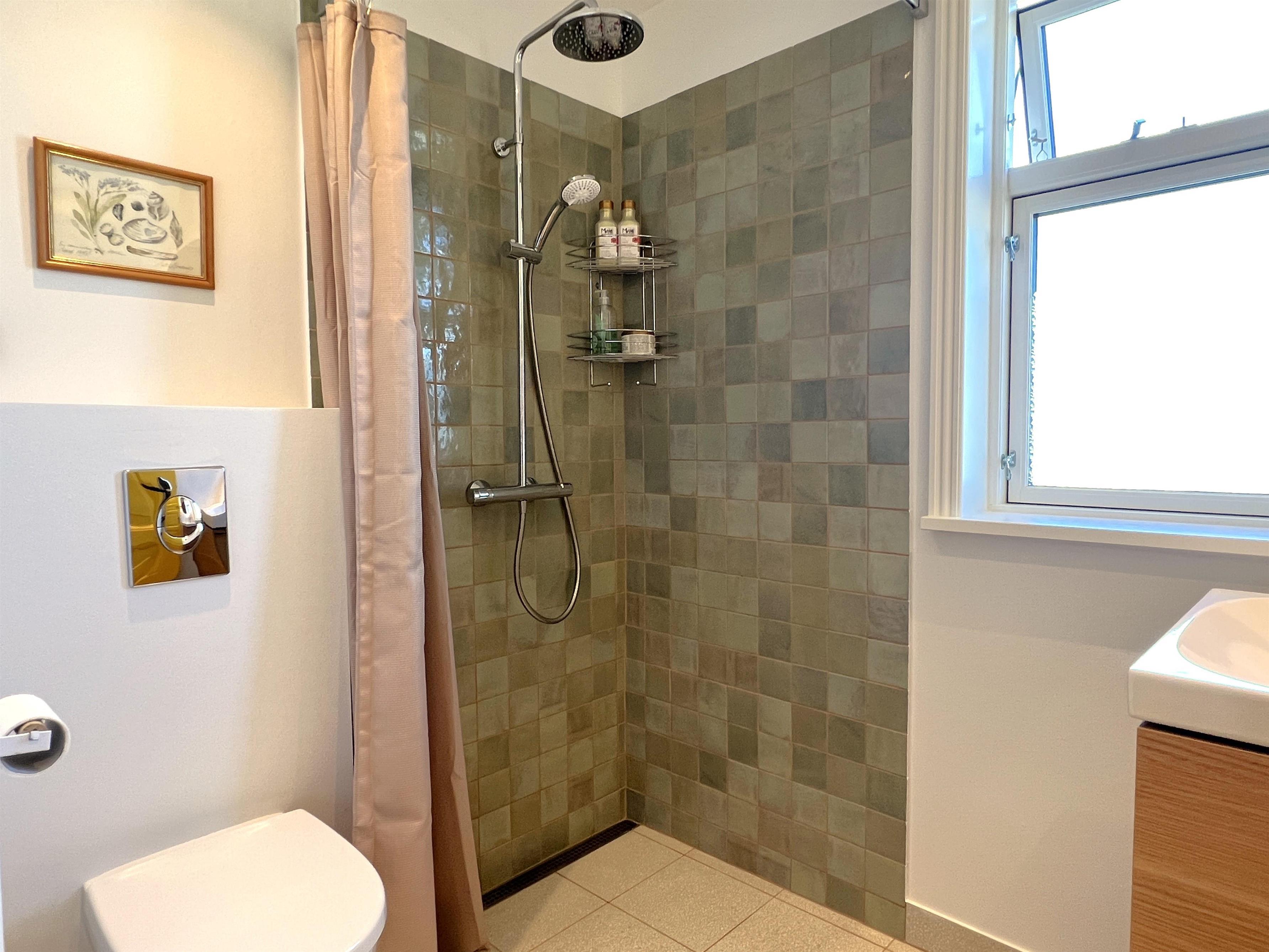 Der er et stort soveværelse med dobbeltseng, og rigtig god skabsplads. Soveværelset har, som de andre rum i huset, helt sin egen charmerende stil, og man vågner op til det smukkeste view over Kattegat. Fint nyt badeværelse med brus.