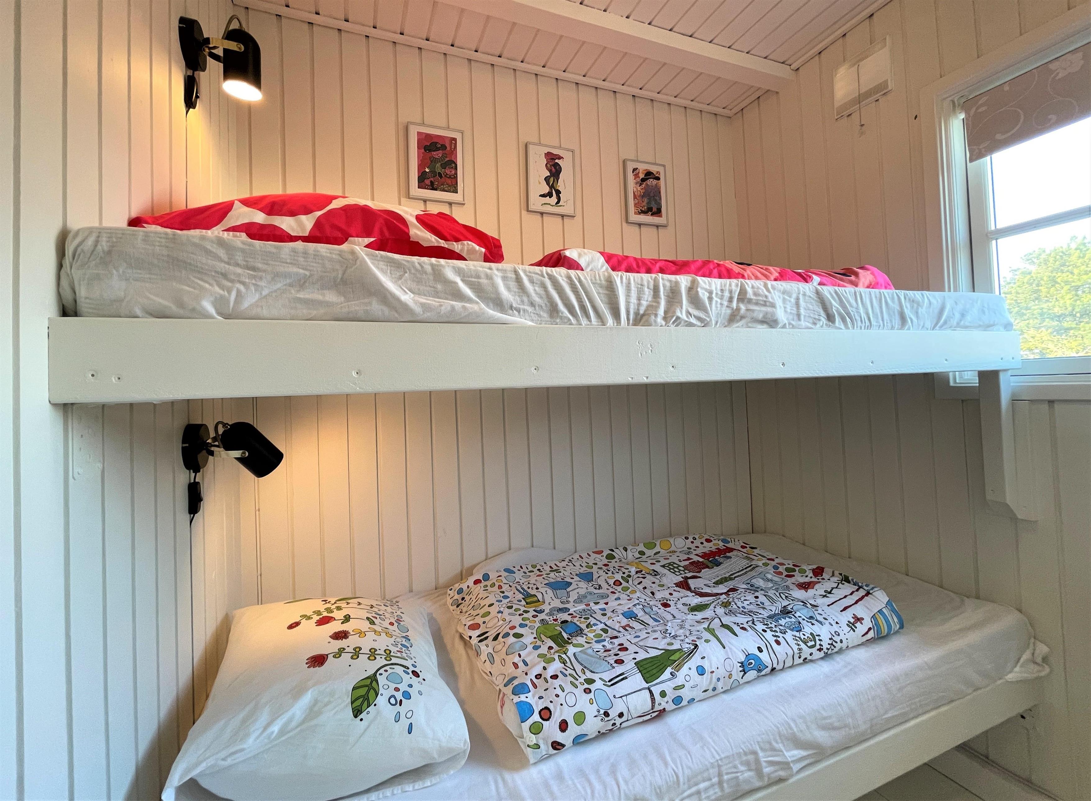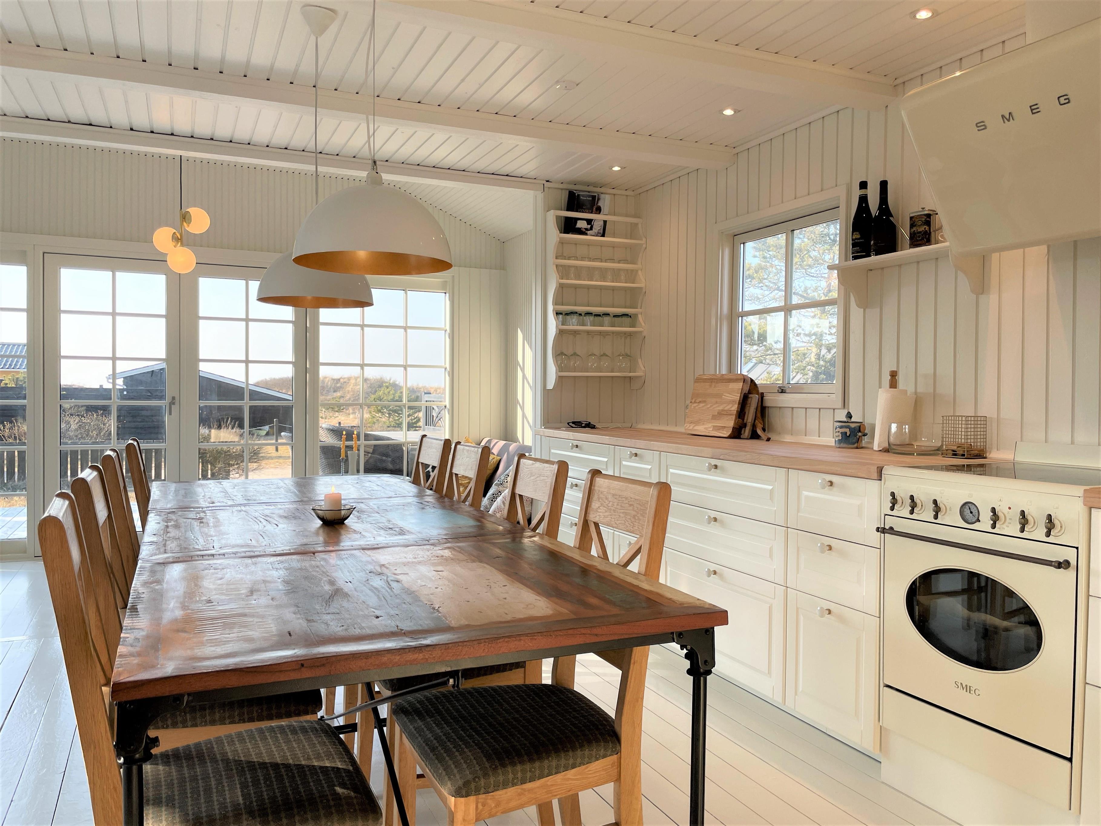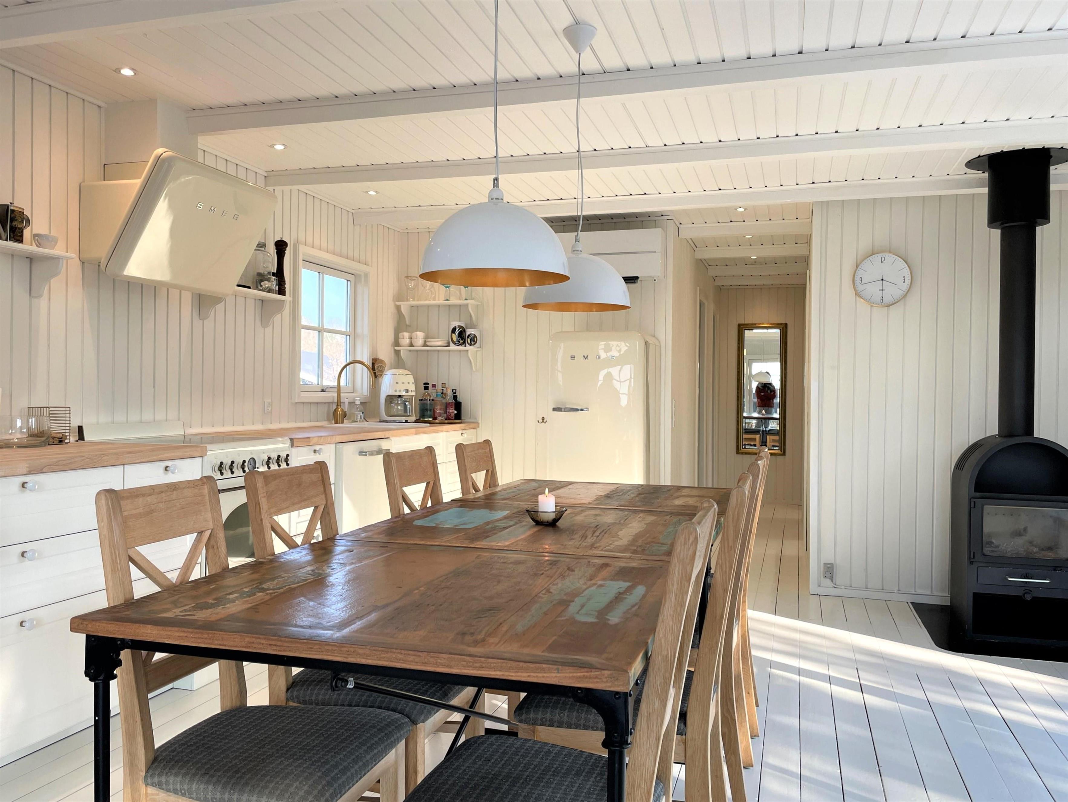 Huset er smagfuldt indrettet og med respekt for at bevare den hyggelige sommerhusstil. Lyst, lækkert køkken-alrum med moderne køkken, som er forsynet med hårde hvidevarer fra kvalitetsproducenten, SMEG. Flot, stort spisebord midt i rummet, som giver mulighed for at invitere gæster samt hyggelig sofaafdeling ud mod vandet. De store dobbeltdøre sikrer et flot lysindfald i hele rummet, og der er let adgang til den store træterrasse, hvor havemøbler og solstole findes. Huset har desuden tre soveværelser, et med dobbeltseng, et med to enkeltsenge samt et med køjeseng, der måler 190 cm. Nyt, moderne badeværelse med gulvvarme.