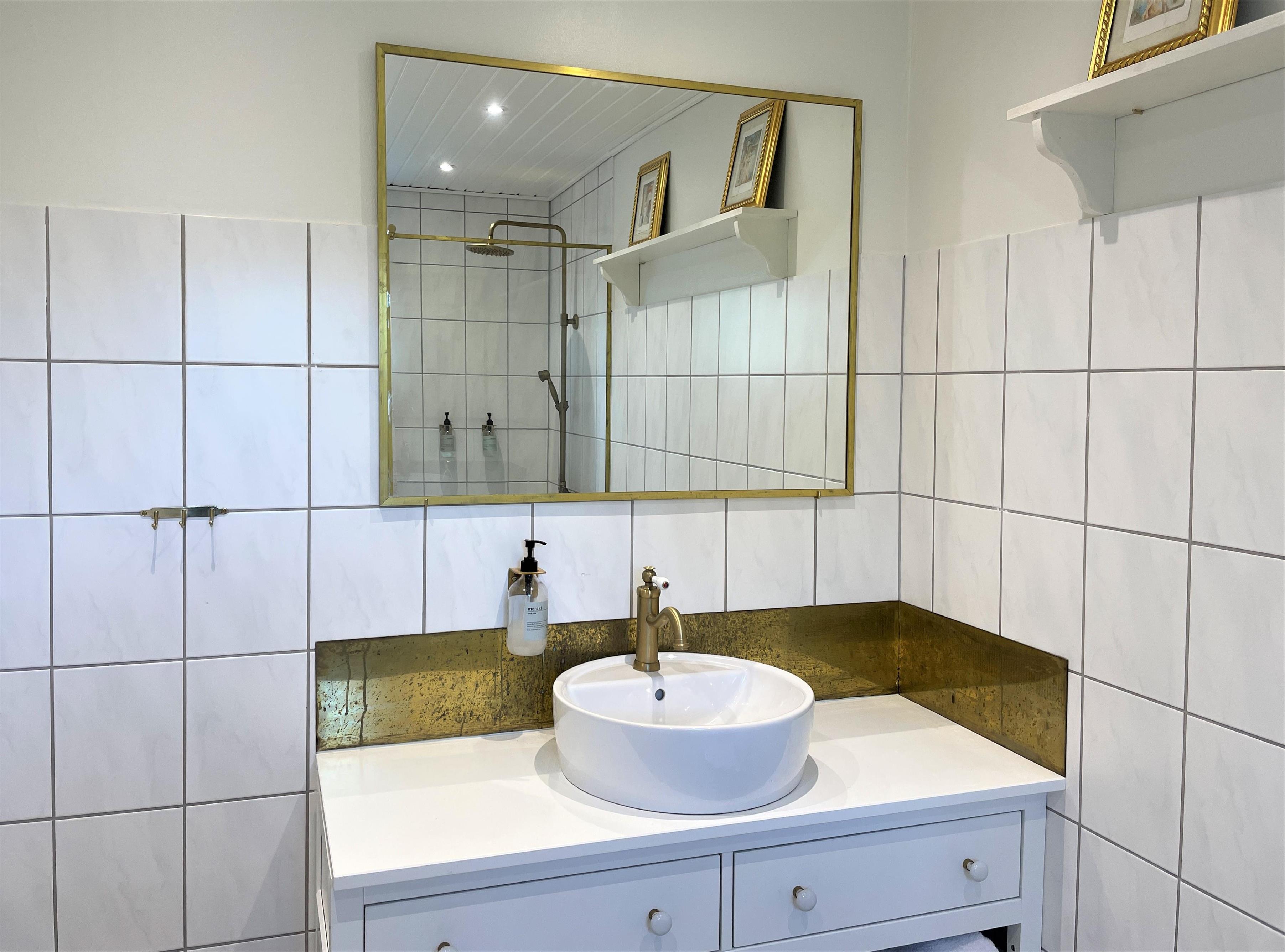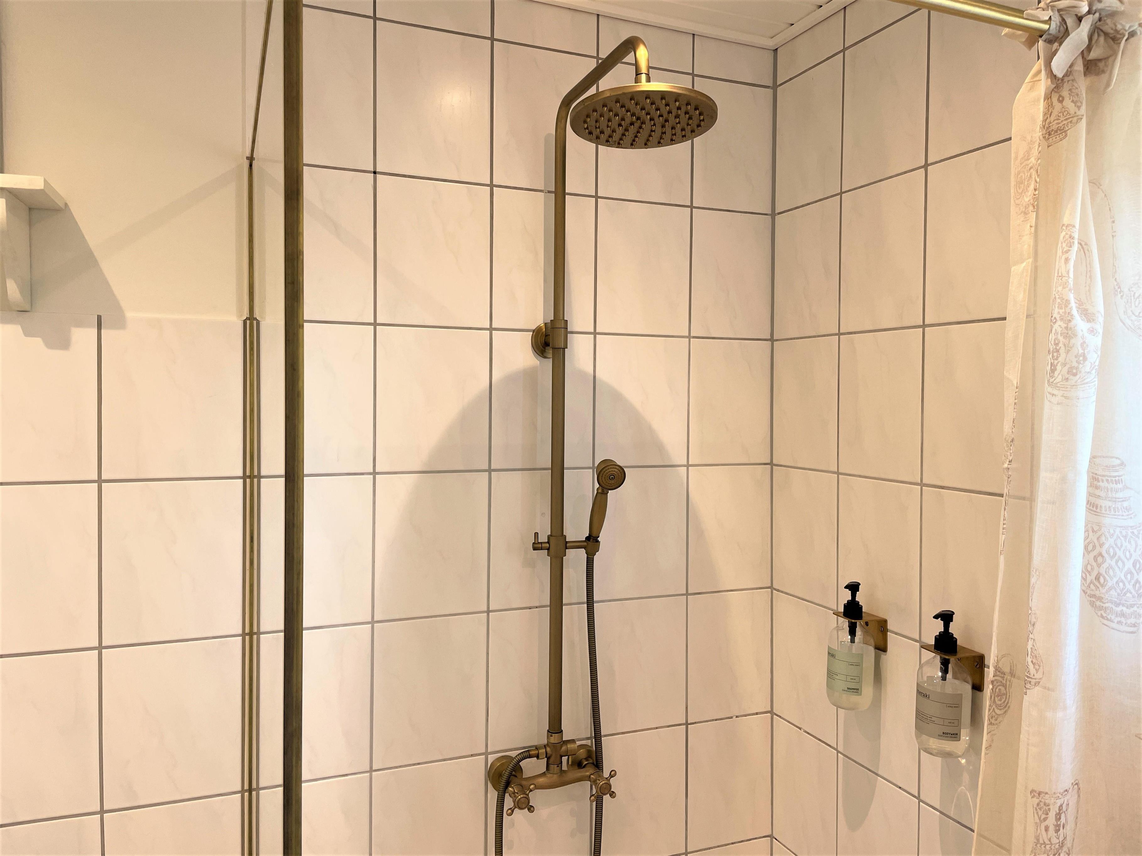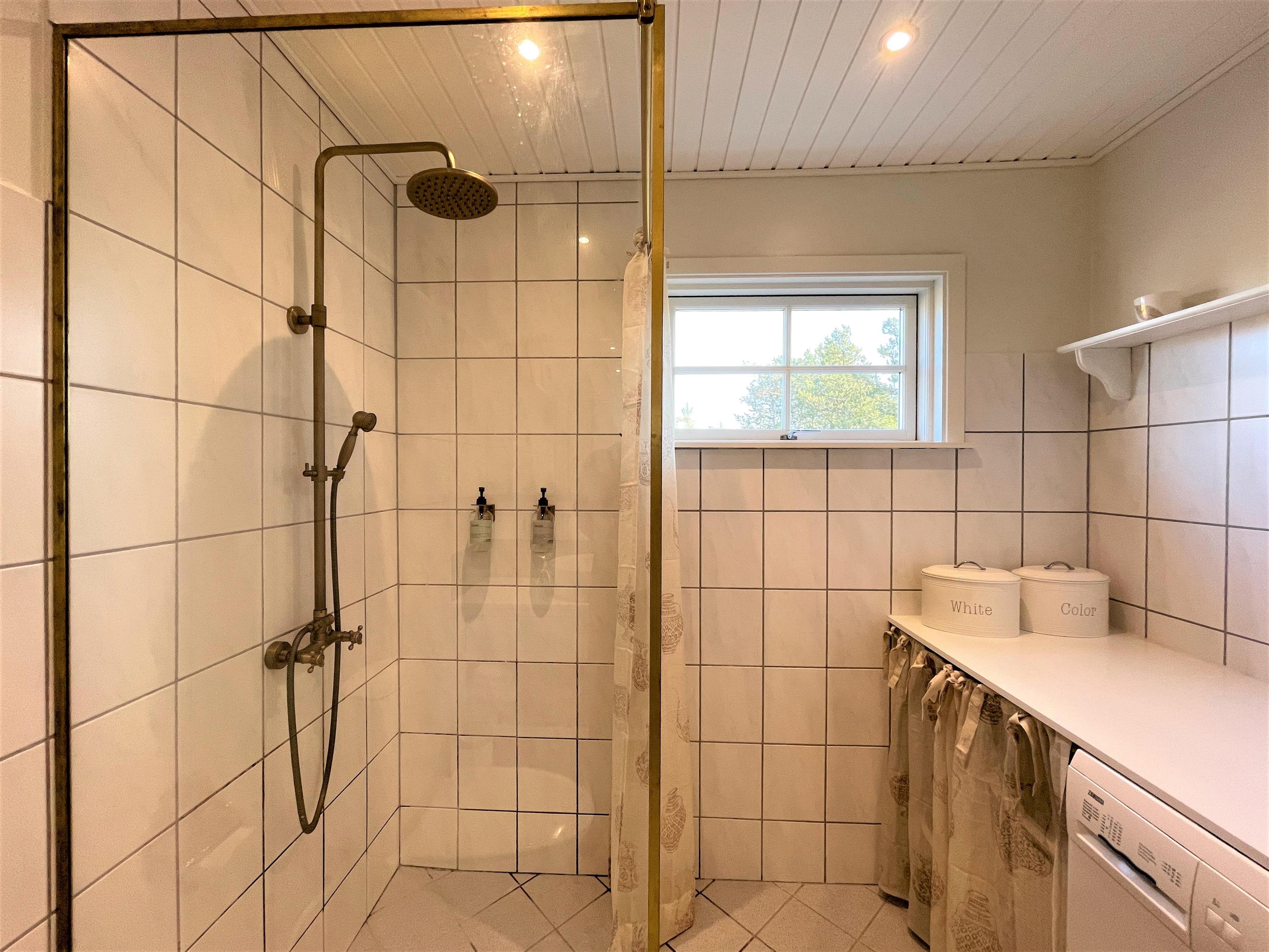 På husets træterrasse er der udtræk, der skaber ekstra læ, og man kan også benytte husets gasgrill. Udendørsbruser til at skylle sig, efter dagens strandtur.