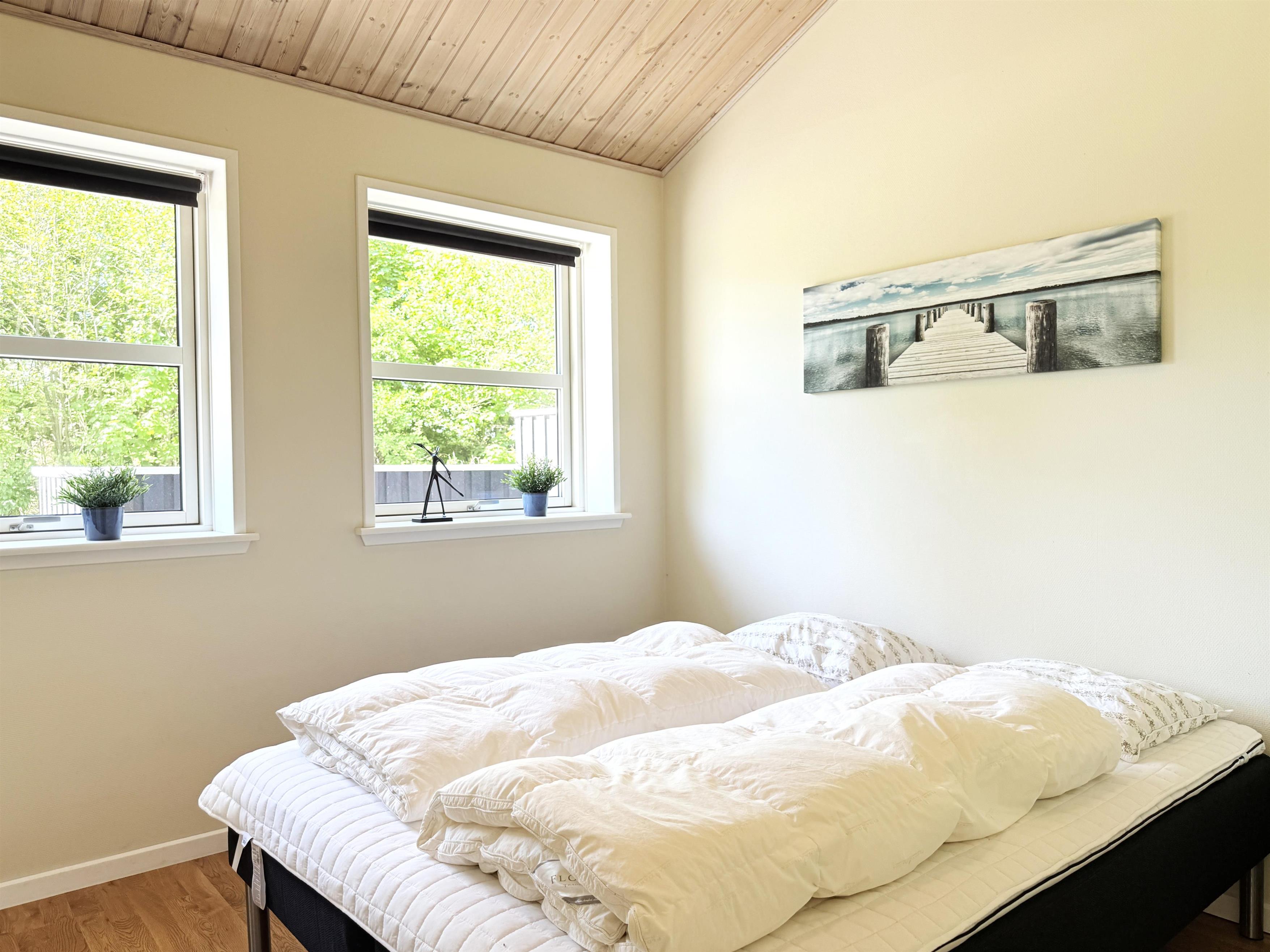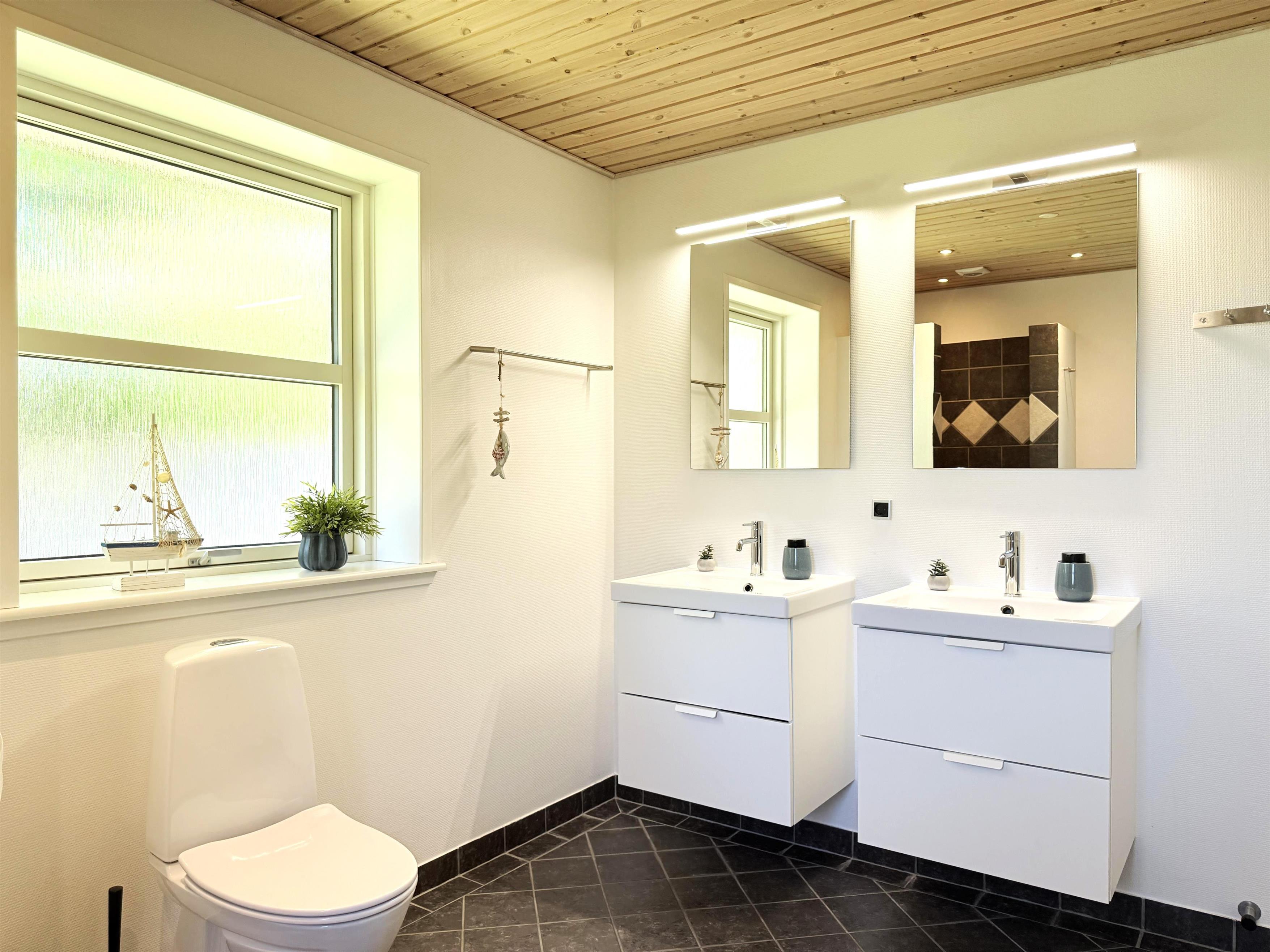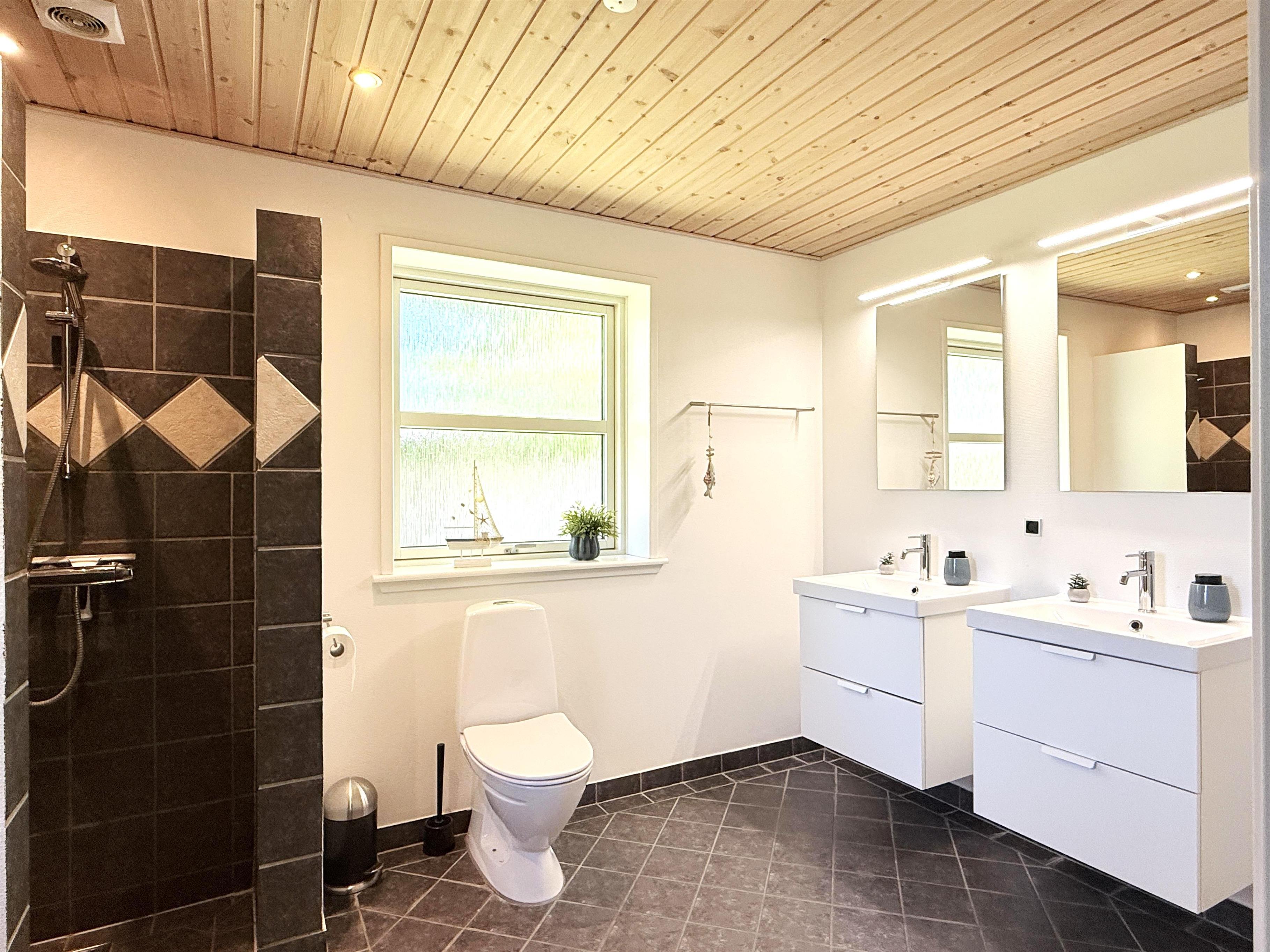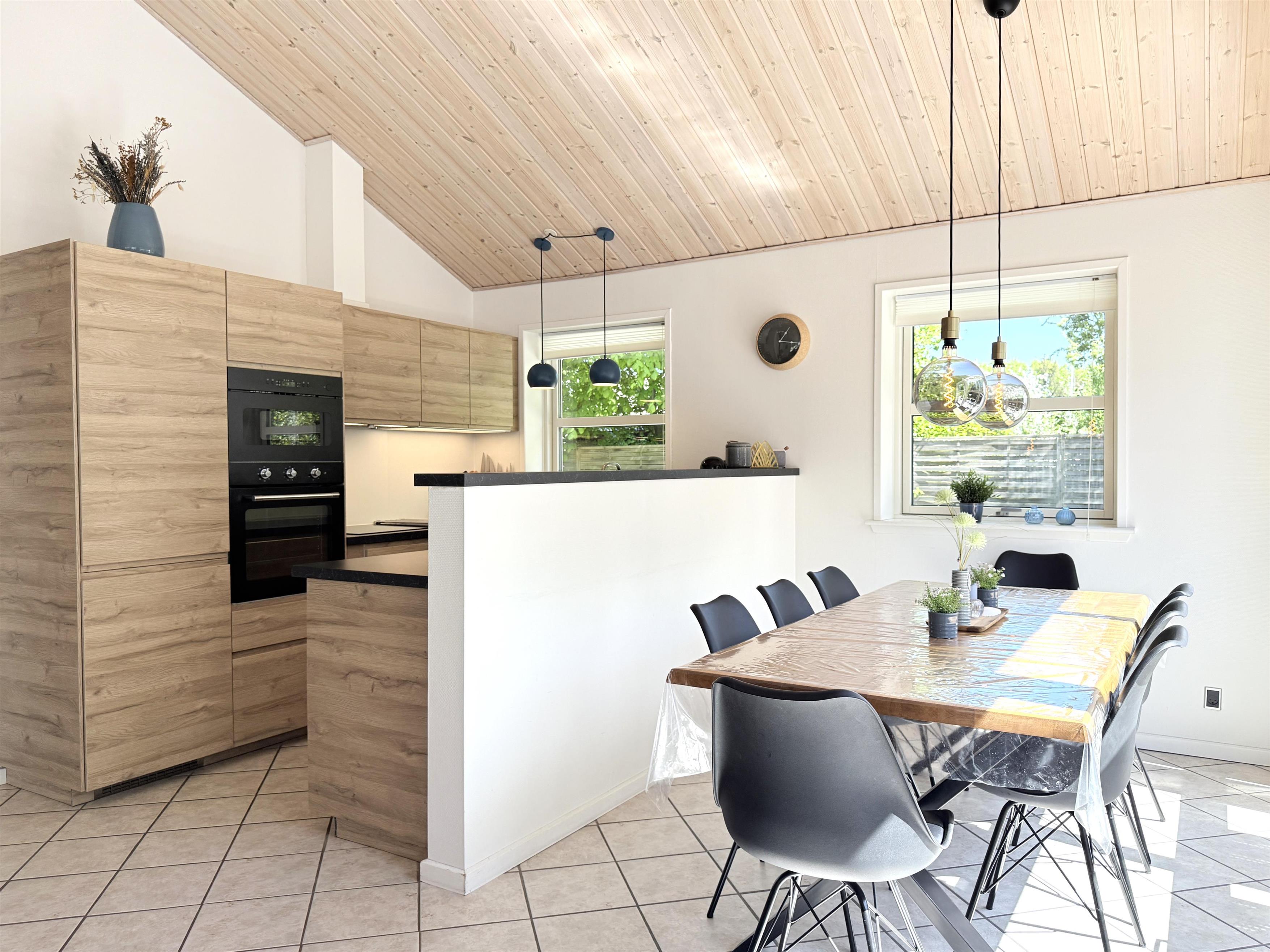 Huset har et skønt, moderne køkken-alrum med spiseplads og hyggeligt sofaarrangement, hvor der er plads til den store familie. Der er tre gode soveværelser, hvoraf to har dobbeltsenge og det tredje har to enkeltsenge. Der er god skabsplads og yderligere en rummelig hems med to ekstra sovepladser. Der er hele to flotte, store badeværelser med brus, og et pænt bryggers med vaskemaskine og tørretumbler. Huset har også sauna i forbindelse med det største badeværelse. Der er endvidere installeret vildmarksbad pr 1. marts. På de store træterrasser kan husets dejlige solkroge og havemøbler benyttes, og der er rig mulighed for skønne grillaftener.