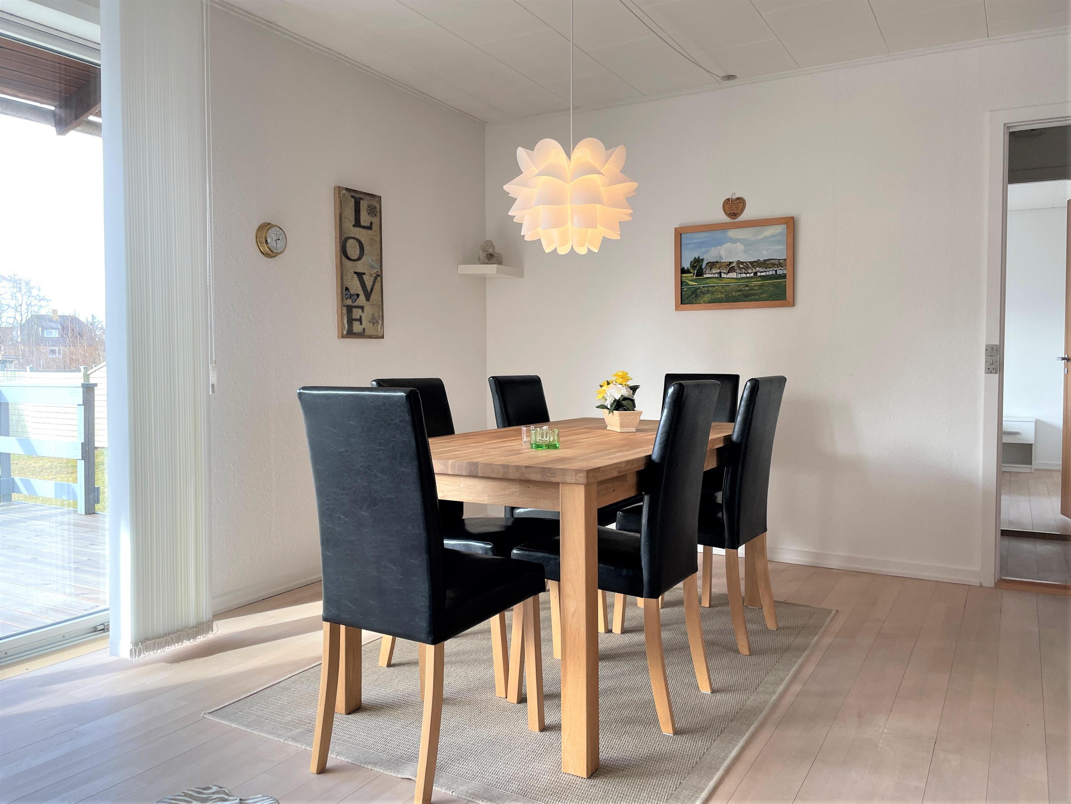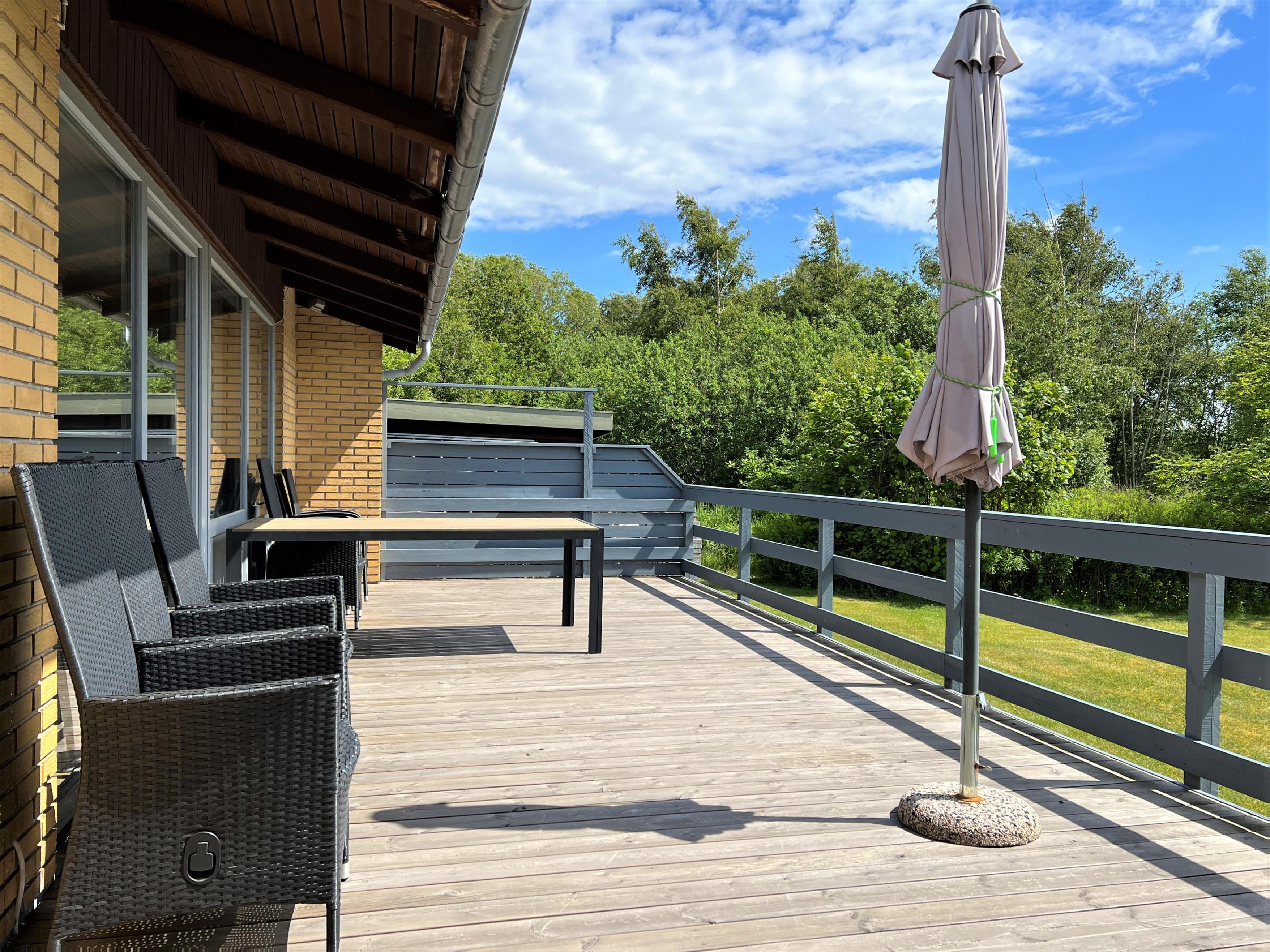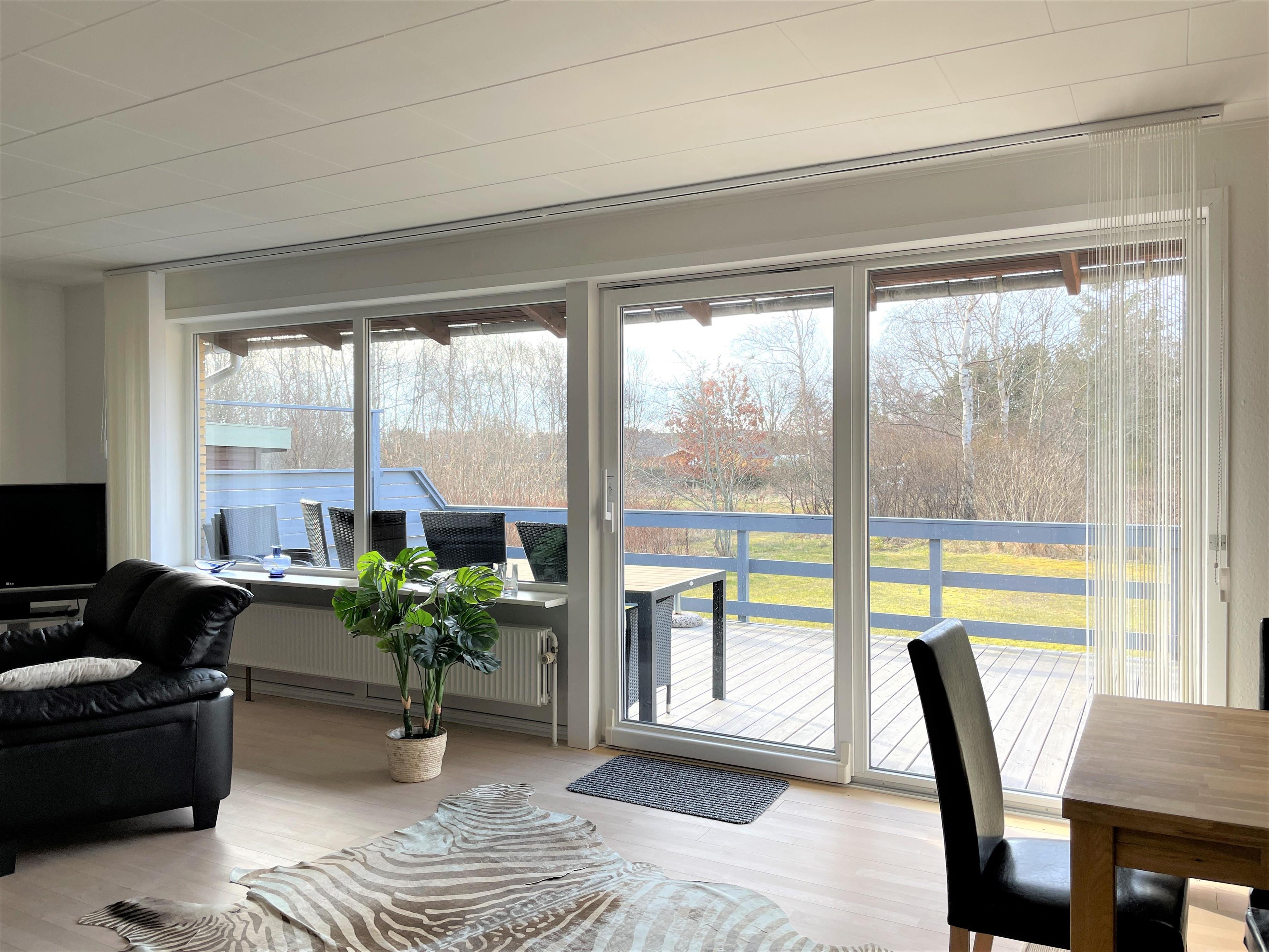 Denne skønne feriebolig er et halvt rækkehus. Stor lys og rummelig stue med sofagruppe og spiseplads. Fra stuen er der udgang til sydvendt træterrasse med havemøbler. Dejlig solrig have med græsplæne og naturgrund med småtræer.