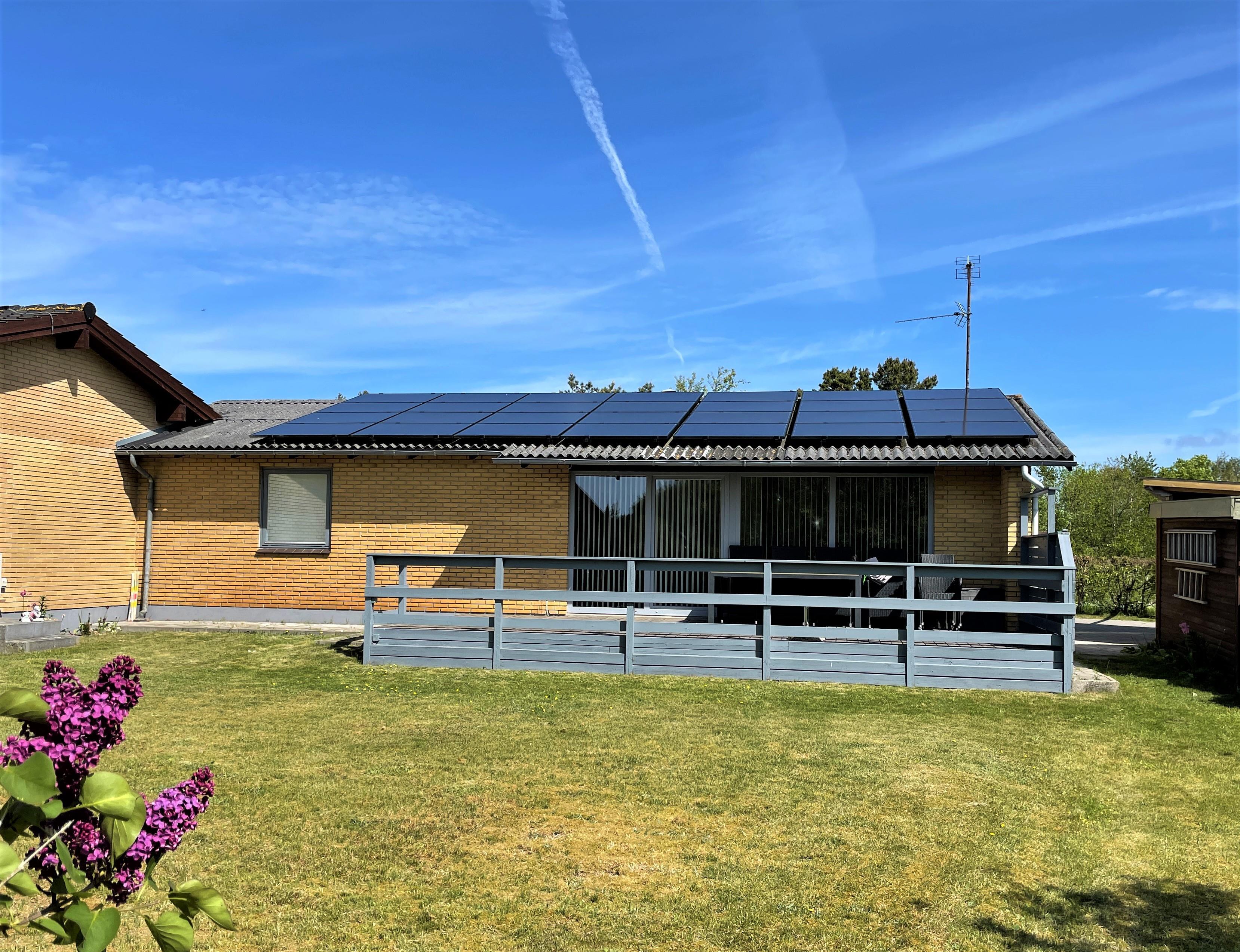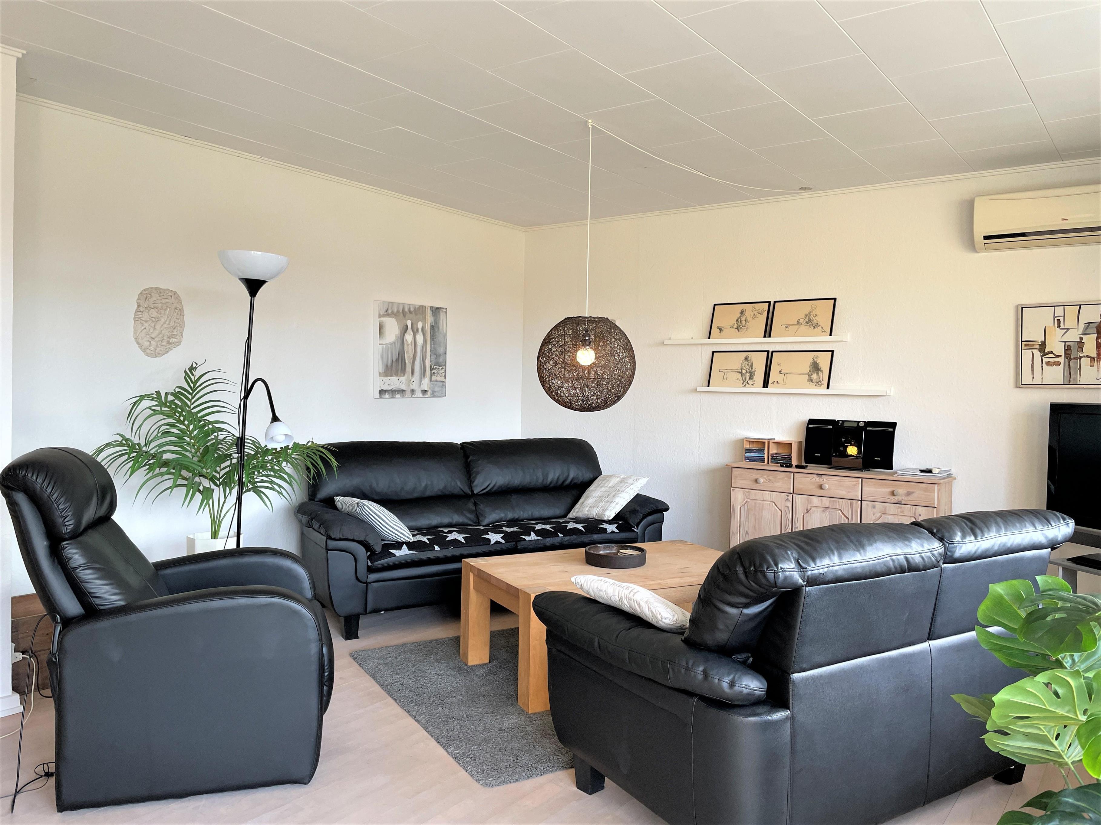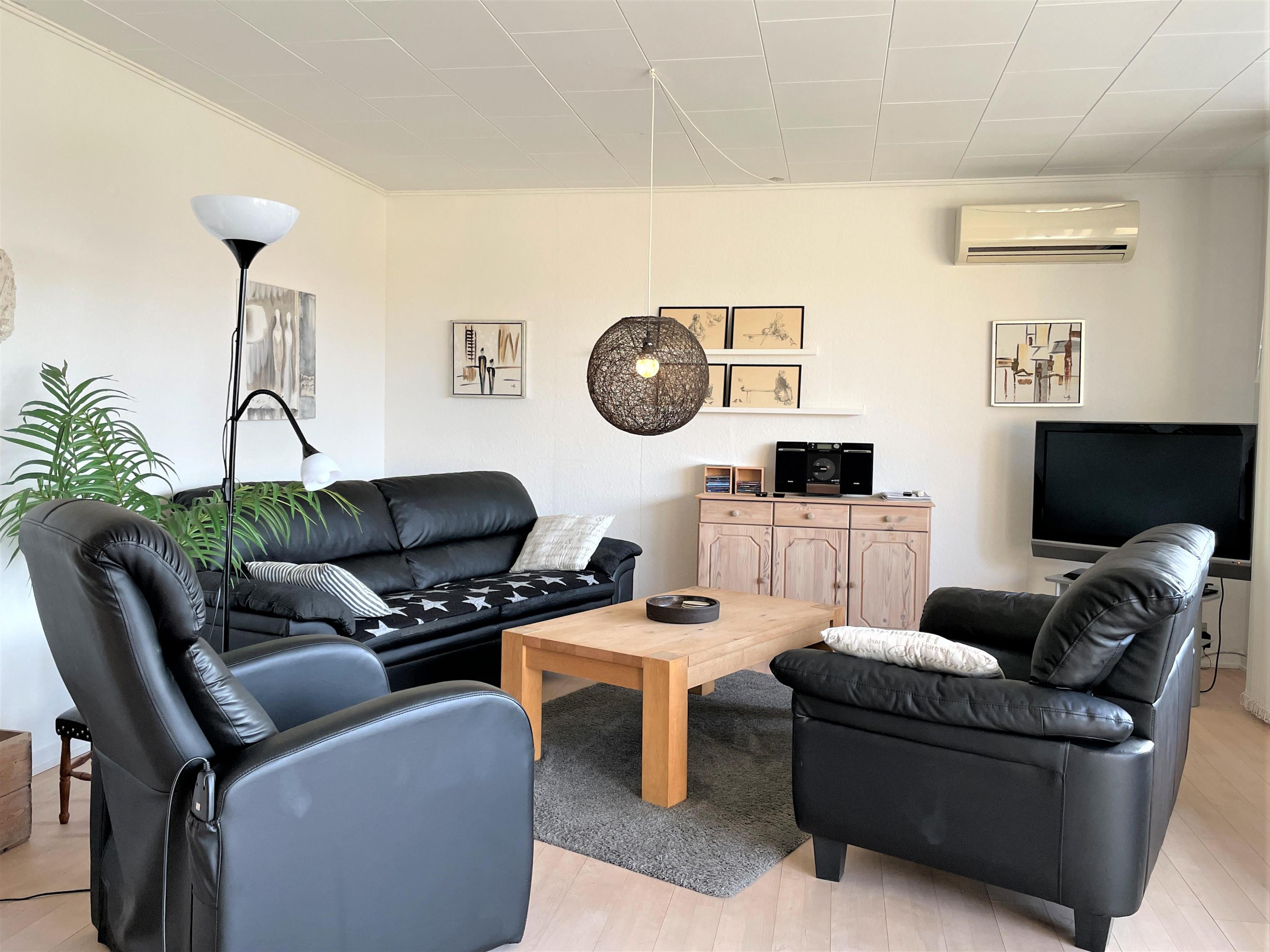 Denne skønne feriebolig er et halvt rækkehus. Stor lys og rummelig stue med sofagruppe og spiseplads. Fra stuen er der udgang til sydvendt træterrasse med havemøbler. Dejlig solrig have med græsplæne og naturgrund med småtræer.