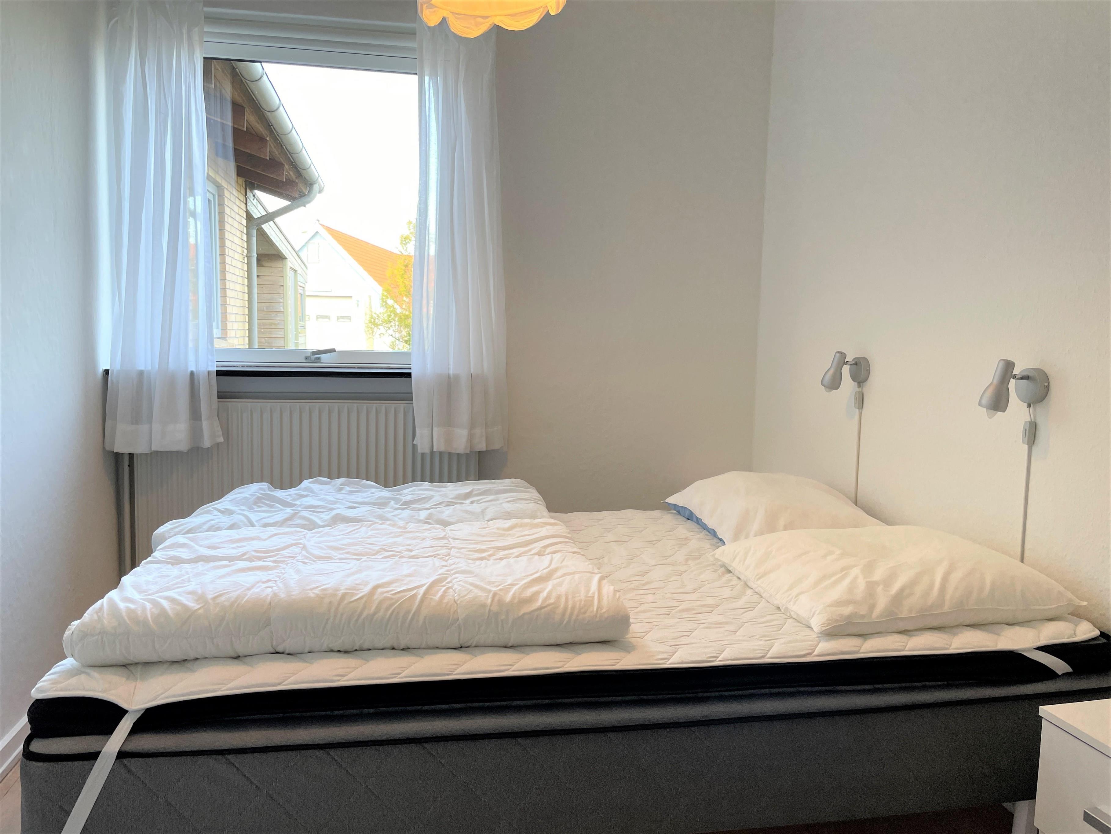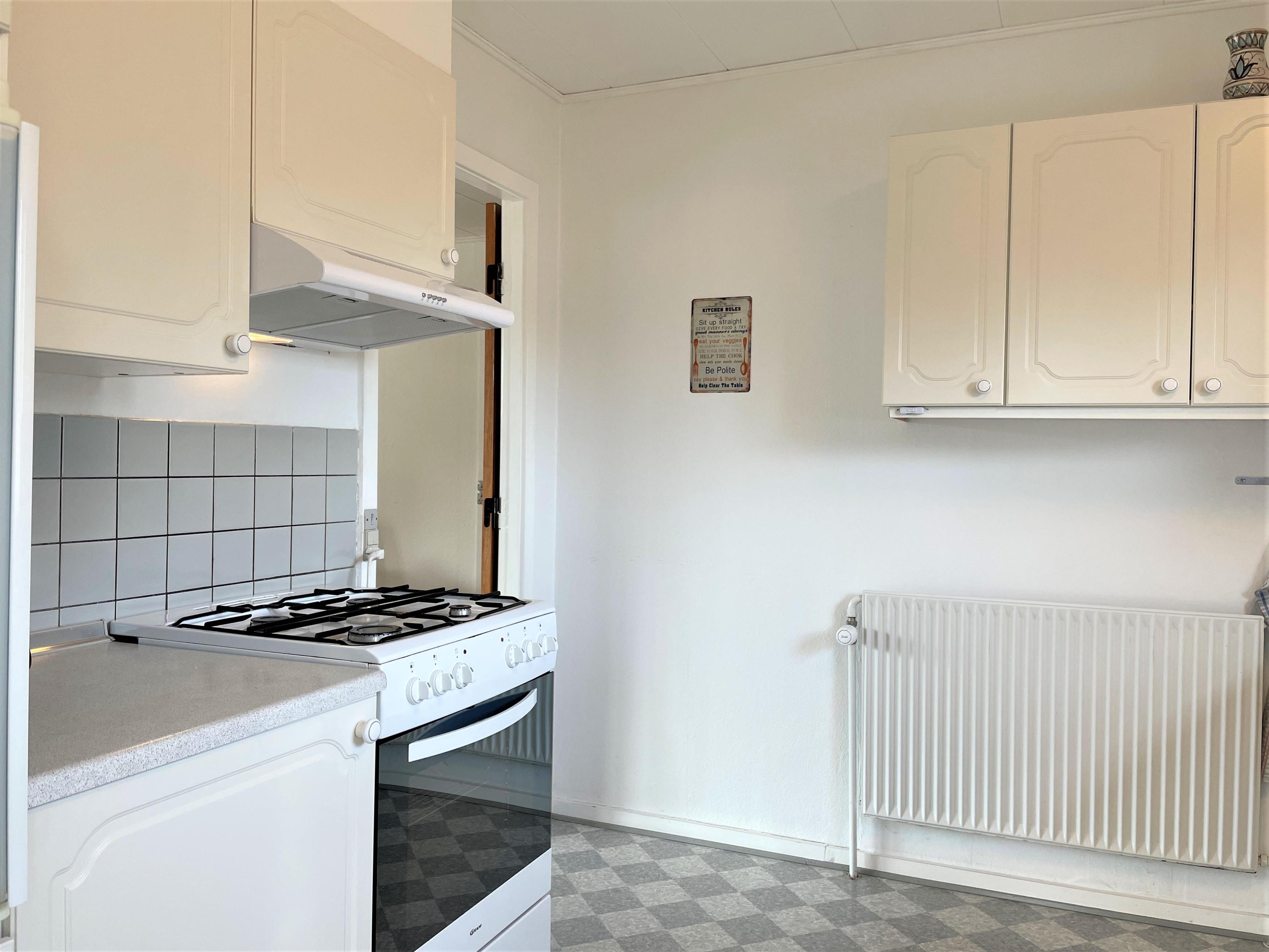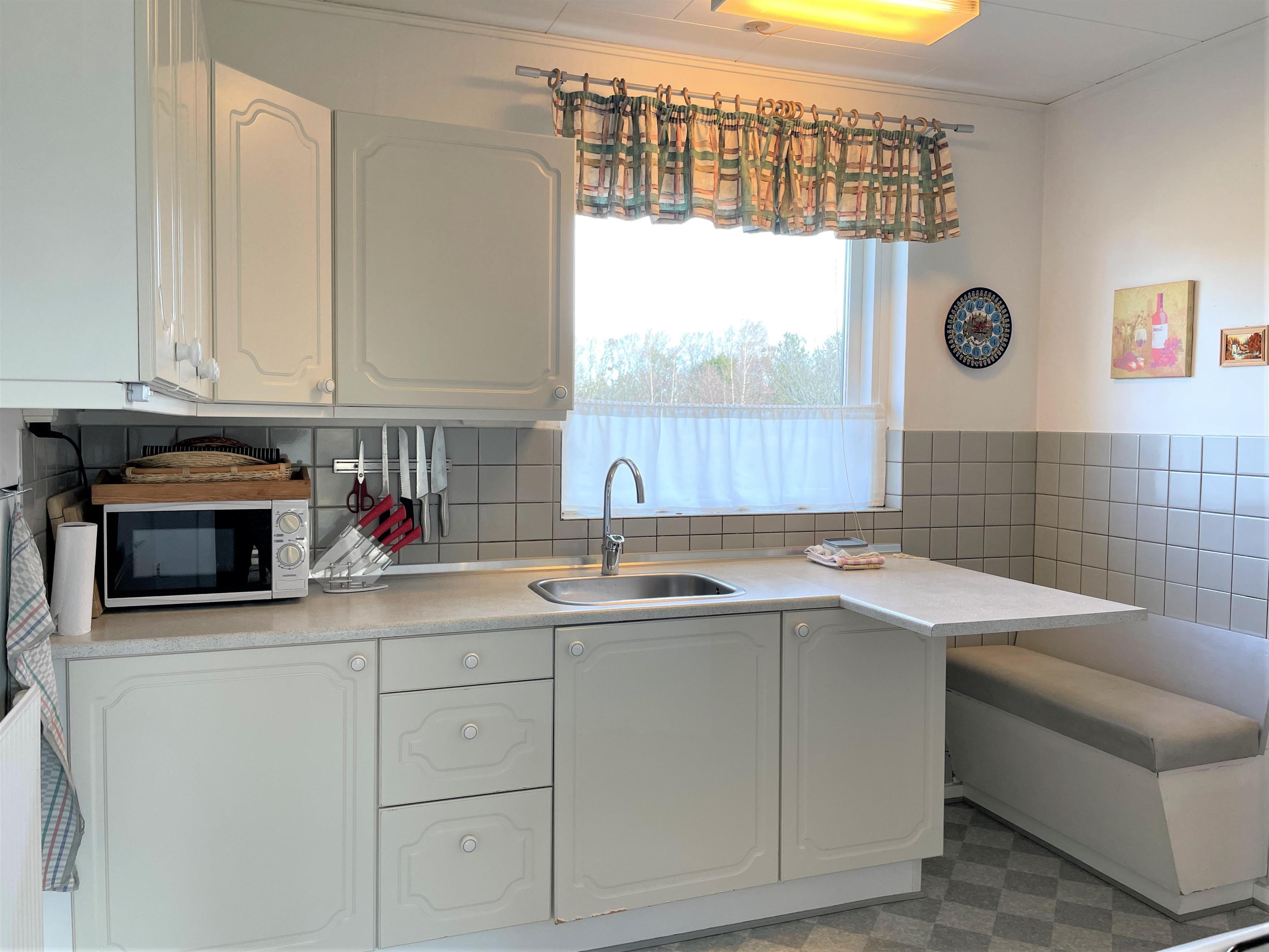 Køkken med lille hyggelig spisekrog. Nyrenoveret badeværelse. To soveværelser med gode dobbeltsenge, og et soveværelse med bred køjeseng.