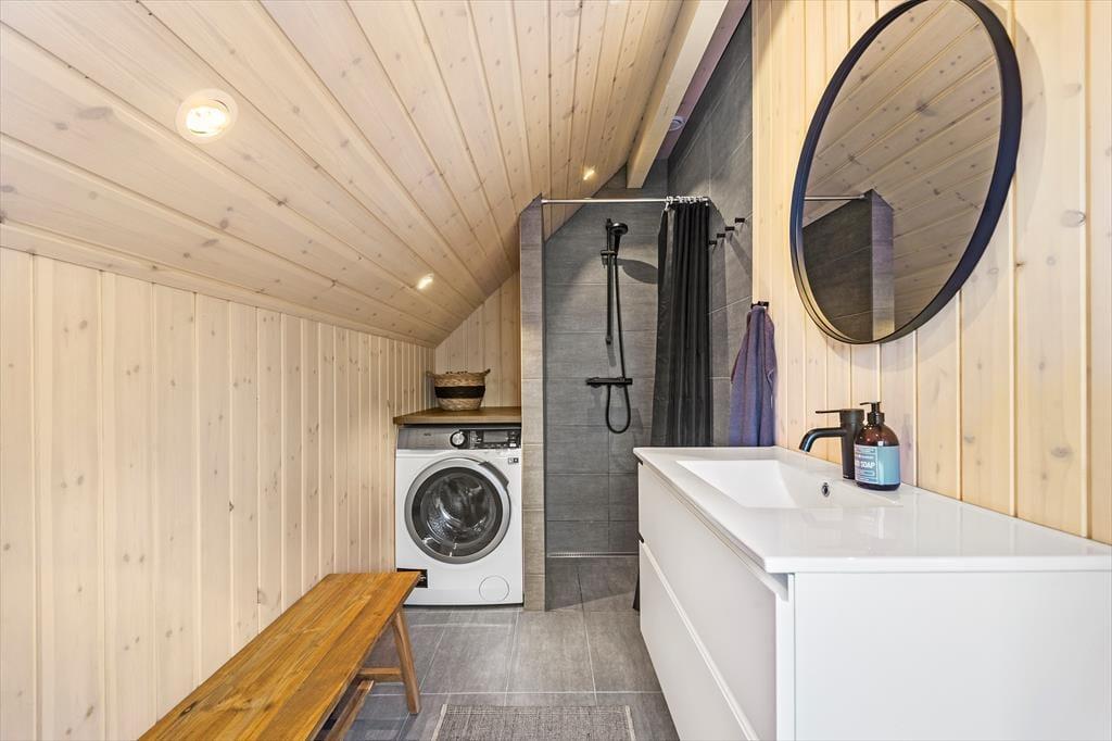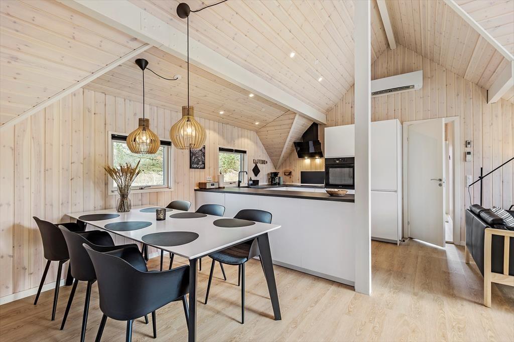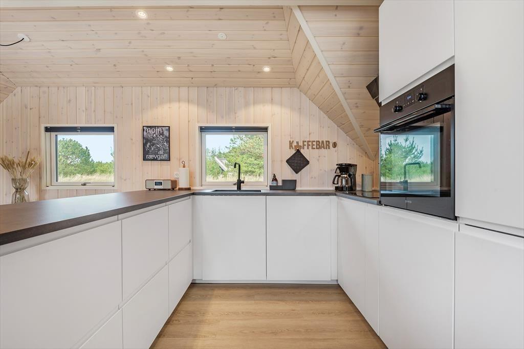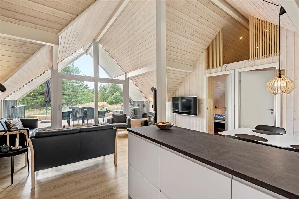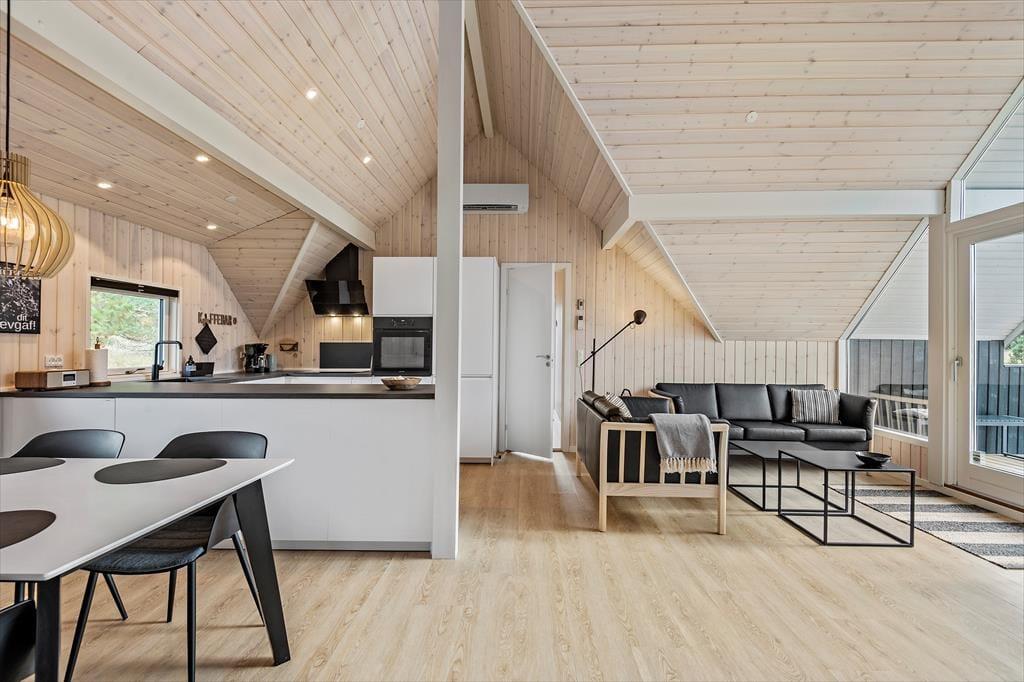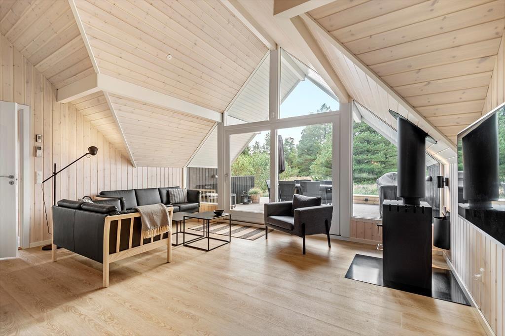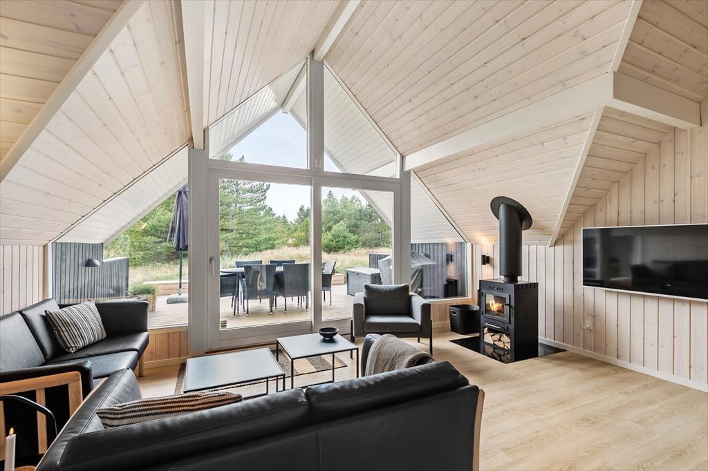 De lyse farvetoner, det stilrene møblement og loftet, der går helt til kip, er med til at skabe en let og indbydende atmosfære inden døre. Stuen og det moderne køkken ligger samlet midt i huset, og her er der brændeovn og varmepumpe såvel som et stort gavlvindue og direkte udgang til husets sydvestvendte terrasse. Rummets fladskærm med både kabel-tv og Apple TV sørger for underholdning, hvis du trænger til en pause i sofaen – og derudover er der også tv på to af de tre soveværelser, der alle er udstyret med gode dobbeltsenge. Planløsningen byder også på et lækkert badeværelse med bruseniche, og fra stuen kan du tage en stige op til hemsen, der fungerer som en glimrende hyggekrog.