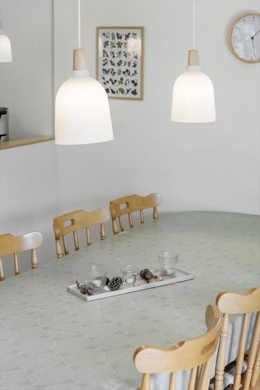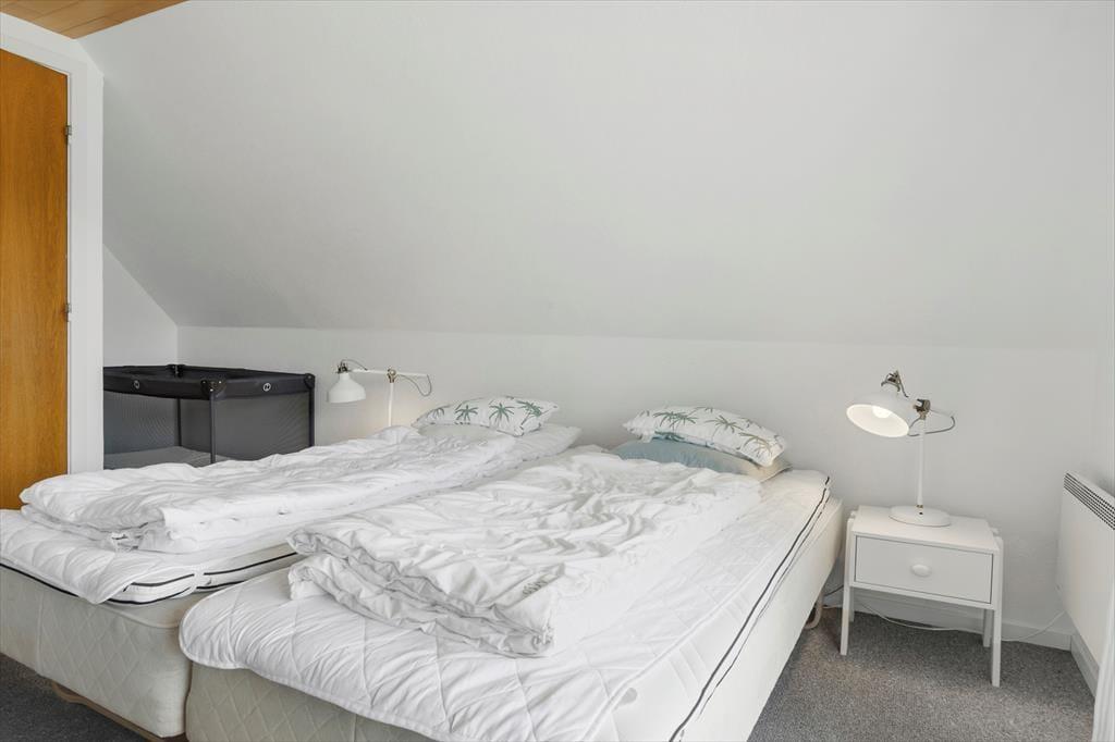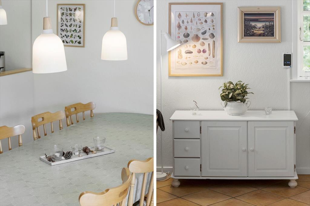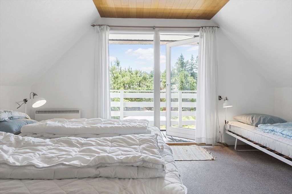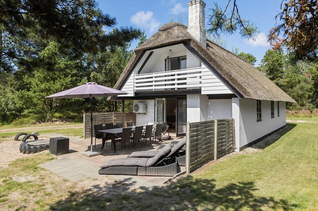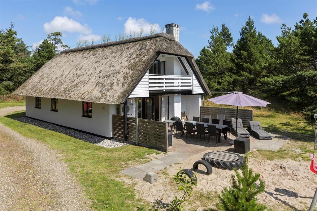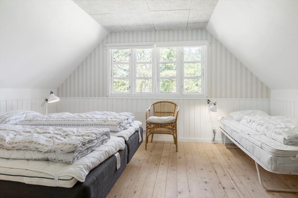 Sommerhuset er en klassisk model med stråtag, så det passer smukt ind i Rømøs flotte naturomgivelser. Både inde og ude fremstår huset pænt og velholdt, for det er blevet renoveret i 2021 – hvilket blandt andet kan ses på stueetagens badeværelse og førstesalens toilet, der begge er indrettet med moderne interiør. På klassisk manér er der stadig sauna på badeværelset, hvilket er en skøn detalje, så du kan koble helt af i varmen efter dagens udflugter. Ellers kan hyggestunderne foregå i stuen, som er et dejligt opholdsrum med brændeovn og åbent køkken. Soveværelser er der tre af: I stueplan ligger et værelse med dobbeltseng, og på førstesalen er de to soverum begge indrettet med en dobbeltseng og en enkeltseng, så alt i alt er der plads til otte feriegæster i huset.