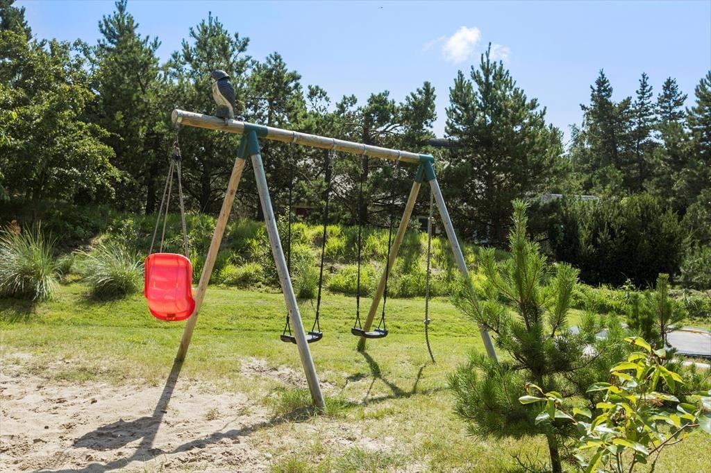 Fra det ene af førstesalens soveværelser har du direkte adgang til en overdækket altan. Den er sydvendt ligesom naturgrundens flisebelagte terrasse, hvor du har god plads til at nyde sol og sommerliv med grill, kølige drinks og måske en tilbagelænet siesta i liggestolene. Ved siden af terrassen er der anlagt et herligt legeområde, hvor børnene kan lege i sandkassen, hoppe i trampolin og gynge. For de mindste er det også hyggeligt at gå på opdagelse mellem træerne, der skærmer den 2.500 m² store naturgrund smukt af.
