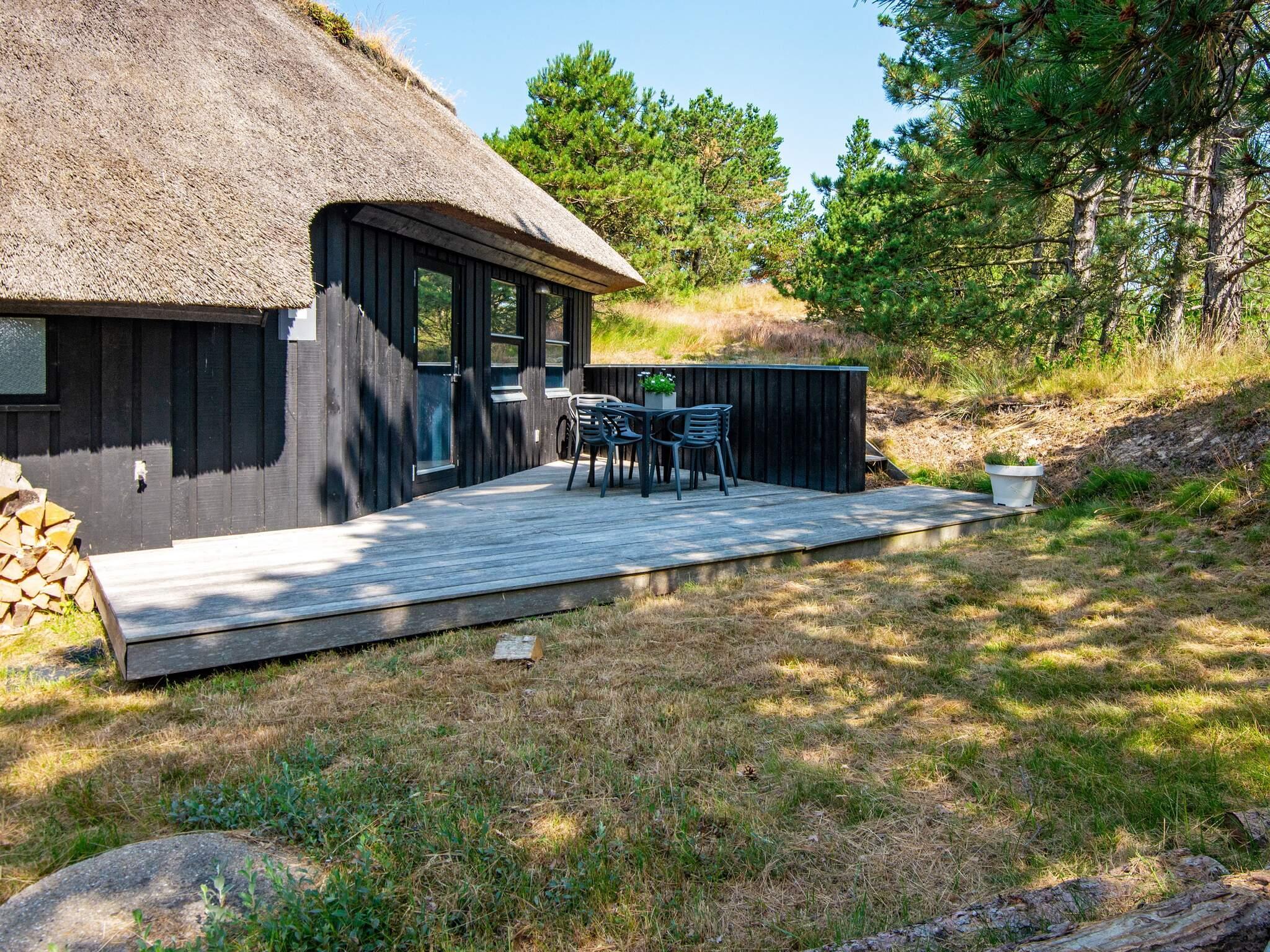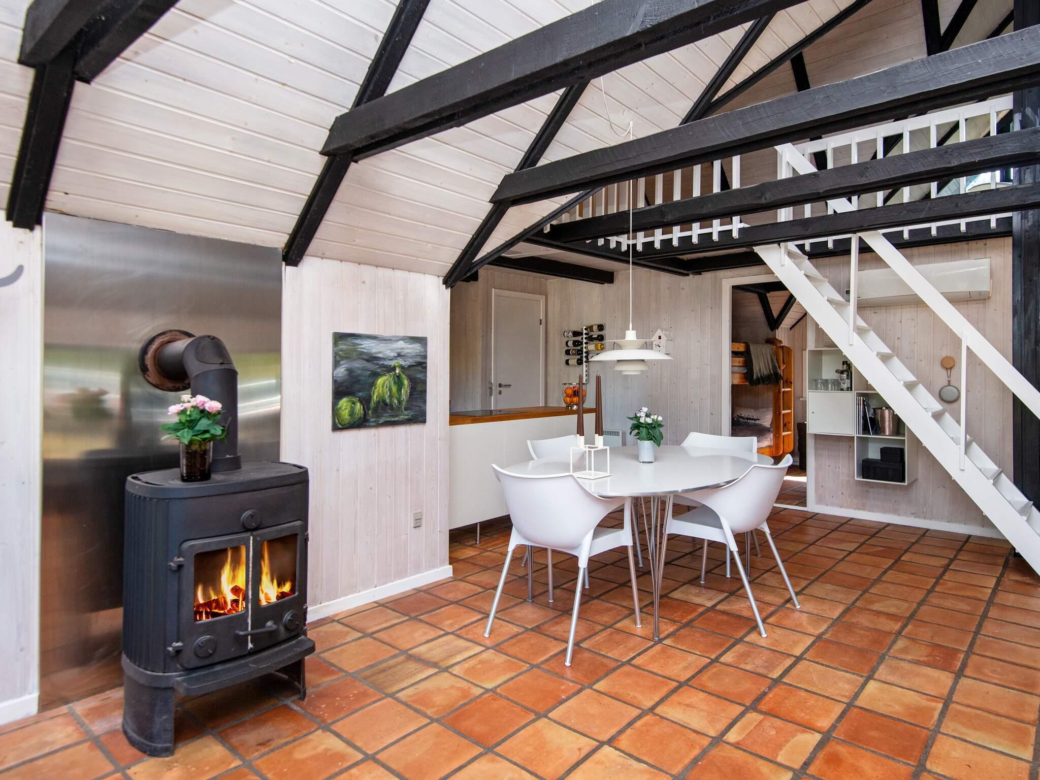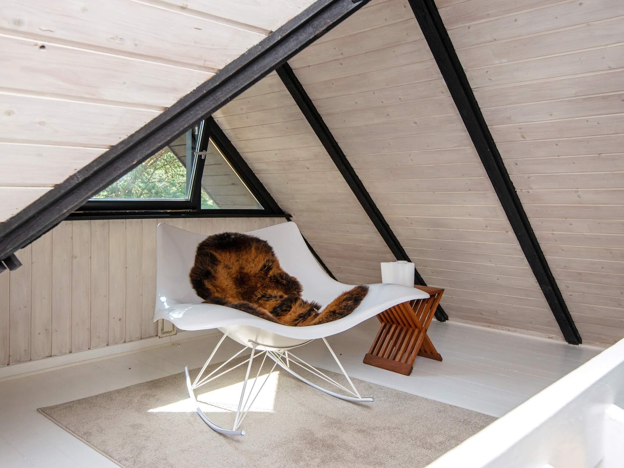 Huset er moderne indrettet med lofter til kip og stort, åbent køkken i direkte forbindelse med opholdsstuen, hvor der er brændeovn samt udgang til overdækket terrasse. Der er stort badeværelse med gulvvarme, spabad og sauna, to soveværelser med dobbeltsenge, et værelse med enkeltseng samt køjesenge og et gæstebadeværelse. Udlejes ikke til ungdomsgrupper.