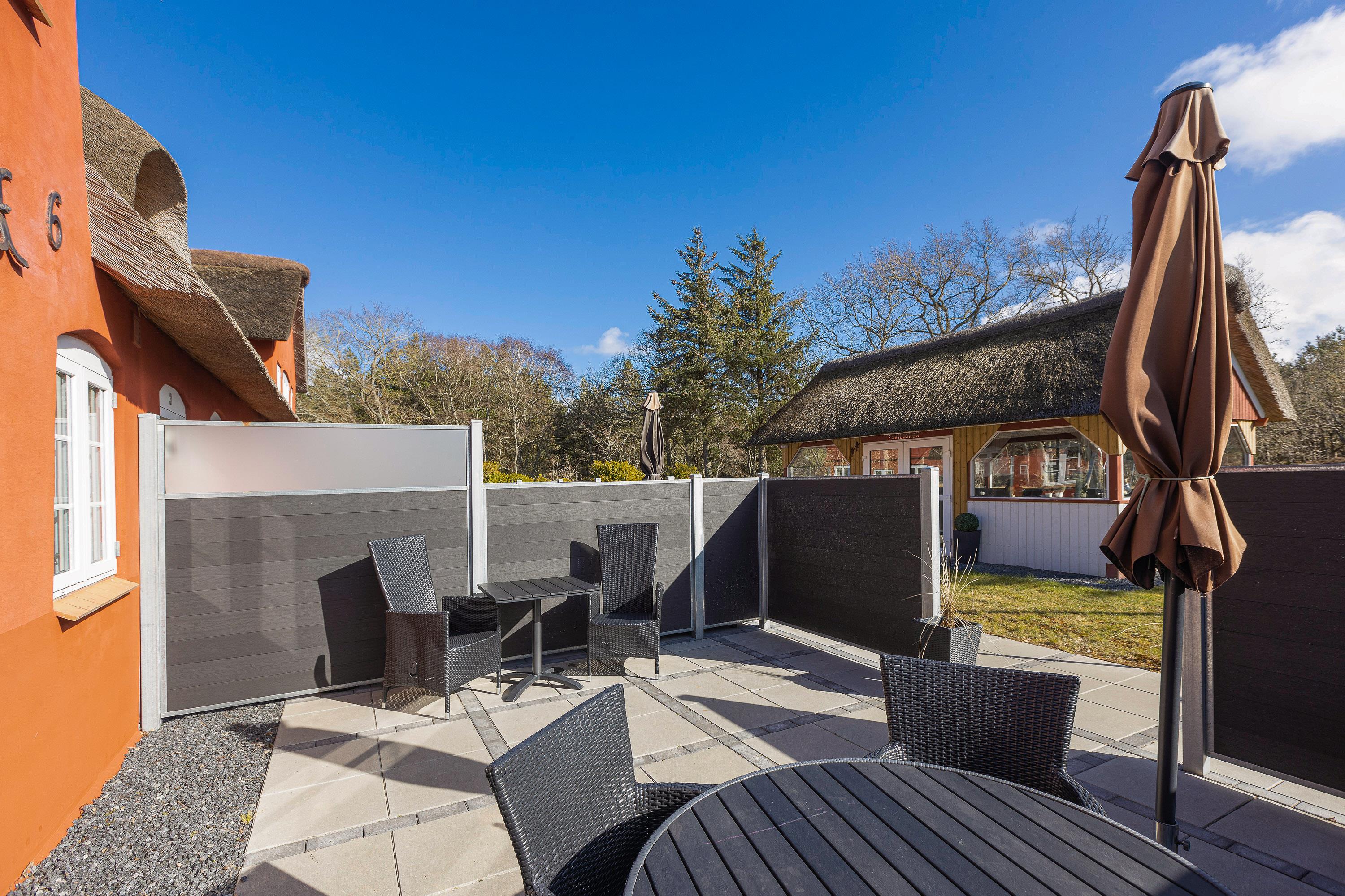 Ferielejligheden har 2 gode, afskærmede terrasser, hvor I kan nyde ferien med en kop kaffe og en god bog i hånden. Ferielejlighederne deler desuden en fin udestue med borde og stole, som I frit kan benytte jer af.