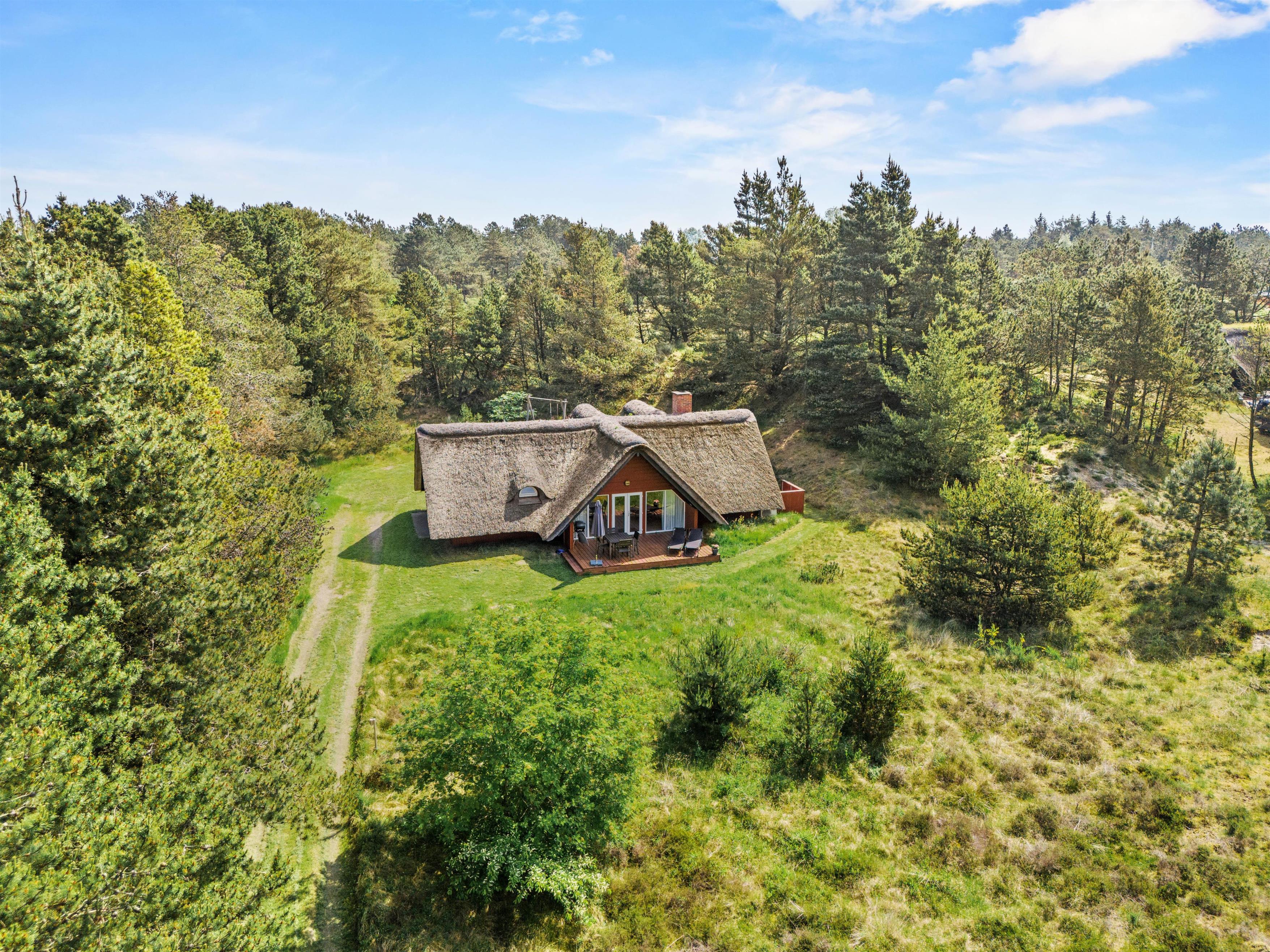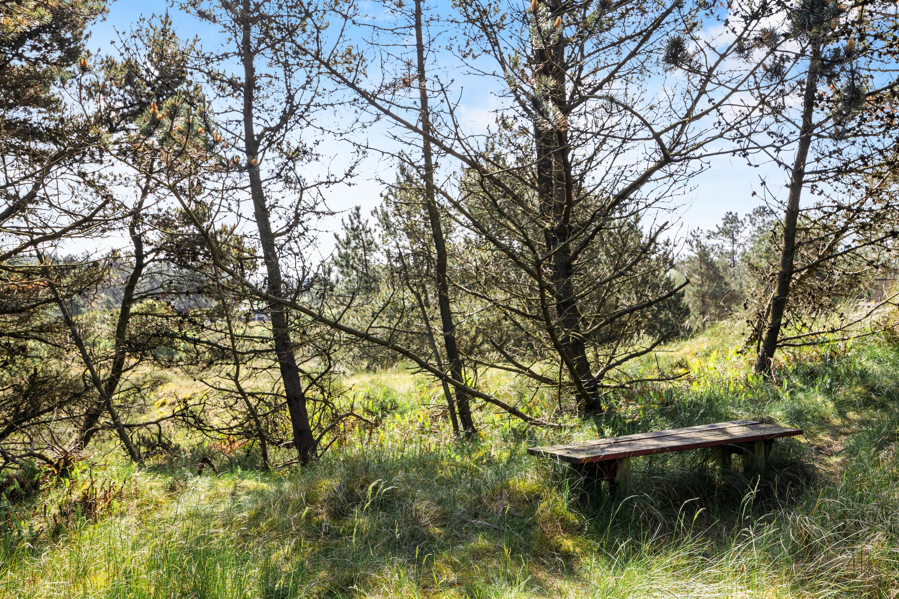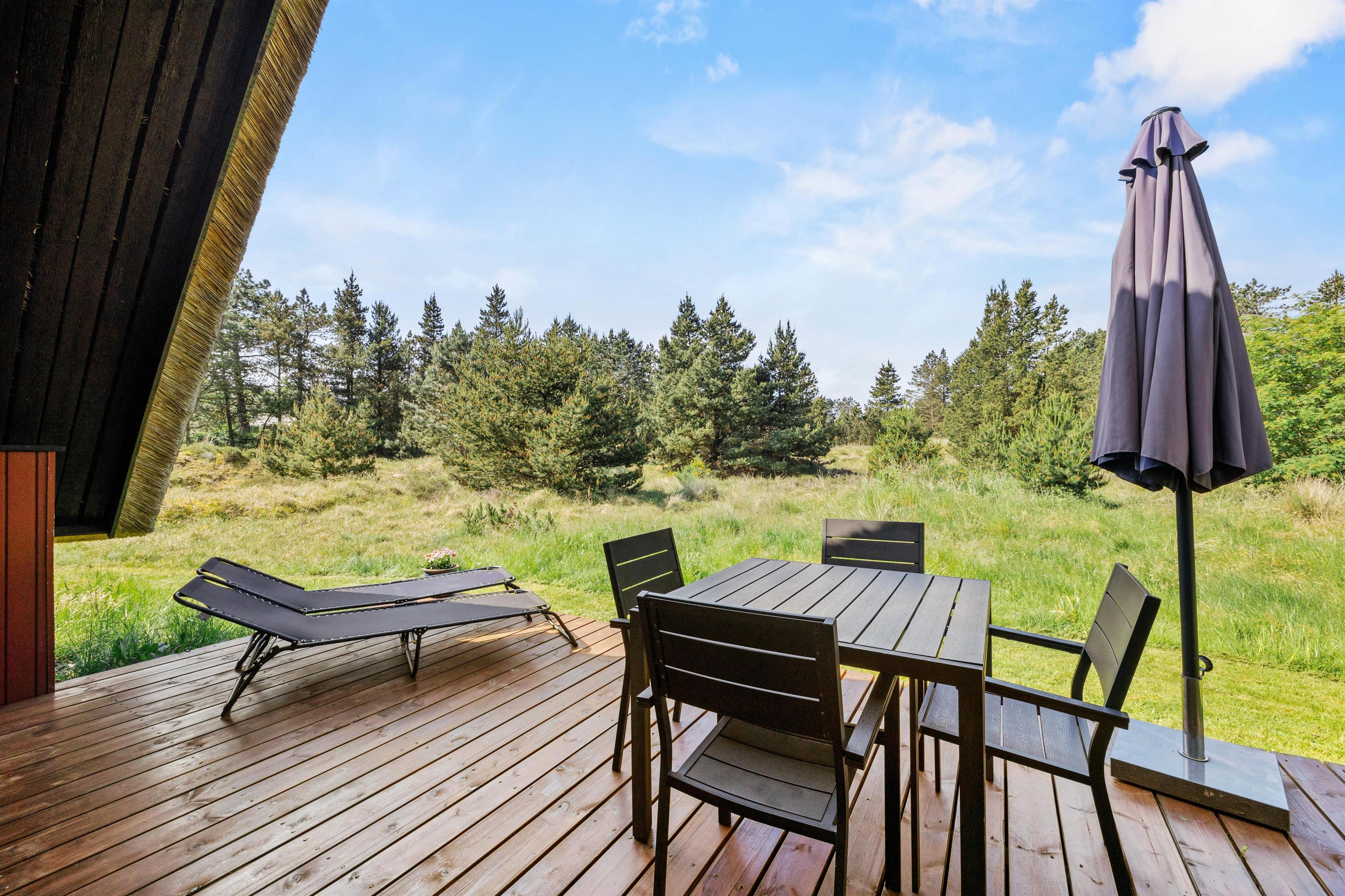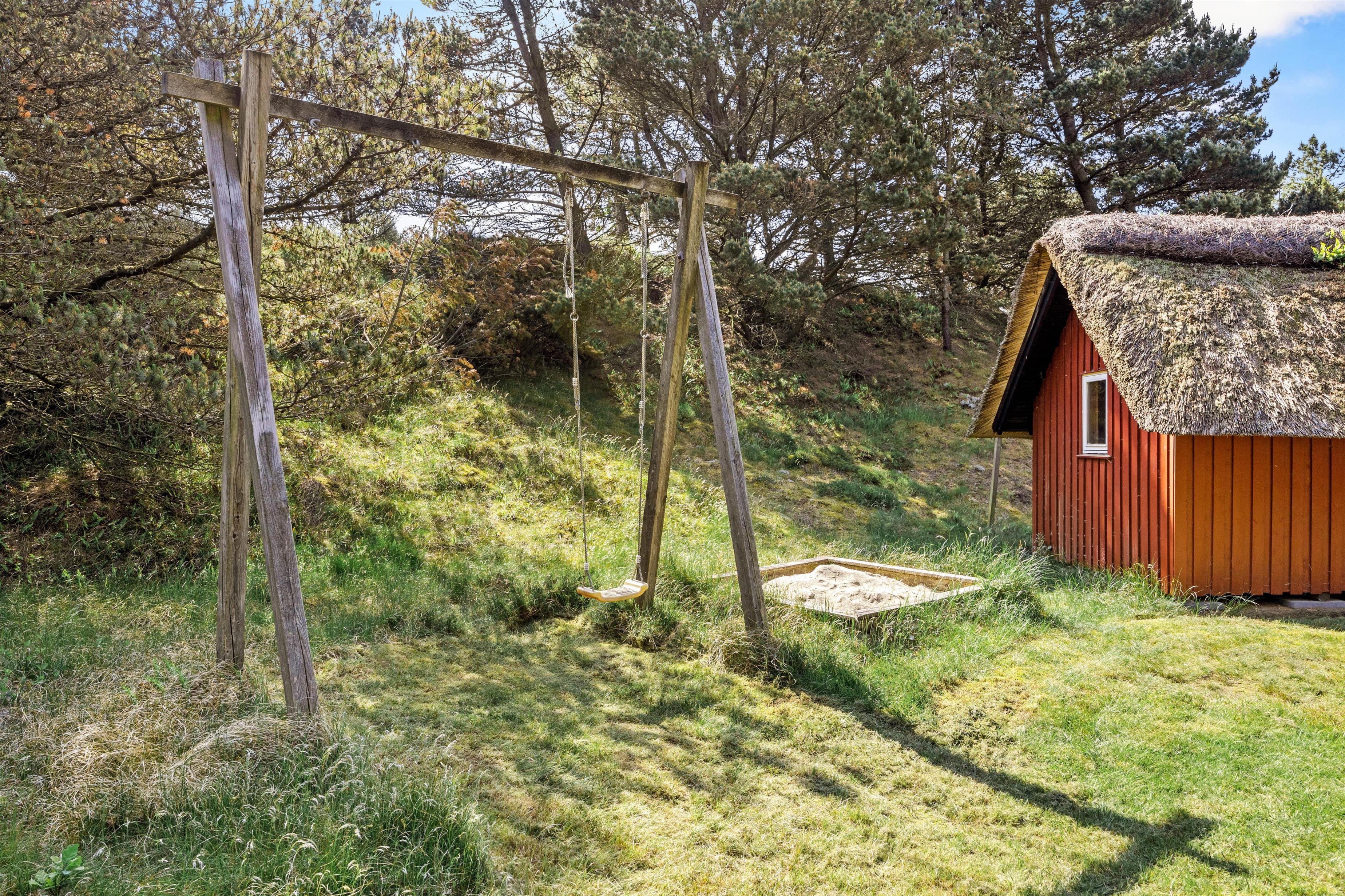 Sommerhuset er beliggende på en smuk naturgrund, hvor de omkringliggende klitter skærmer for den værste blæst. Mod sydvest er en dejlig træterrasse, der er delvist overdækket – her venter havemøblerne blot på jer! Nyd en god bog, solens varme og saml familien til en skøn grillaften. Til formålet har I en gasgrill, så I hurtigt kan få tændt op, mens børnene leger på den grønne plæne. Til familiens mindste finder I også en sandkasse samt gynge.