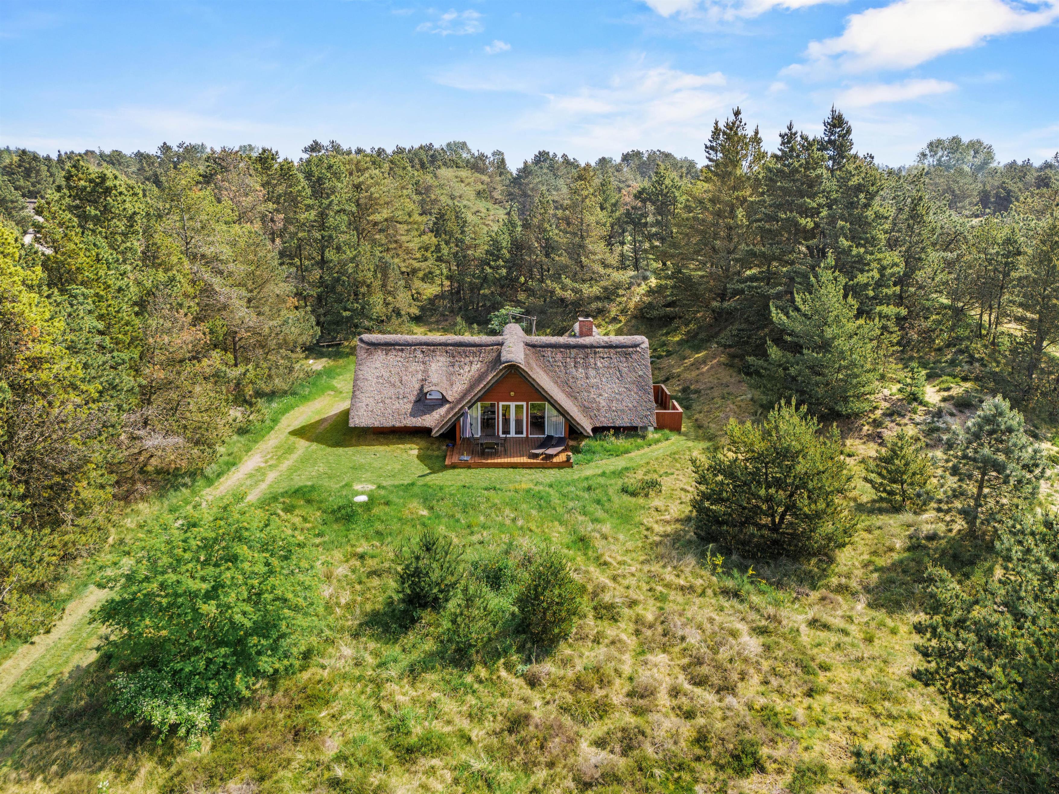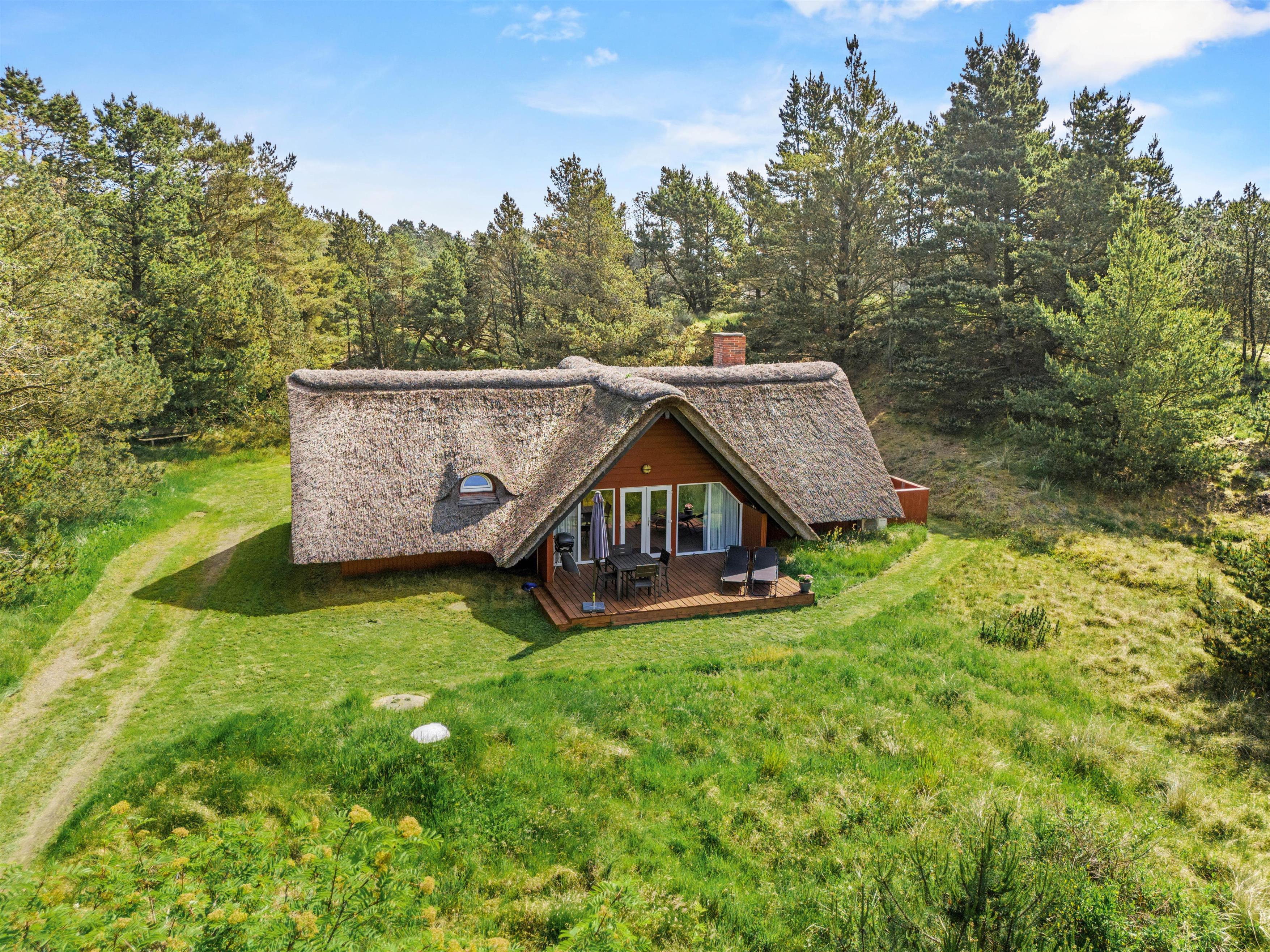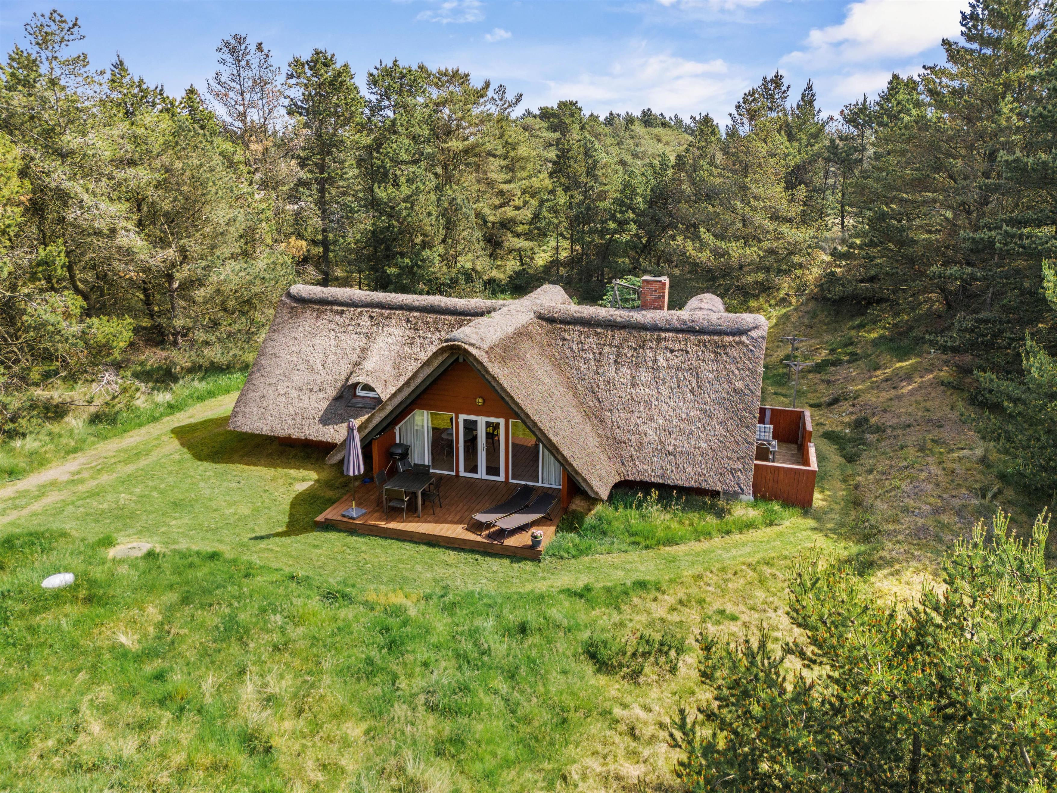 Sommerhuset er beliggende på en smuk naturgrund, hvor de omkringliggende klitter skærmer for den værste blæst. Mod sydvest er en dejlig træterrasse, der er delvist overdækket – her venter havemøblerne blot på jer! Nyd en god bog, solens varme og saml familien til en skøn grillaften. Til formålet har I en gasgrill, så I hurtigt kan få tændt op, mens børnene leger på den grønne plæne. Til familiens mindste finder I også en sandkasse samt gynge.