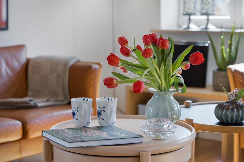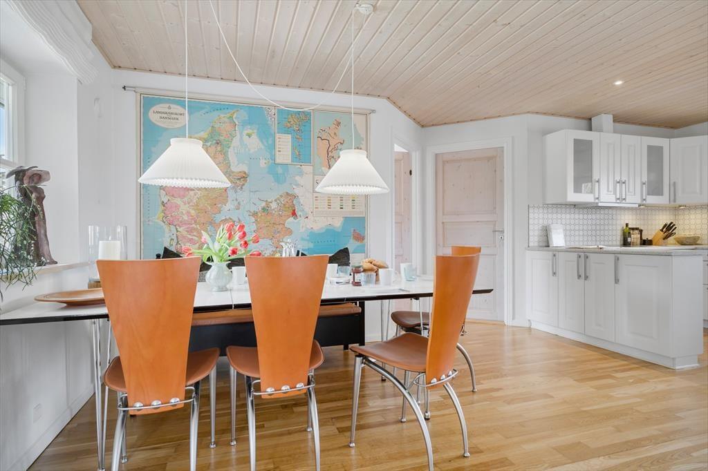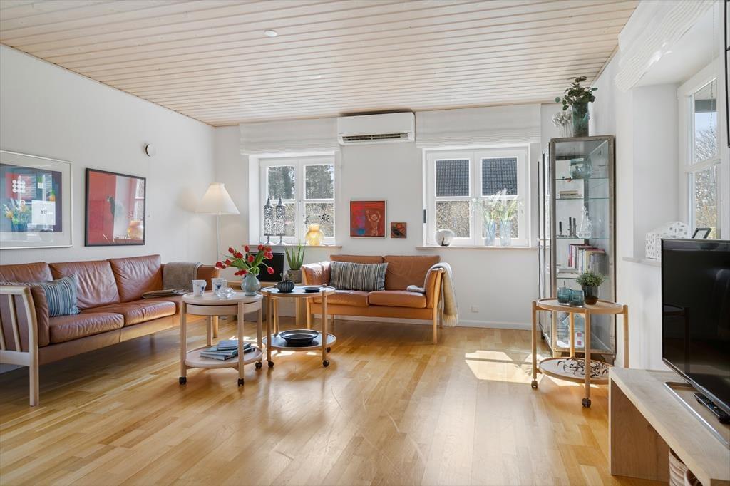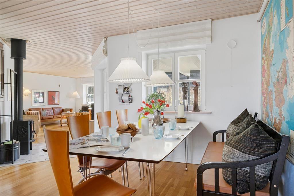 Stuen er også hyggeligt indrettet, her er både en brændeovn, hvor I kan tænde ekstra op for hyggen og varmen, når det er nødvendigt. I stuen er en god sofa og et TV, så her kan I slappe helt af efter en lang dag med oplevelser på Samsø. De lyse trælofter og store vinduer samt havedøren giver masser af lys ind i stuen, og I kan nyde udsigten ud i haven.