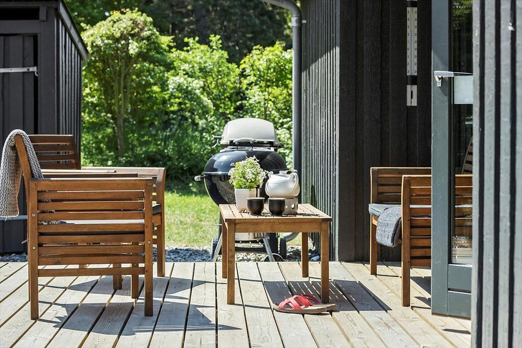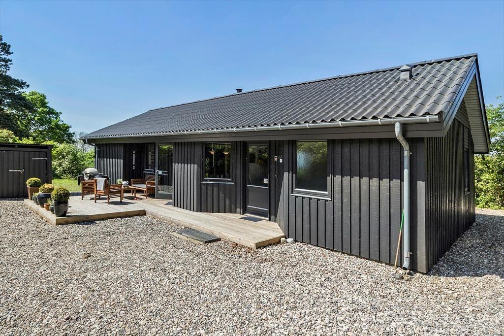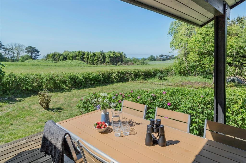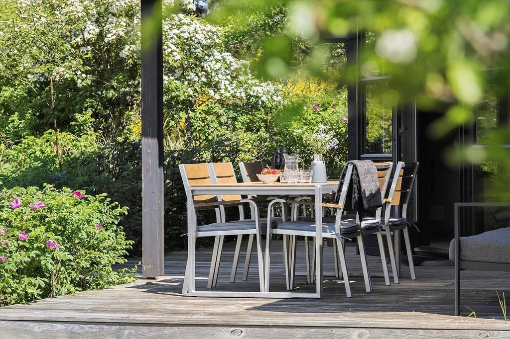Sommerhuset har to gode terrasser. Den østvendte terrasse er perfekt til at sætte sig og nyde morgenkaffen, og her er dejligt læ. Den anden terrasse er overdækket og vestvendt med direkte udgang fra stuen. Det er perfekt at tage sine måltider med herud og nyde solnedgangen eller blot slappe havemøblerne.