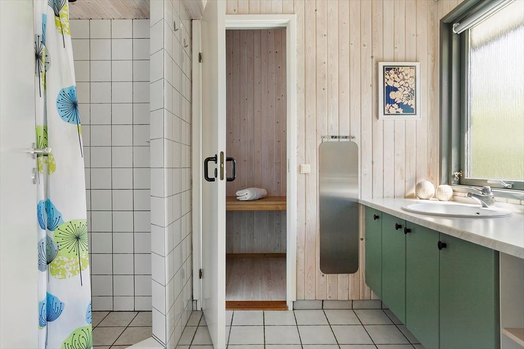 Badeværelset fremstår også lyst og indbydende, Badeværelset har sauna samt gode badefaciliteter. Rammerne for en god ferie ved Samsøs sydlige vestkyst er sikret i dette dejlige sommerhus.