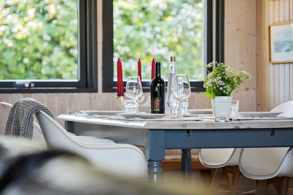 Det åbne køkken er i forlængelse med spisebordspladsen, så det er let både at lave mad og sidde ved bordet, mens I stadig tilbringer tid sammen. De store gulv til loft vinduer i stuen byder masser af dagslys indenfor, og I kan nyde udsigten til de grønne omgivelser. Fra terrassedørene kan I gå direkte ud på den overdækkede terrasse, så når vejret er godt, bliver terrassen som en forlængelse af stuen, og her bliver udsigten kun endnu bedre. Mellem spisebordspladsen og sofaerne er en brændeovn, så her kan I let tænde ekstra op for sommerhushyggen og varmen, når det bliver koldere.