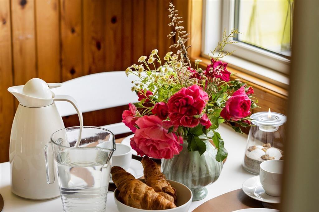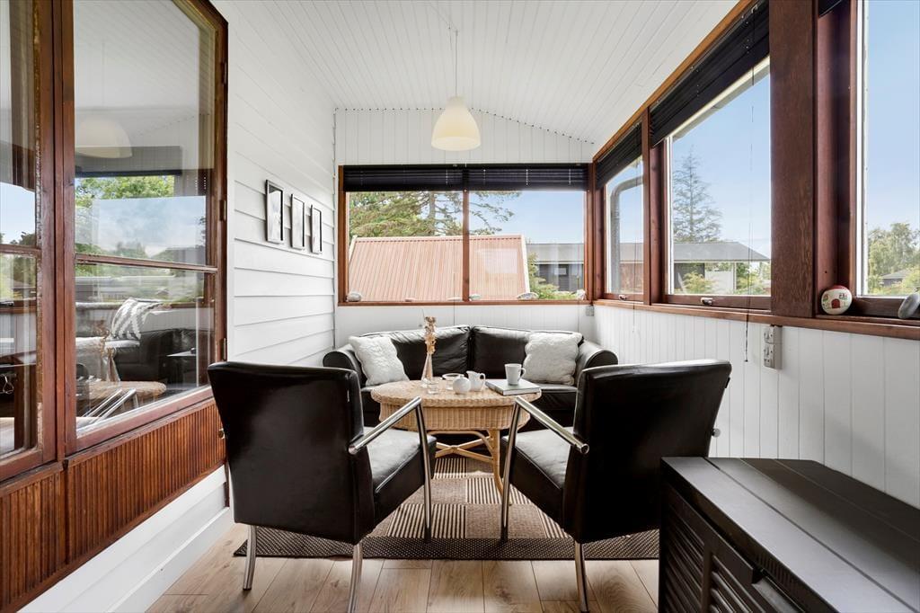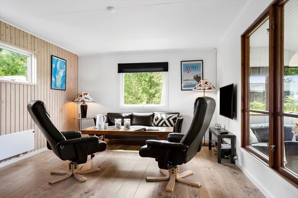 Stuen er indrettet med bløde møbler, så I kan sætte jer godt til rette her og slappe af efter en dag med oplevelser på Samsø, eller se en god film sammen. I forlængelse af stuen er en udestue, hvor de store vinduer giver et dejligt lysindfald og udsigt over omgivelserne og markerne mod nord-vest. Her kan I tilbringe mange timer sammen, og selv hvis vejret ikke er godt, giver udestuen mulighed for at slappe af med masser af lys og udsigt. Fra udestuen er der også en terrassedør med direkte udgang til haven.