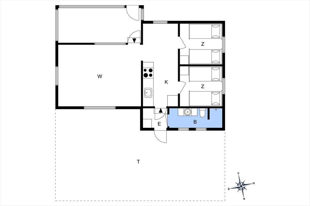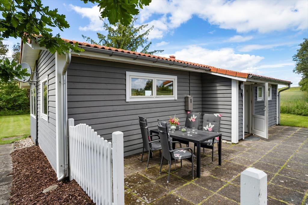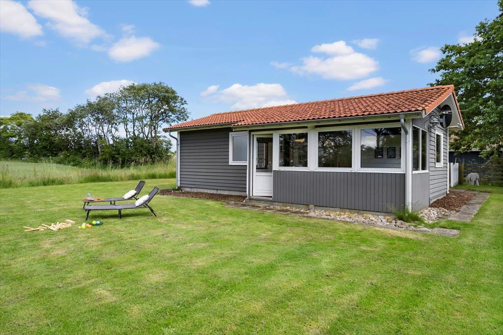 Sommerhuset har en god østvendt fliseterrasse. Her er der ofte læ, og det er perfekt at nyde sin morgenkaffe her eller solen i løbet af dagen. Haven er vestvendt, og her kan man let gå ud fra udestuen. Find jer godt til rette i solstolene eller spil et spil sammen på den store græsplæne.