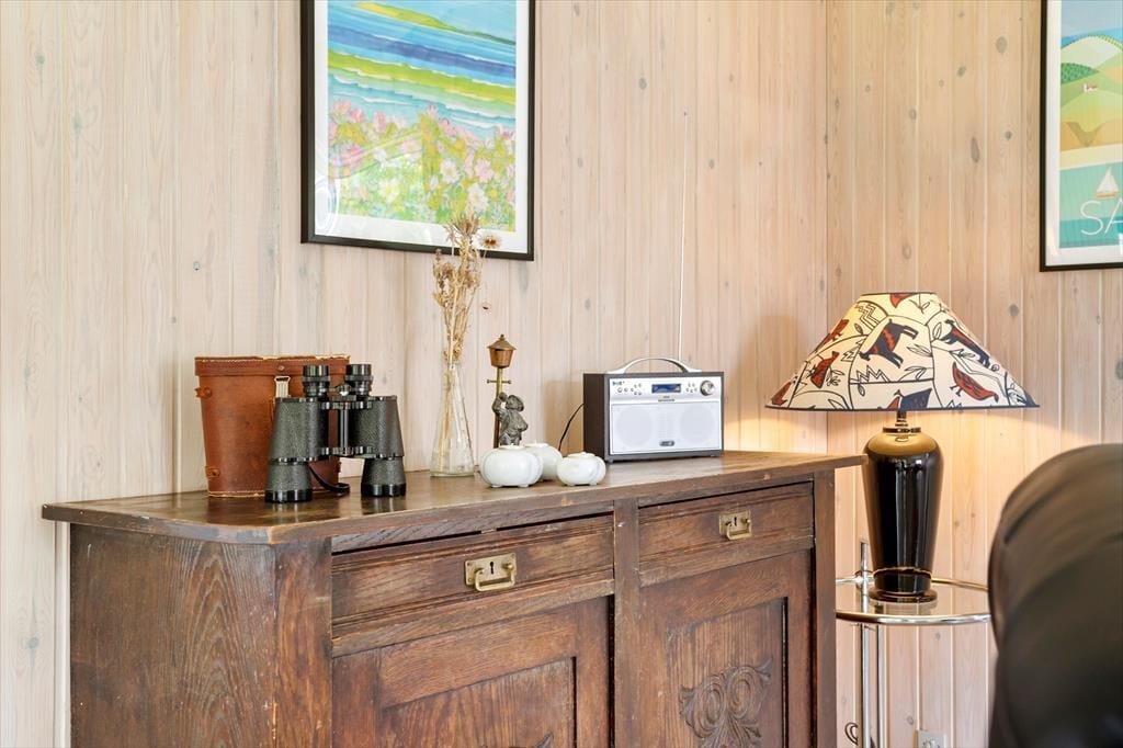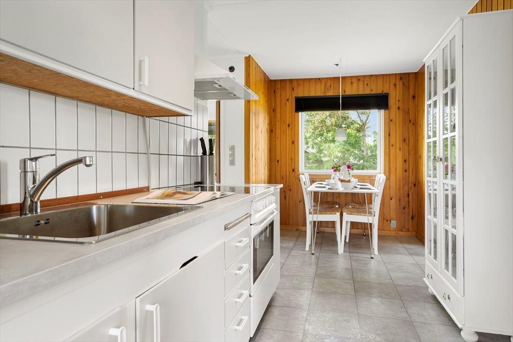 Sommerhuset byder først på et fint og funktionelt køkken, hvor spisebordspladsen er i forlængelse heraf. Ved bordet er et vindue, hvor I har udsigt til haven, når I spiser feriens måltider. Køkkenet er lyst og funktionelt, men den klassiske sommerhusstemning er bevaret.