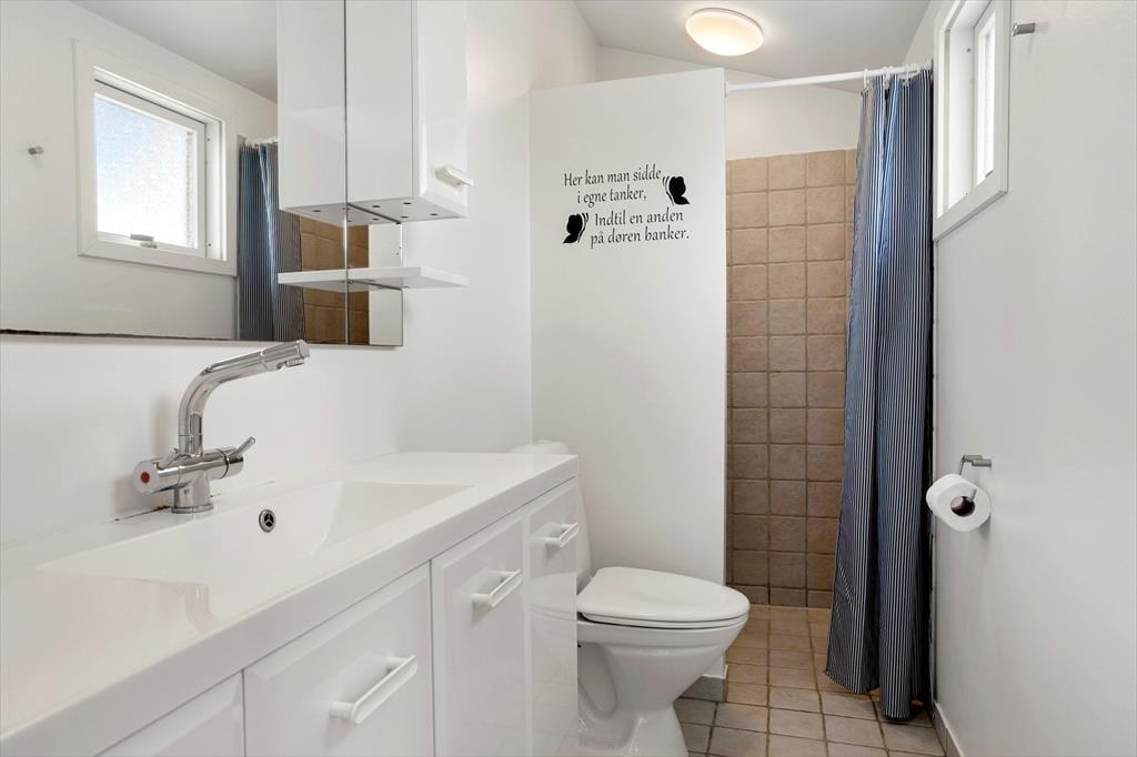 Ved entréen er sommerhusets badeværelse, der som resten af huset er lyst og indbydende med en god brusekabine.
