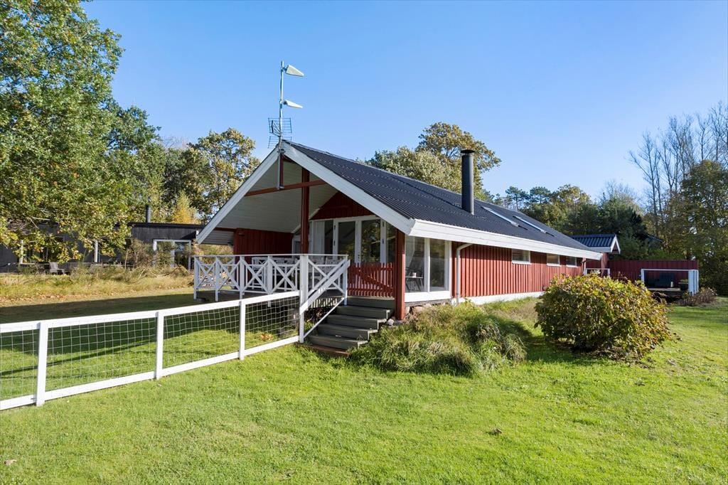Sommerhuset ligger på en stor, aflukket grund omkranset af træer og buske, som gør det muligt at nyde udelivet ugeneret. På græsset er der god plads til leg, og af og til kommer en hare forbi. Terrassen, der vender mod sydvest, er delvist overdækket og tilbyder fremragende udsigt over området. Her er både havemøbler og en grill, så måltiderne kan nydes udendørs. Der er desuden gode parkeringsmuligheder ved huset.