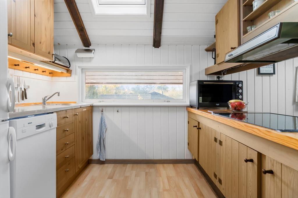 Køkkenet er veludstyret med gode faciliteter til at tilberede feriens måltider. I forlængelse af køkkenet ligger spiseområdet lidt afsides fra resten af stuen. Her er det lyst og indbydende med store vinduer, der giver udsigt til terrassen og haven.