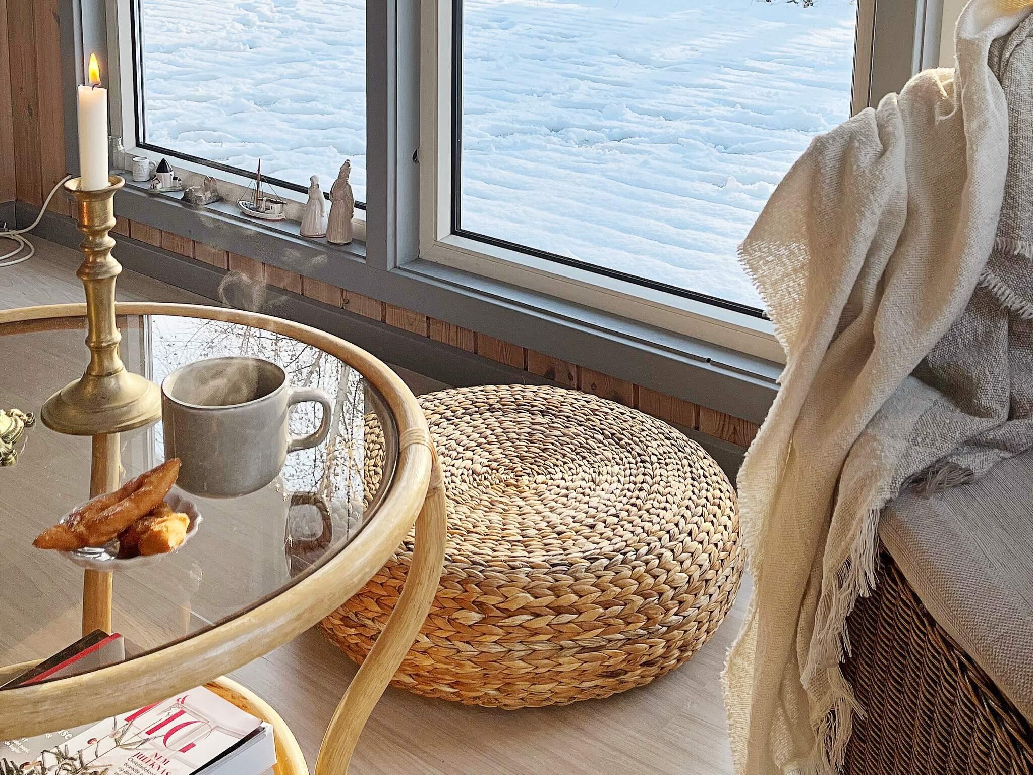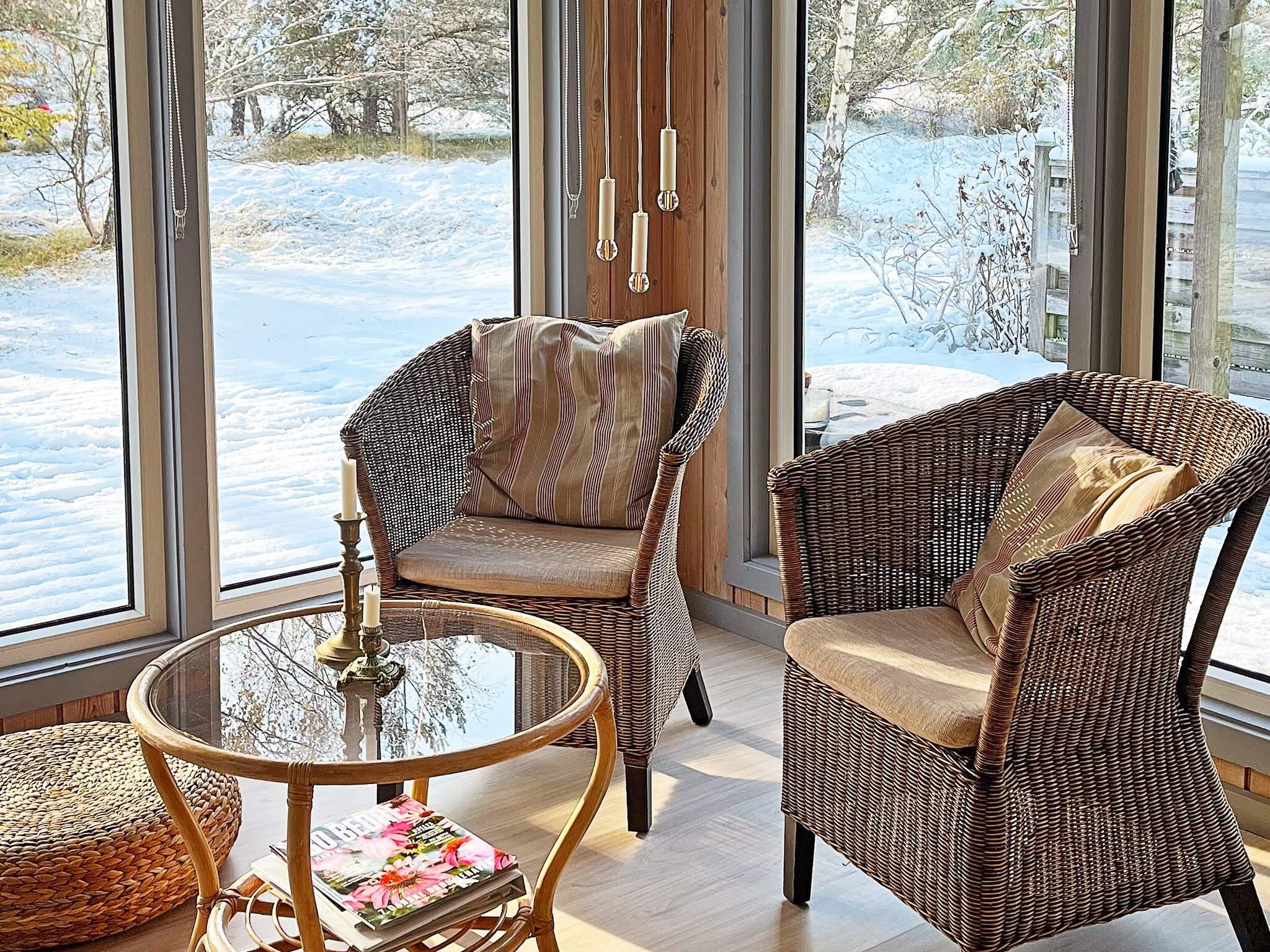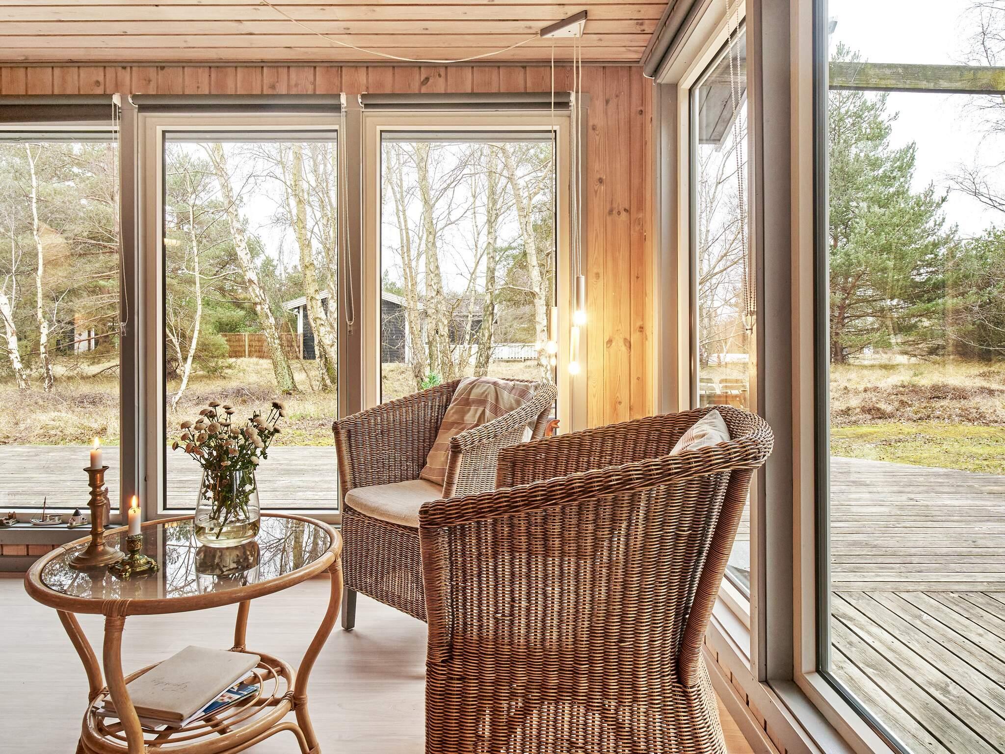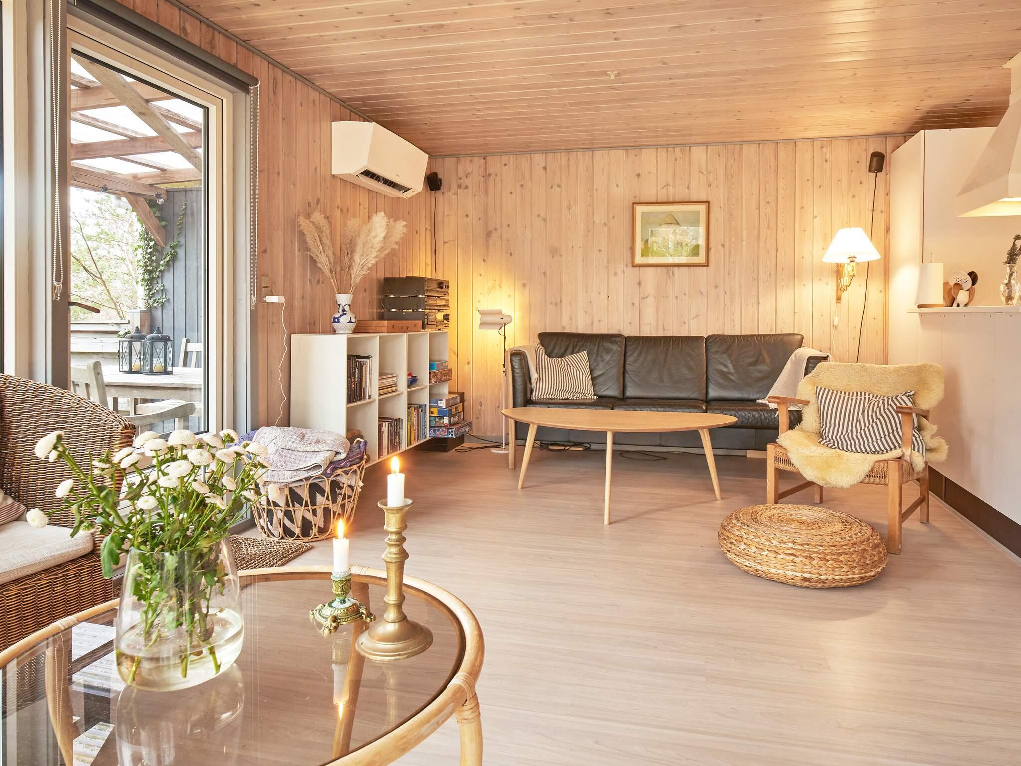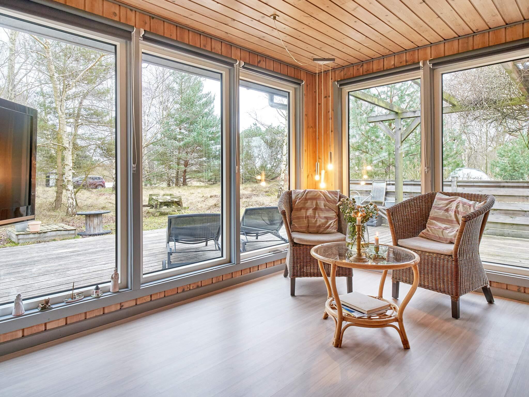 Huset har en rummelig stue og spisestue med åbent køkken, perfekt til samvær og familietid. Store glaspaneler fylder det centrale opholdsrum med naturligt lys og skaber en lys og indbydende atmosfære. Der er to soveværelser, begge med dobbeltseng. Underholdning omfatter satellit-tv og Chromecast-adgang til streaming af dit yndlingsindhold.
